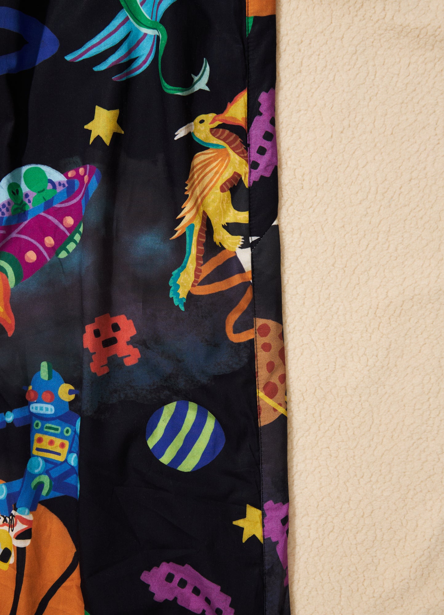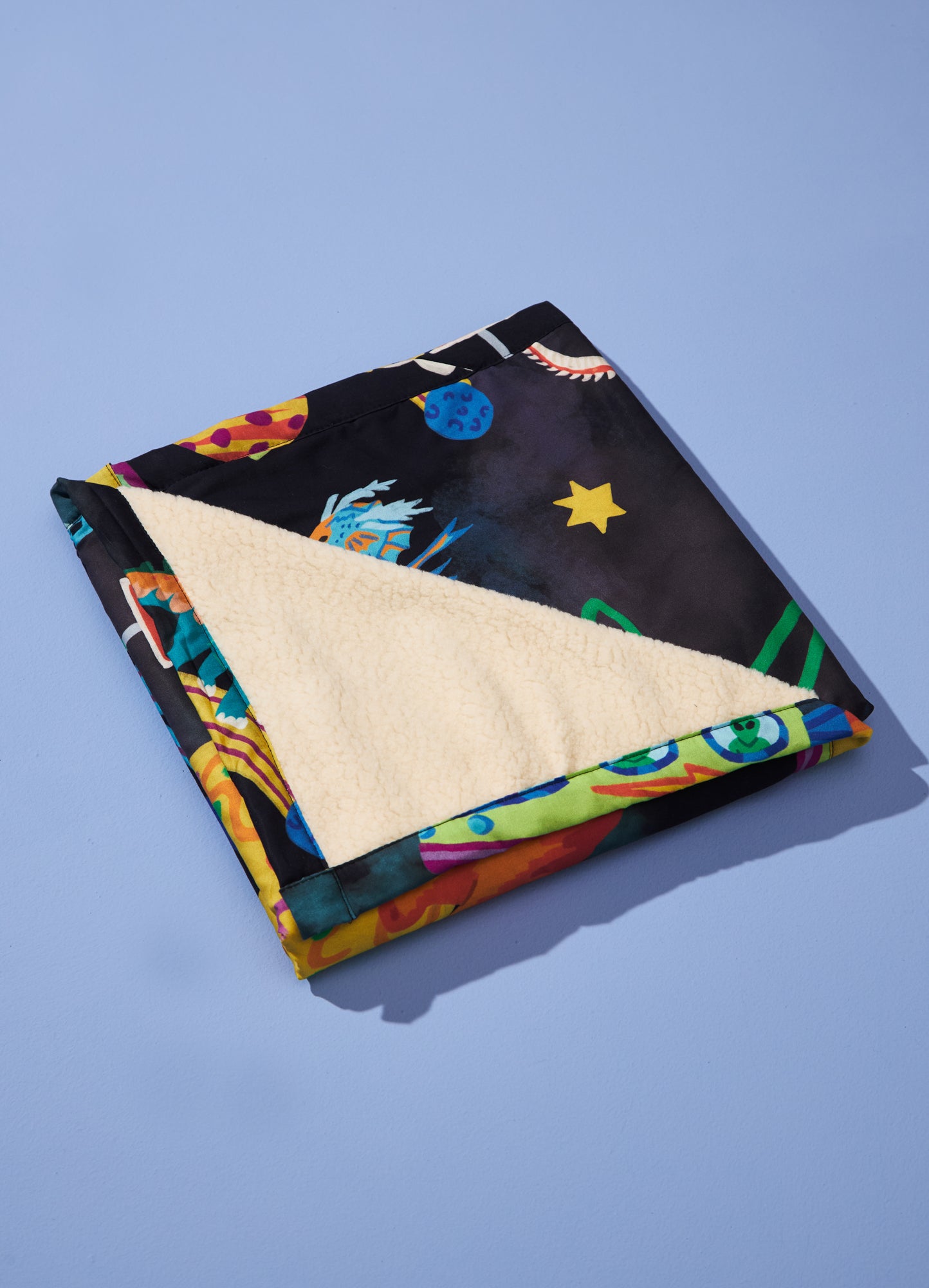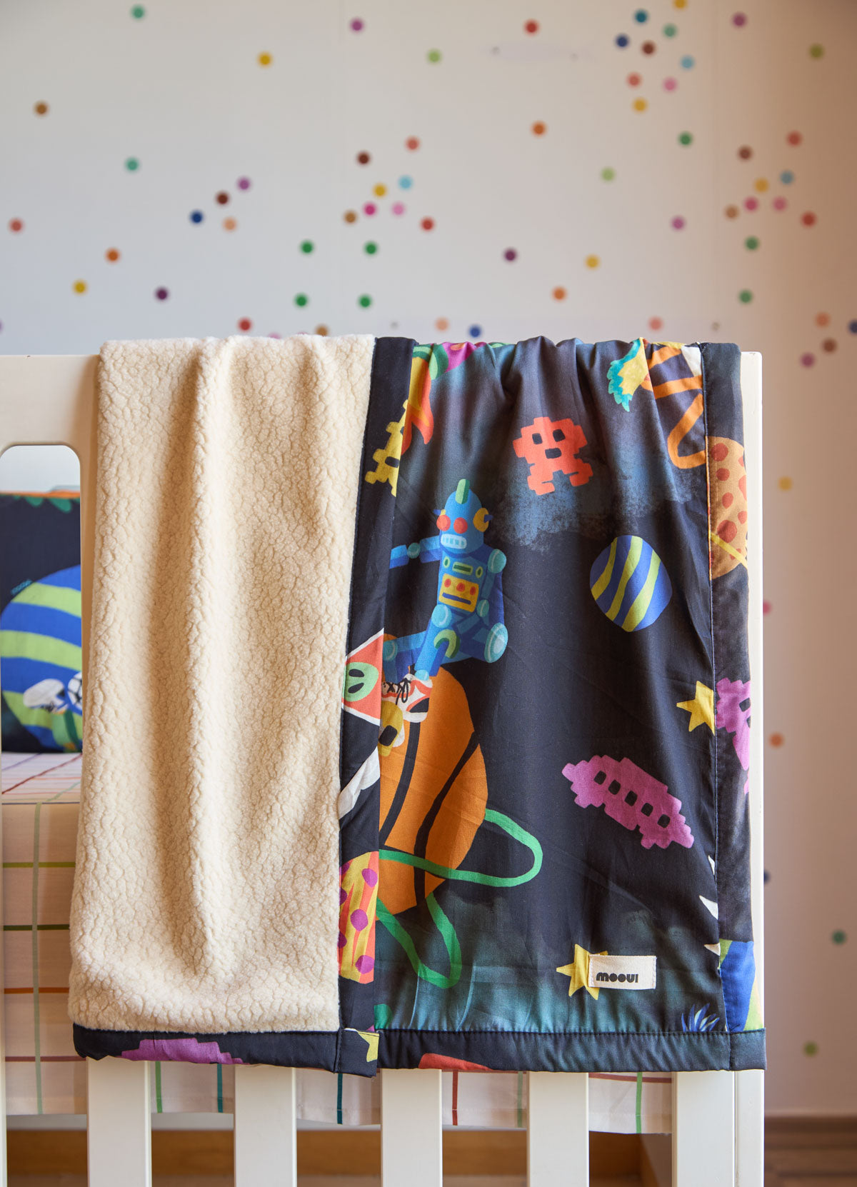 O Cobertor Carneirinho Bebê Aventura Cósmica Preto da MOOUI é sinônimo de aconchego e conforto térmico para bebês e crianças. Com duas faces complementares - uma em tecido carneirinho ultra macio e outra em algodão 230 fios com estampa exclusiva MOOUI.