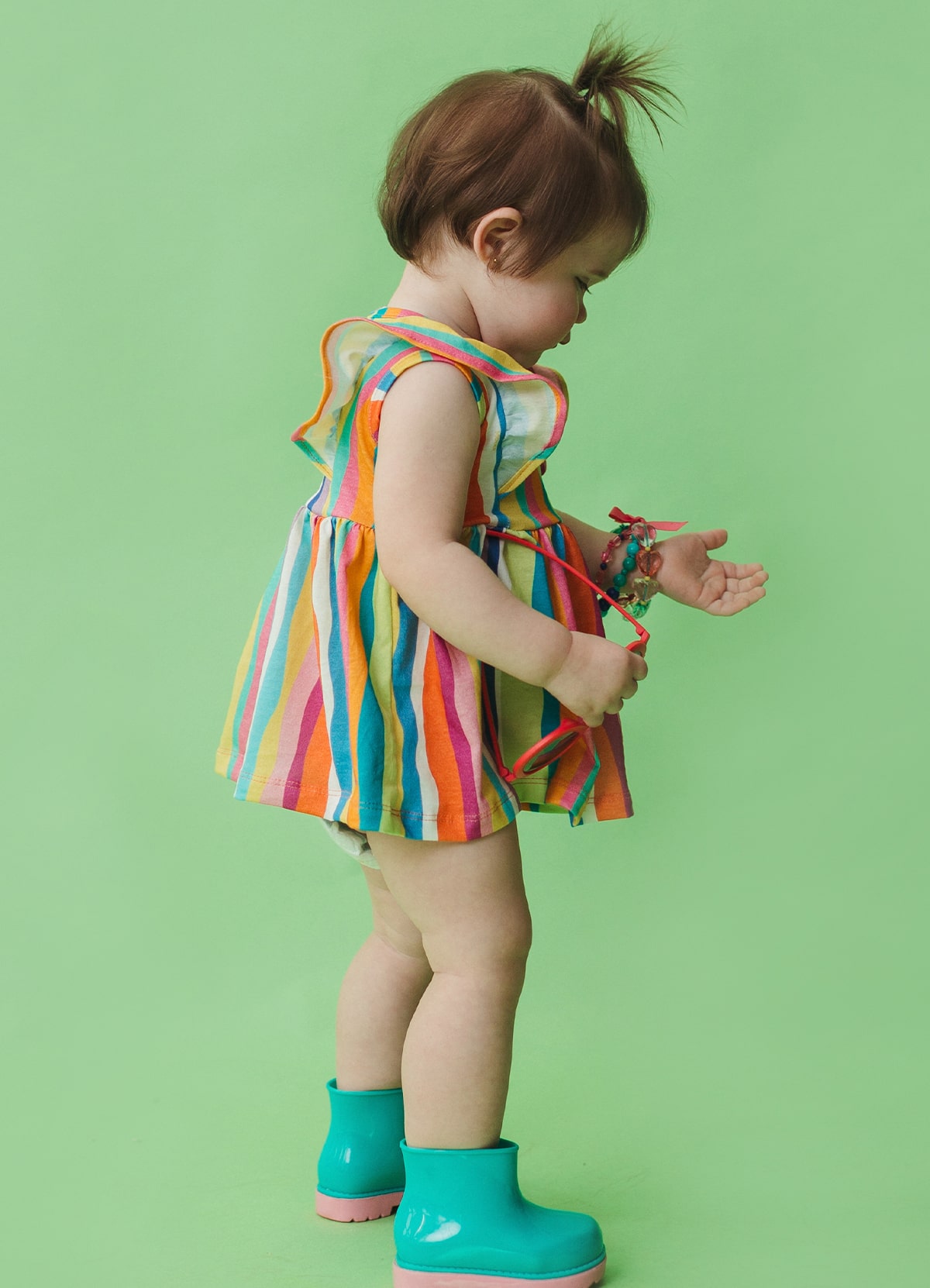 O Vestido para Bebê Olha a Onda é a escolha ideal para uma combinação de conforto e estilo. Com um comprimento curto, o vestido apresenta delicados babados nas mangas e uma saia rodada que adiciona movimento e charme. A estampa listrada inspirada no mar traz um visual alegre e refrescante, perfeito para dias ensolarados e passeios. Feito em tecido leve e suave, o vestido garante conforto o dia todo, enquanto o design encantador torna a peça perfeita para qualquer ocasião especial ou para o dia a dia.