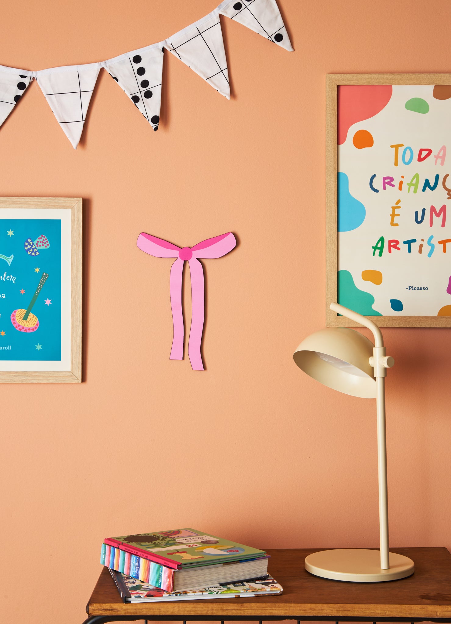 O adorno de parede Lacinho Rosa tem o toque de charme perfeito para enfeitar as paredes dos quartos infantis, porque permite combinações super autênticas com outras estampas de adorno, varais e pôsteres da MOOUI. Esse adorno para decoração de parede é fabricado em MDF e possui o desenho exclusivo MOOUI impresso em alta definição. Para facilitar na hora de fixar na parede, enviamos o adorno com fita dupla face para você.