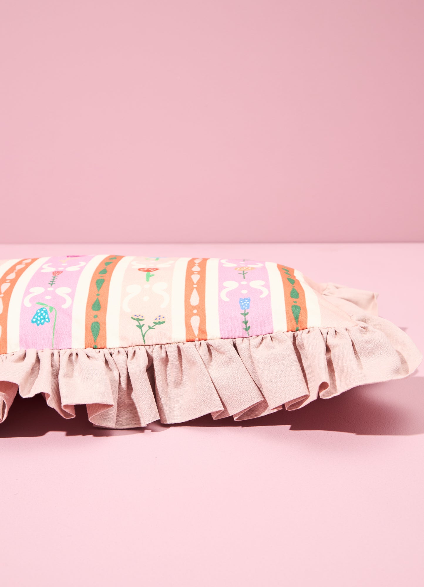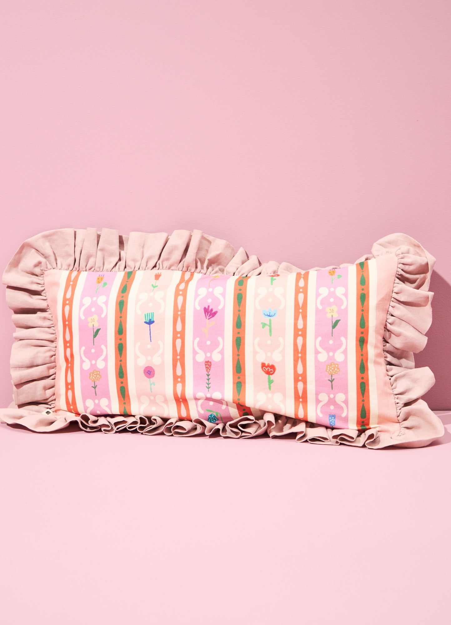 A Almofada Floral Listrado é aquele detalhe especial que transforma qualquer ambiente com delicadeza e personalidade. Confeccionada em sarja de algodão com babado de 7 cm em tecido de linho, ela traz elegância e leveza para composições infantis ou de outros cômodos da casa.
