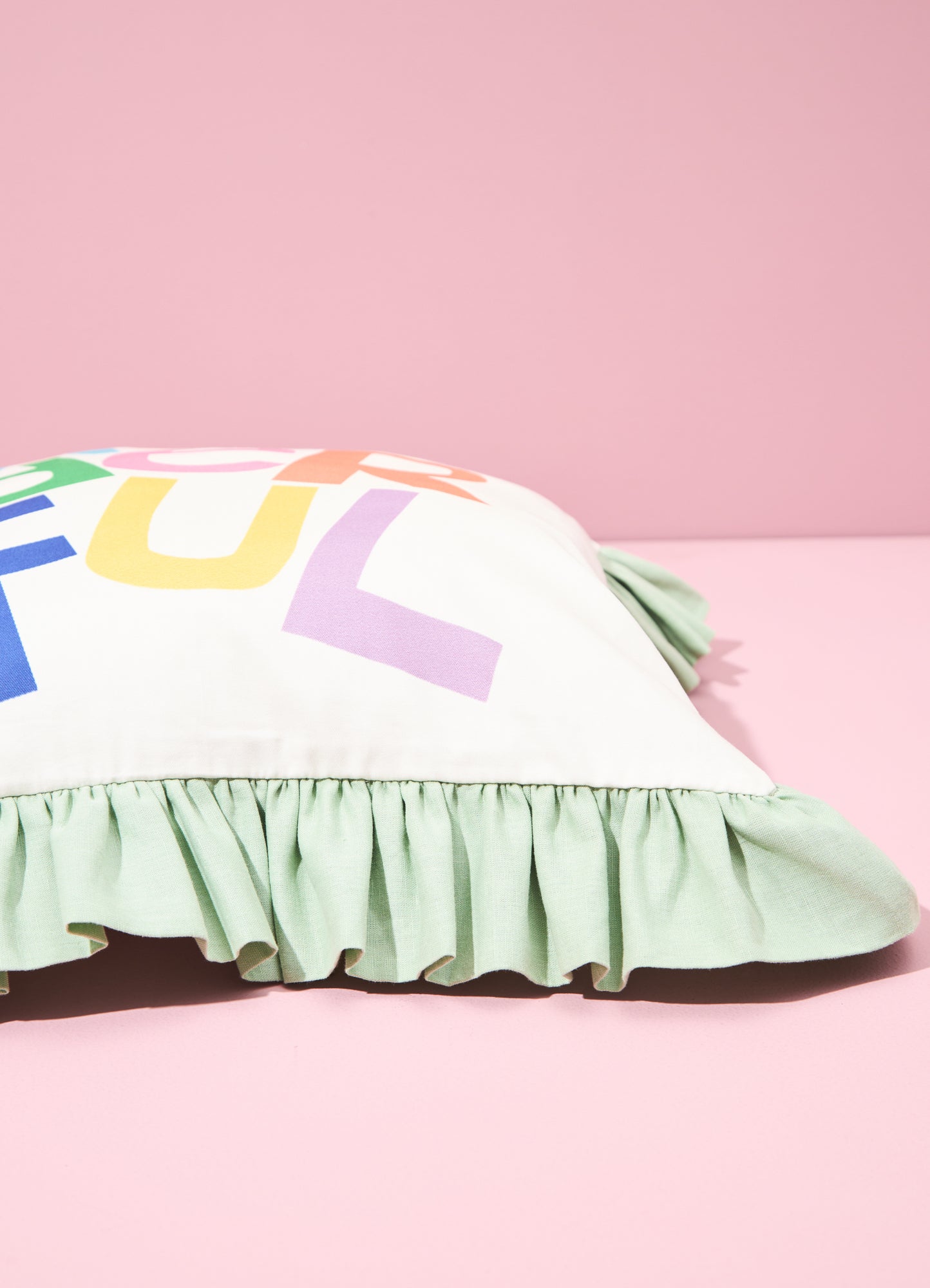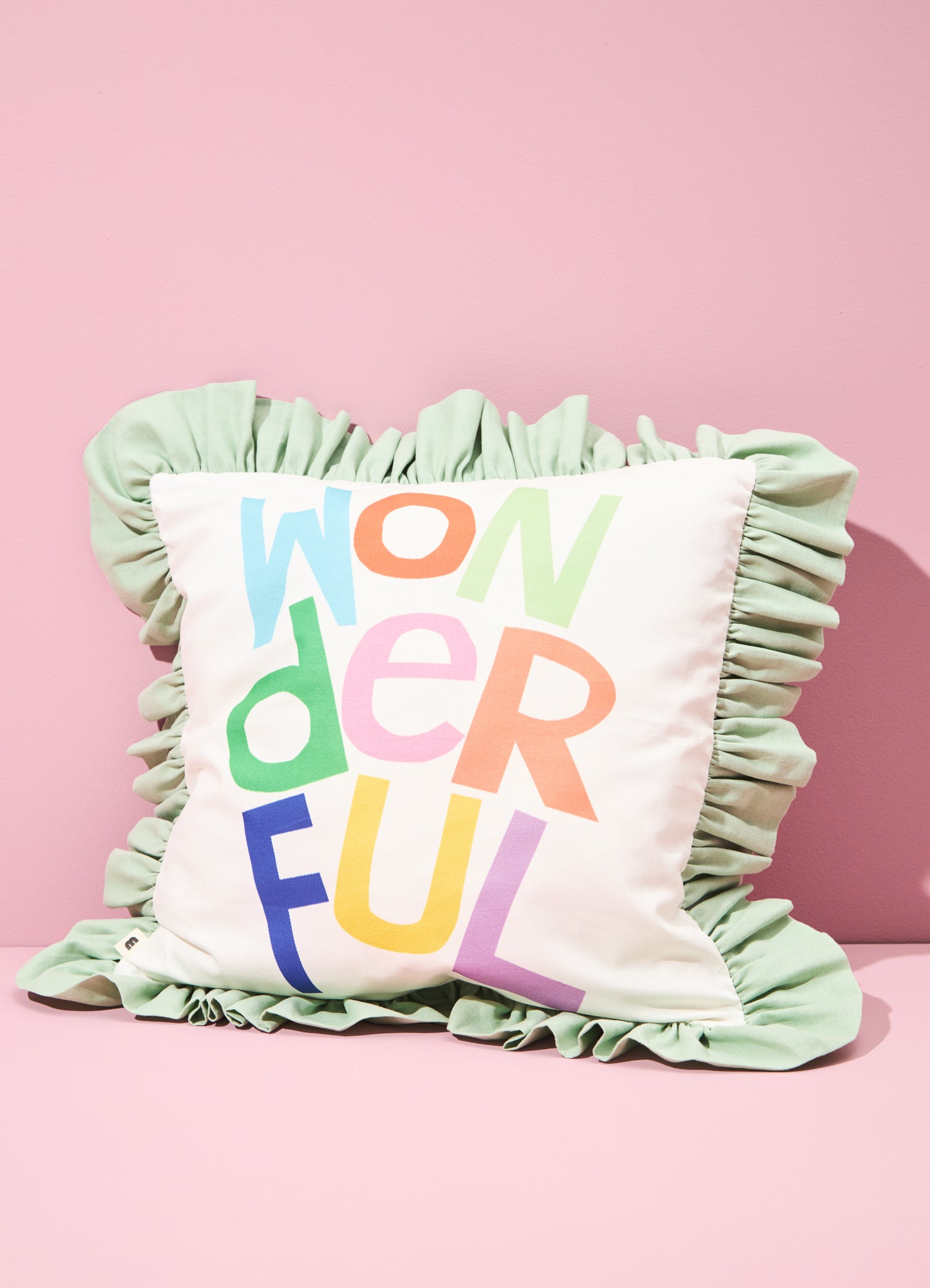 A Almofada Wonderful é aquele detalhe especial que transforma qualquer ambiente com delicadeza e personalidade. Confeccionada em sarja de algodão com babado de 11 cm em tecido de linho, ela traz elegância e leveza para composições infantis ou de outros cômodos da casa.