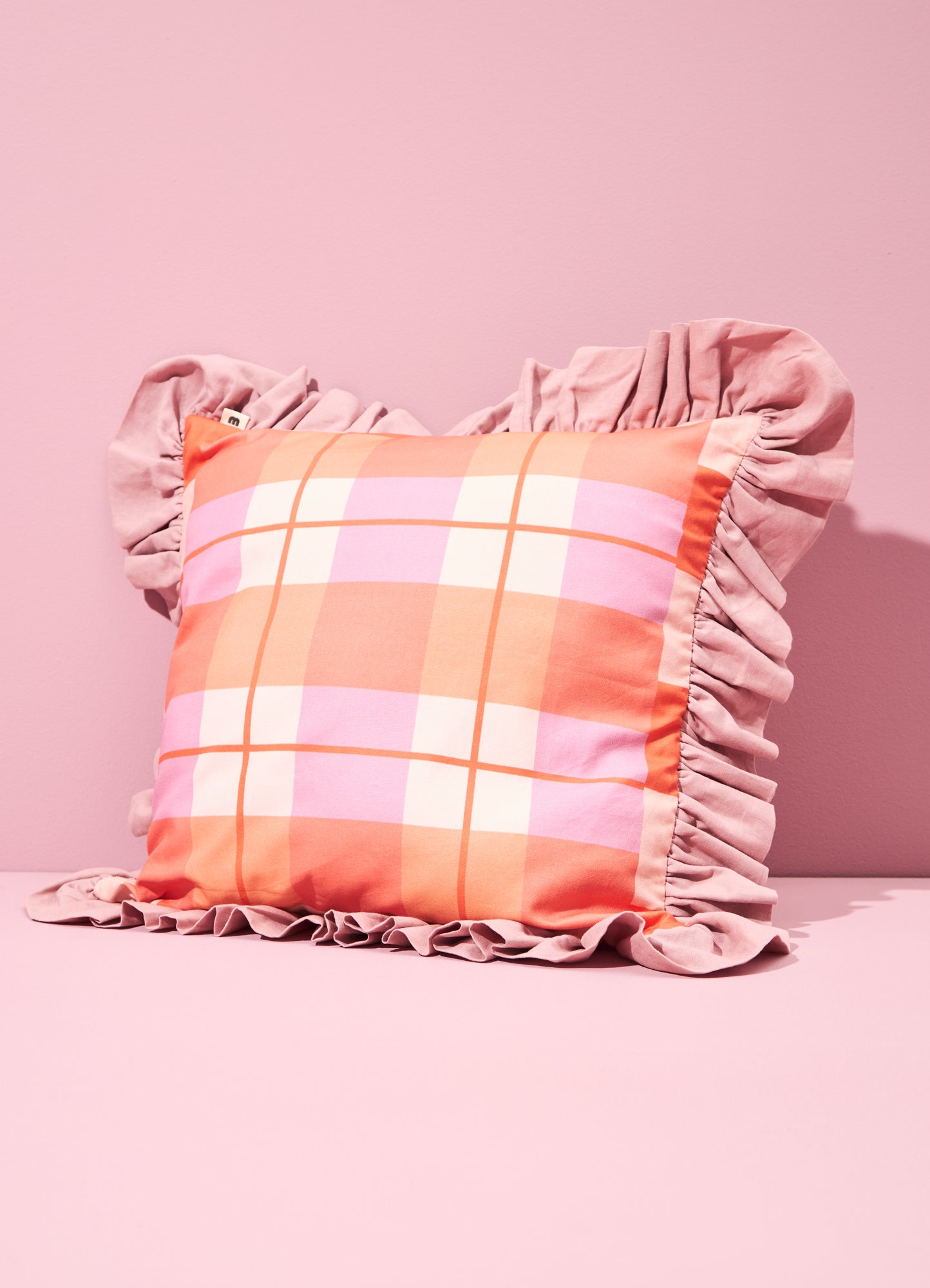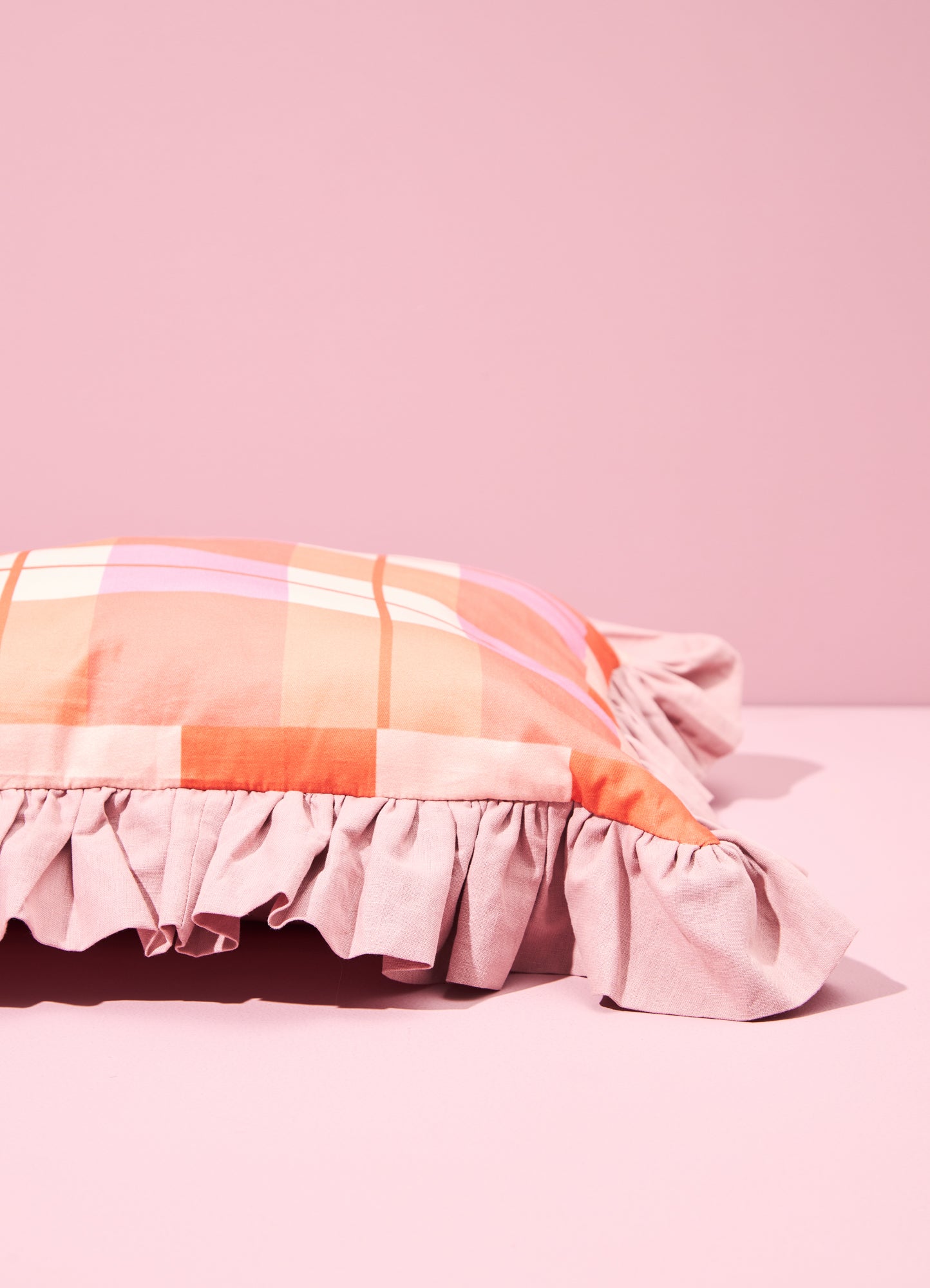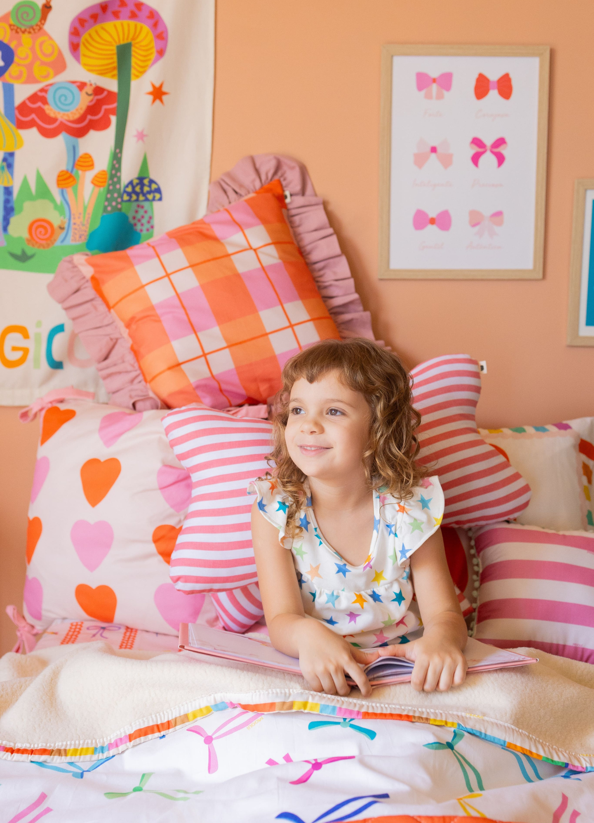 A Almofada Xadrez Amor é aquele detalhe especial que transforma qualquer ambiente com delicadeza e personalidade. Confeccionada em sarja de algodão com babado de 7 cm em tecido de linho, ela traz elegância e leveza para composições infantis ou de outros cômodos da casa.