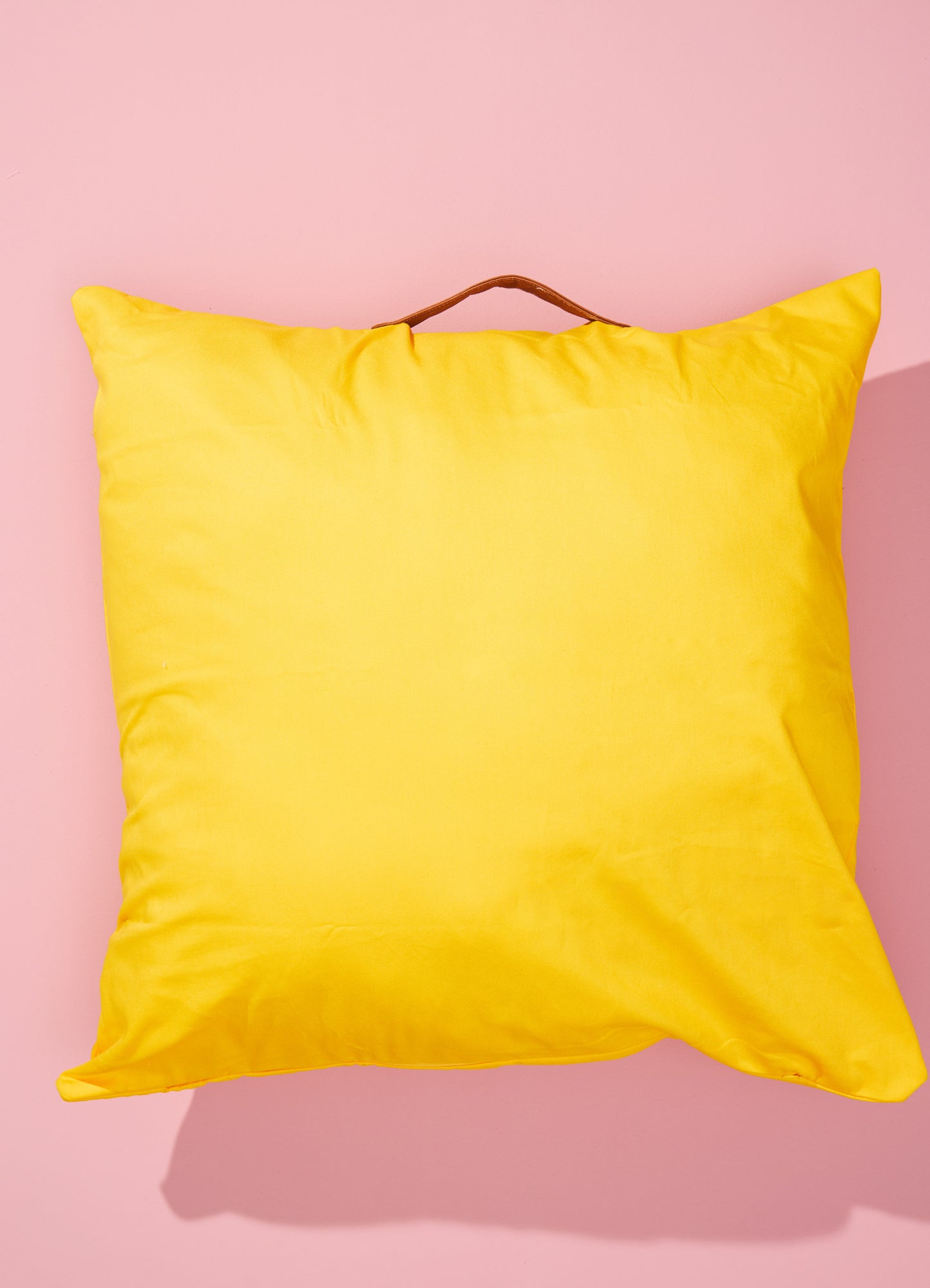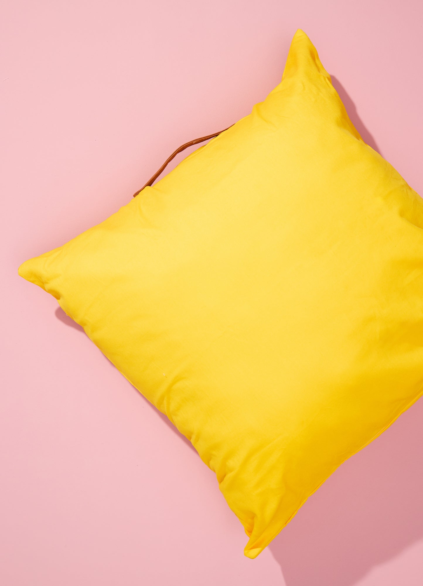 Uma almofada Canário gigante que a MOOUI criou para ser colocado na hora de sentar no chão para brincar, assistir um filme ou apreciar um momento de leitura com conforto. O almofadão de chão é de sarja dos dois lados e contém zíper na lateral para retirada da capa para higienização. Para facilitar a locomoção para qualquer cômodo da casa, ele ainda possui alça em couro sintético.