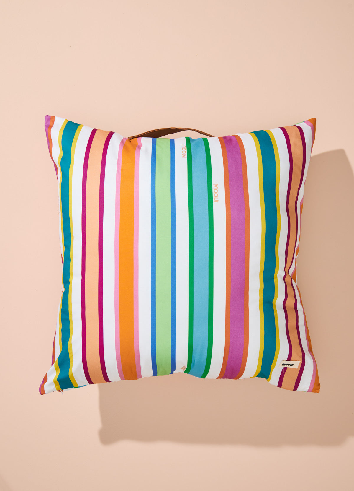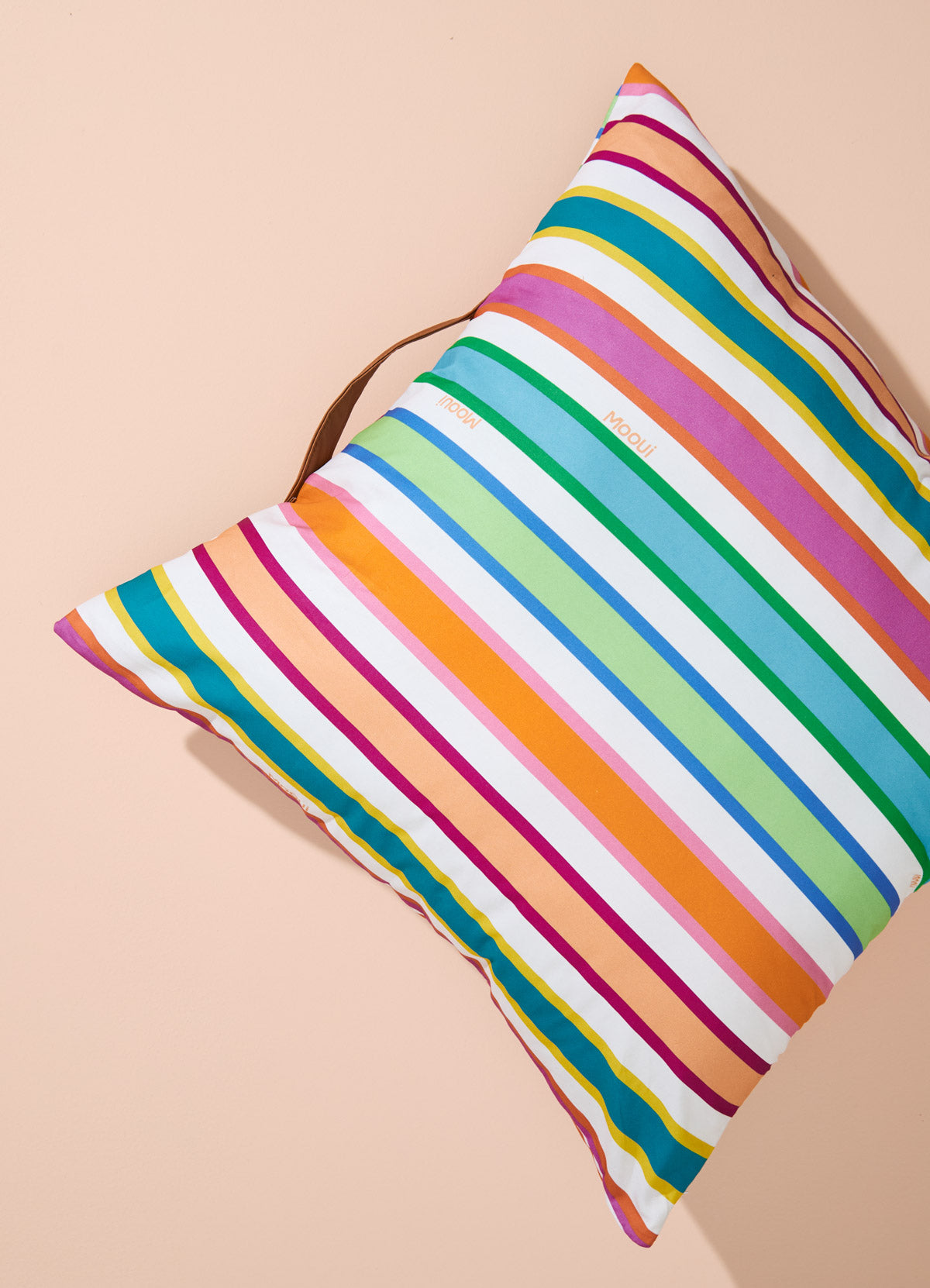 Um almofadão na estampa Listrado Alegria que a MOOUI criou para ser colocado na hora de sentar no chão para brincar, assistir um filme ou apreciar um momento de leitura com conforto. O almofadão de chão é de sarja dos dois lados e contém zíper na lateral para retirada da capa para higienização. Para facilitar a locomoção para qualquer cômodo da casa, ele ainda possui alça em couro sintético.