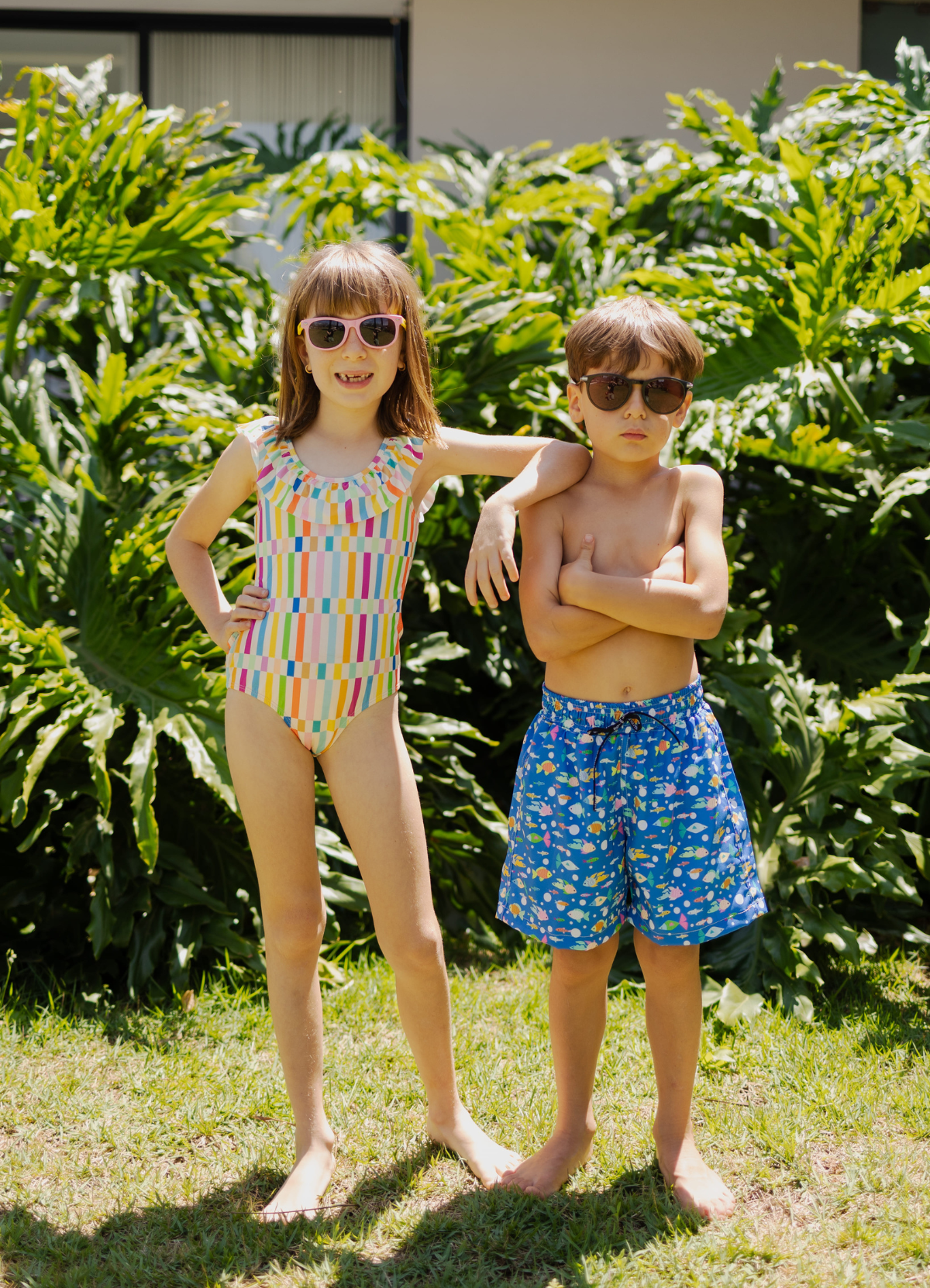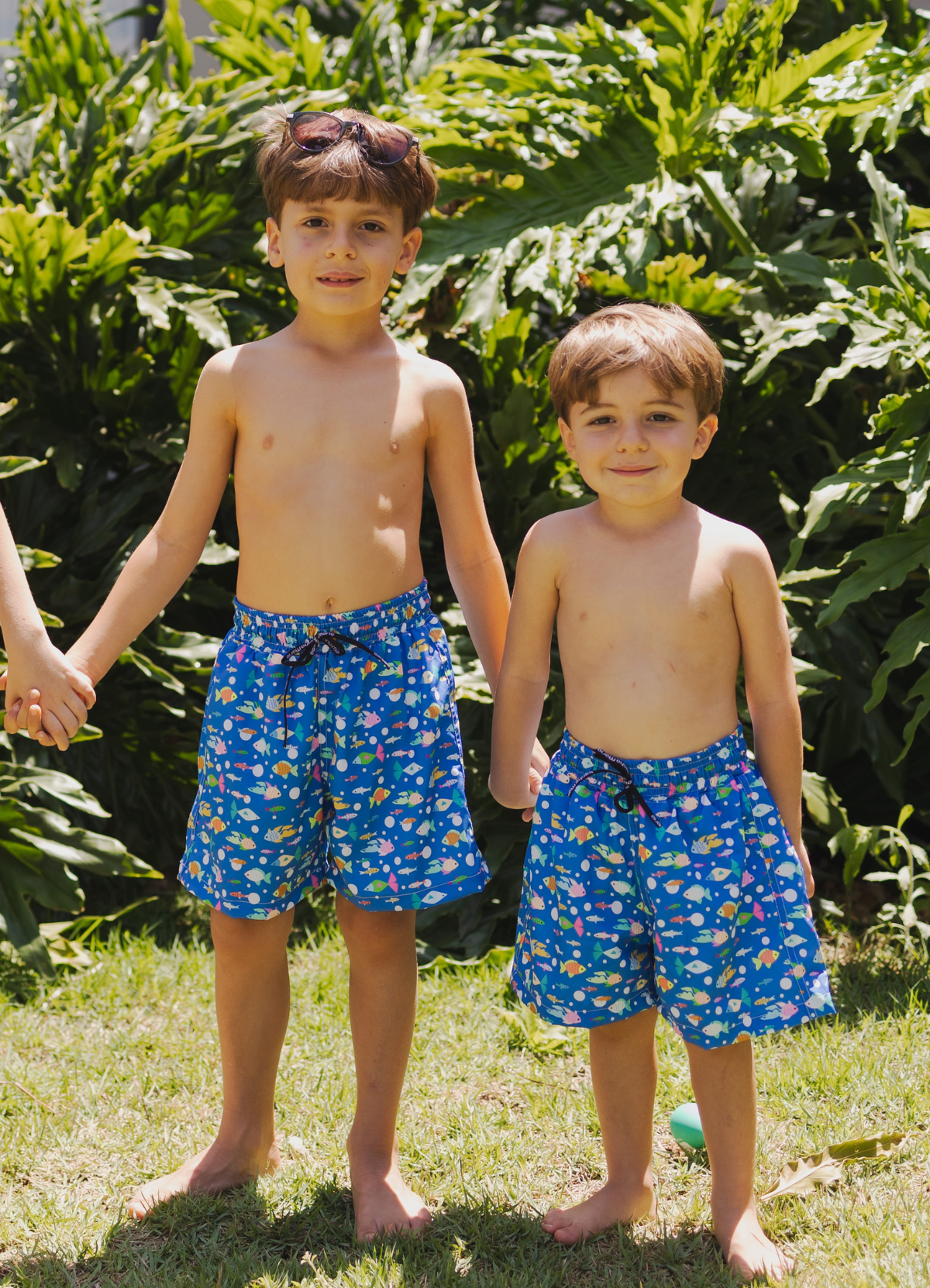 A Bermuda Resort Peixinhos do Oceano MOOUI é ideal para acompanhar as aventuras das crianças com muito conforto. Produzida em poliéster com elastano e forro em poliamida, tem proteção UV50+, secagem rápida e é respirável. Com a estampa alegre Peixinhos do Oceano, garante estilo e praticidade para brincar dentro e fora da água.