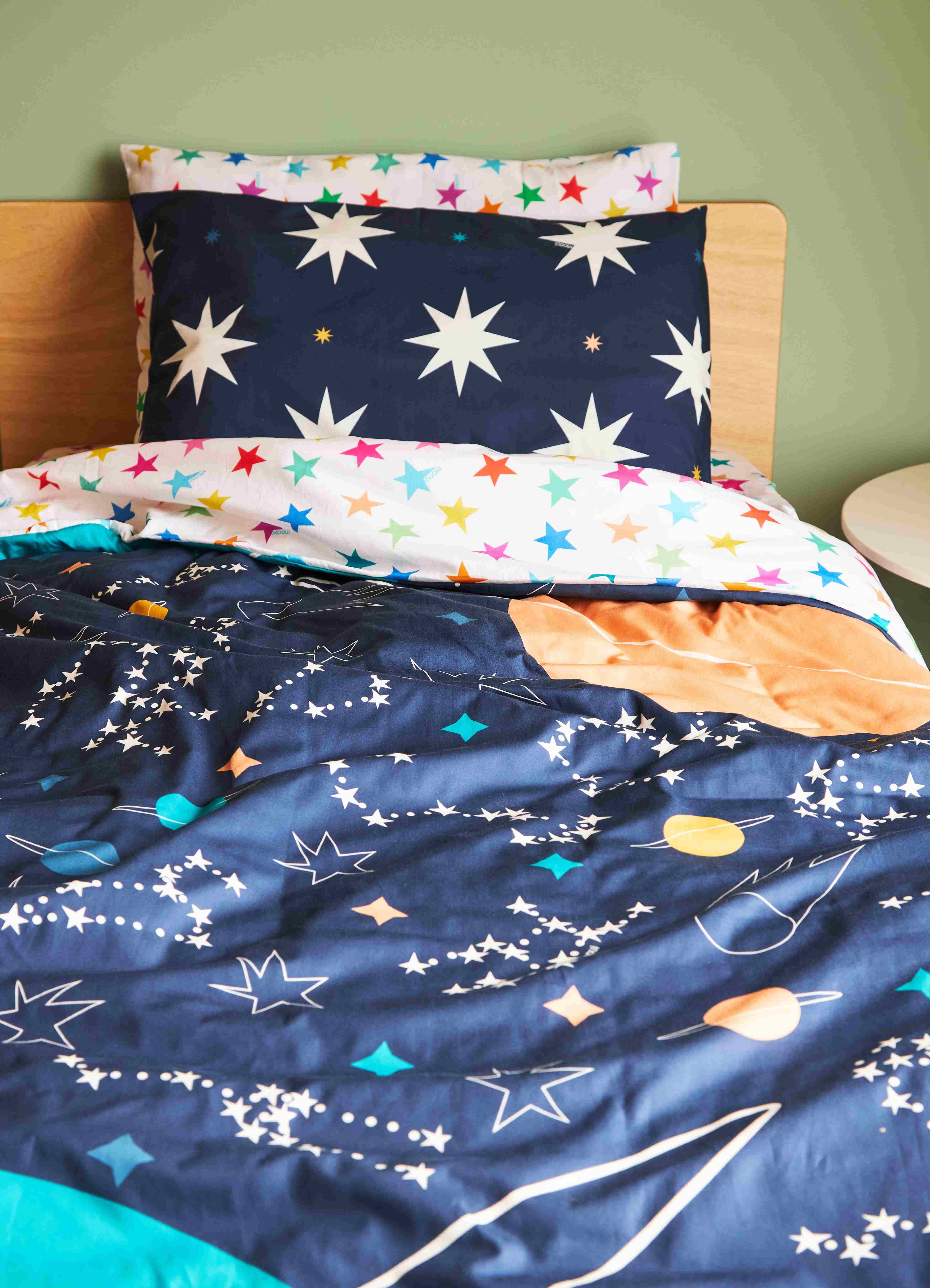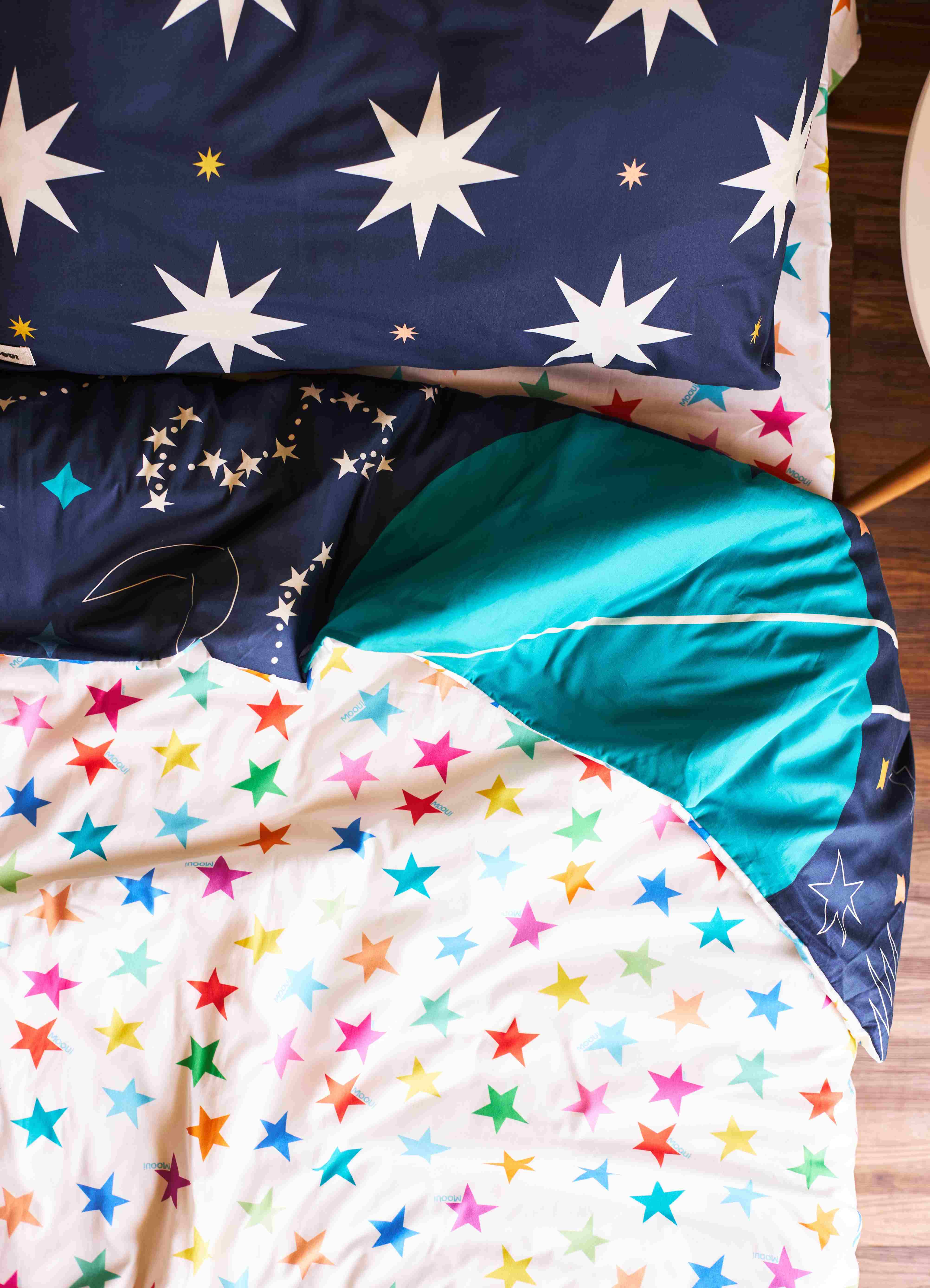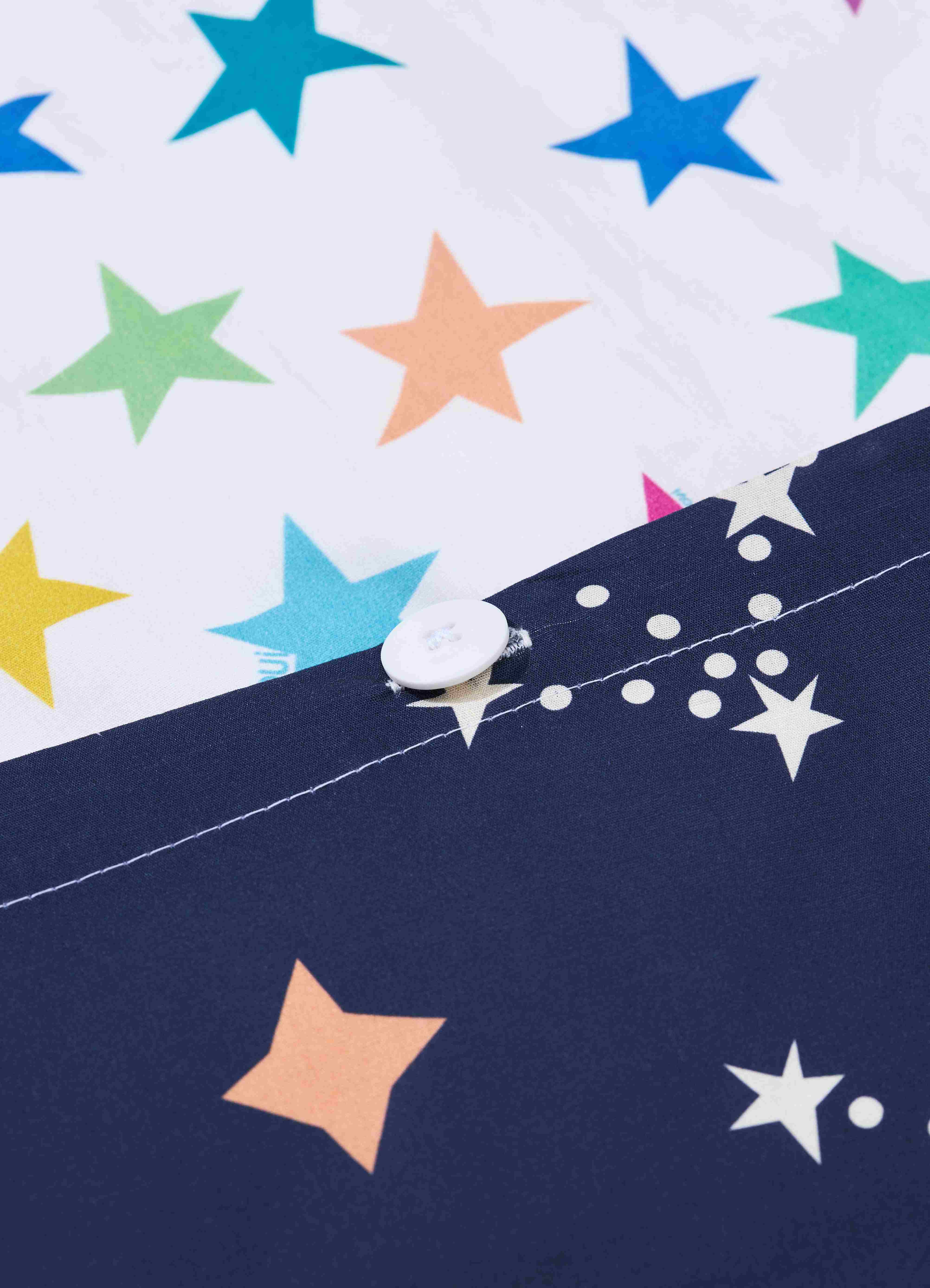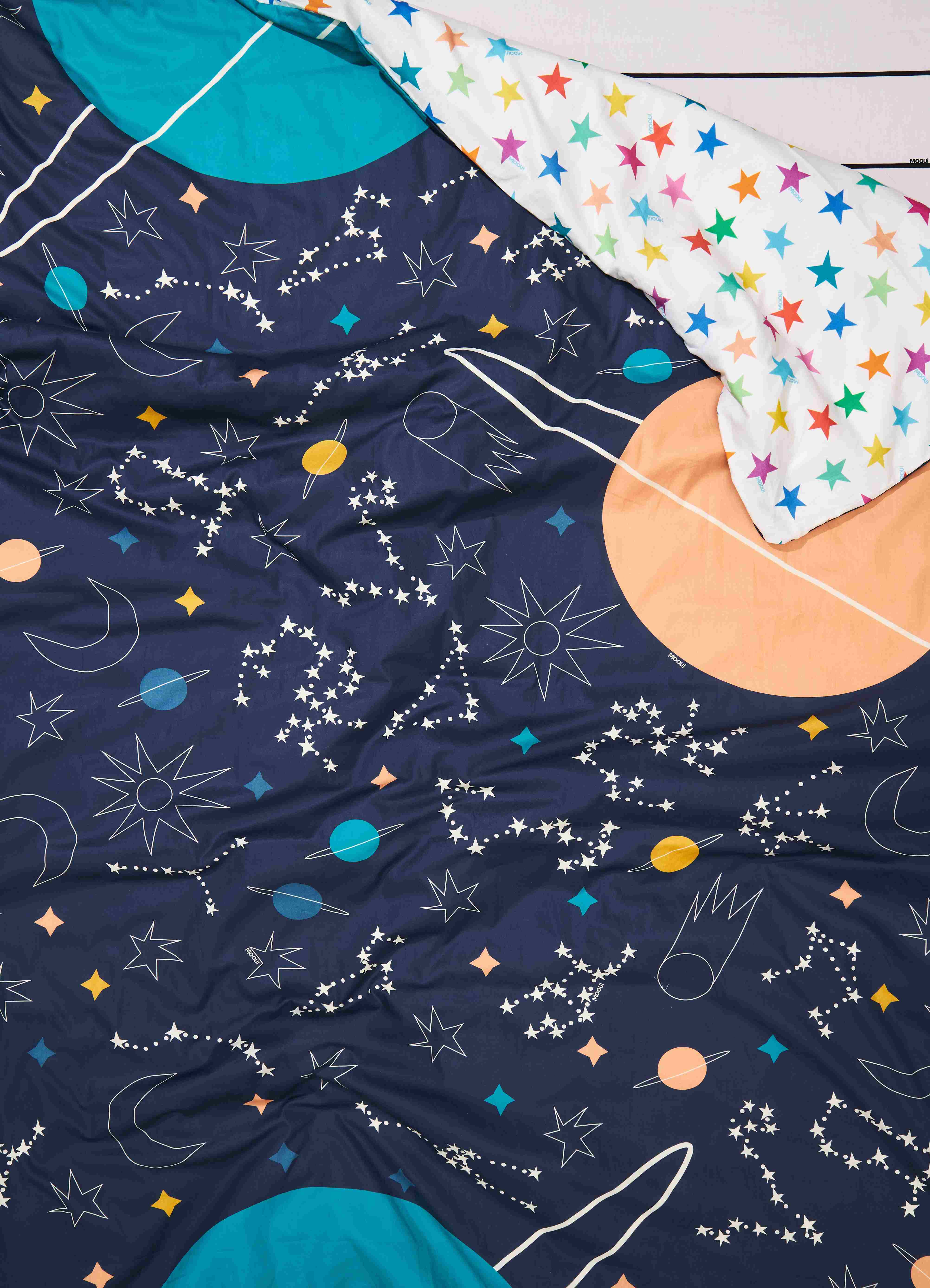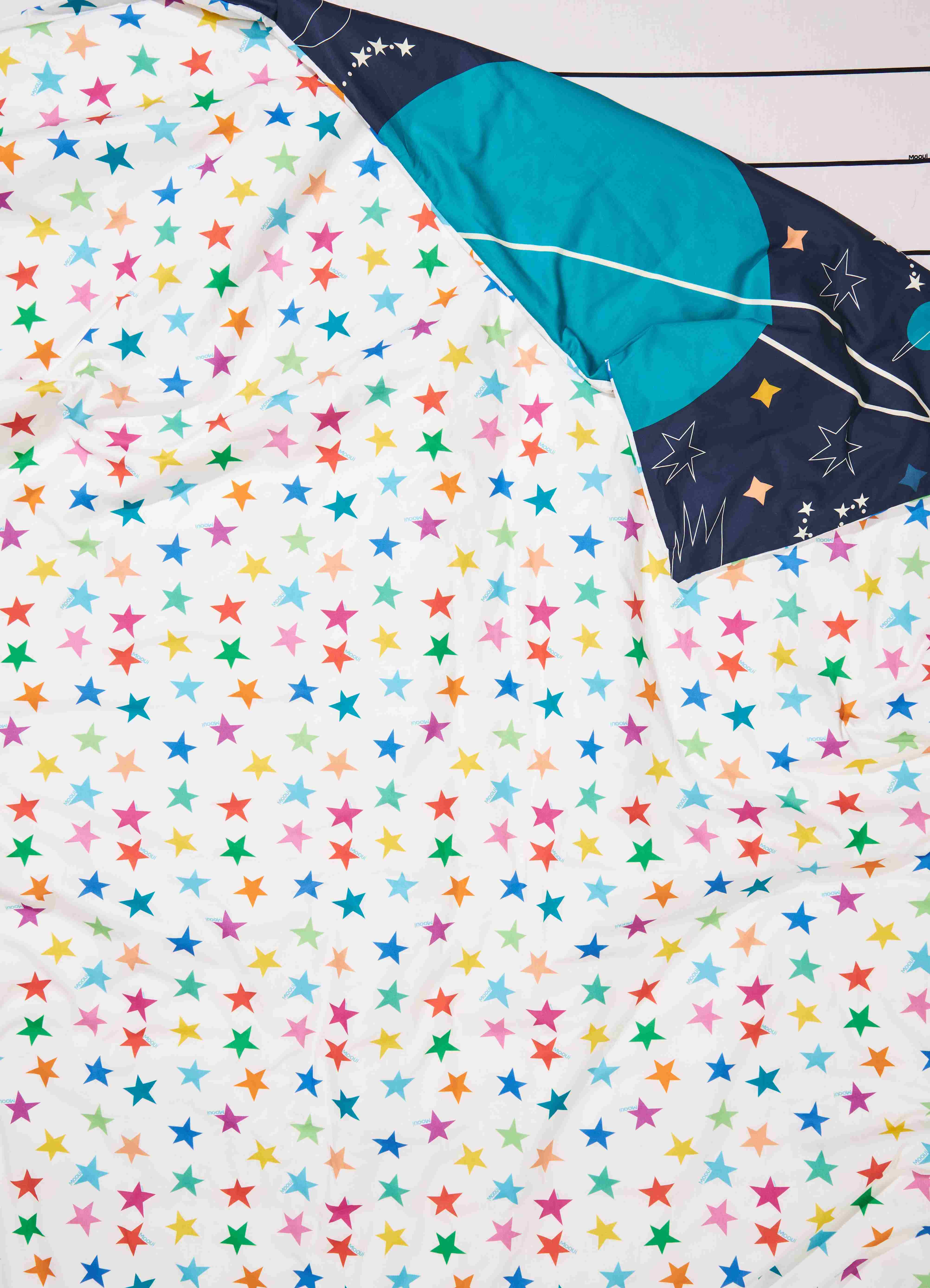 A Capa de Edredom Infantil Céu Estrelado da MOOUI traz praticidade e estilo para o quarto das crianças. Com abertura inferior e fechamento em botões, permite fácil colocação e remoção para lavagens regulares, sendo mais leve e prática de higienizar que o edredom completo.