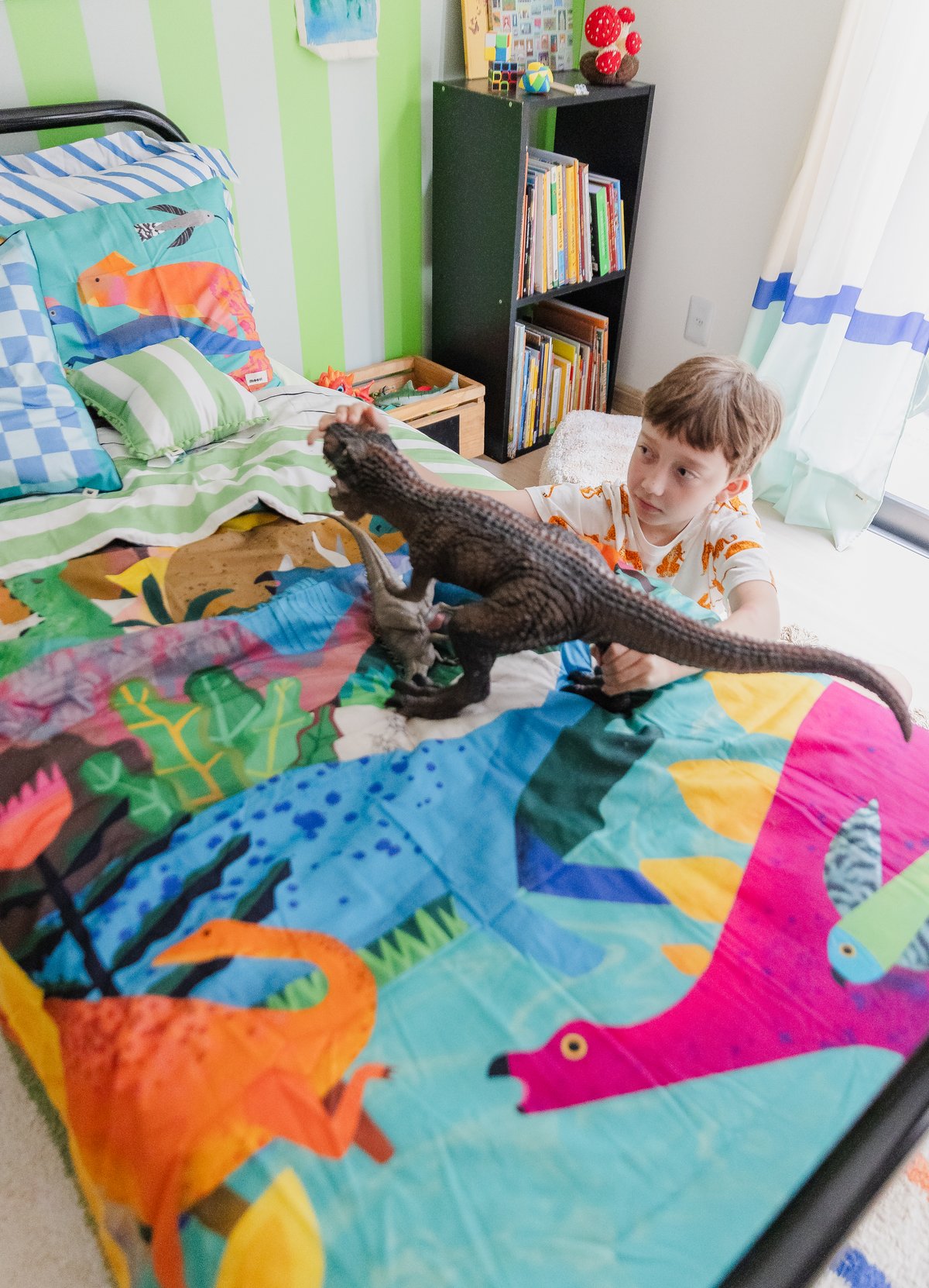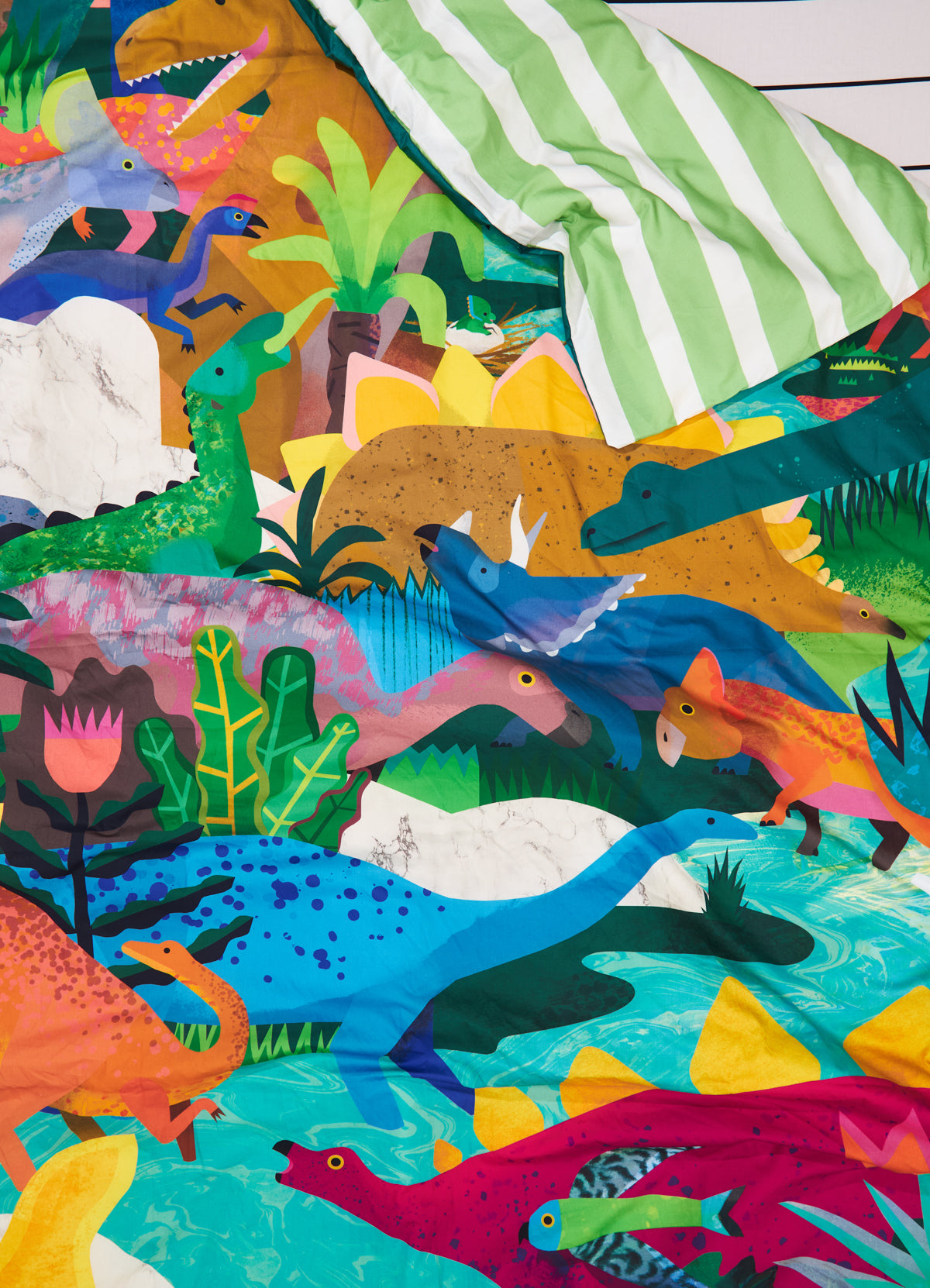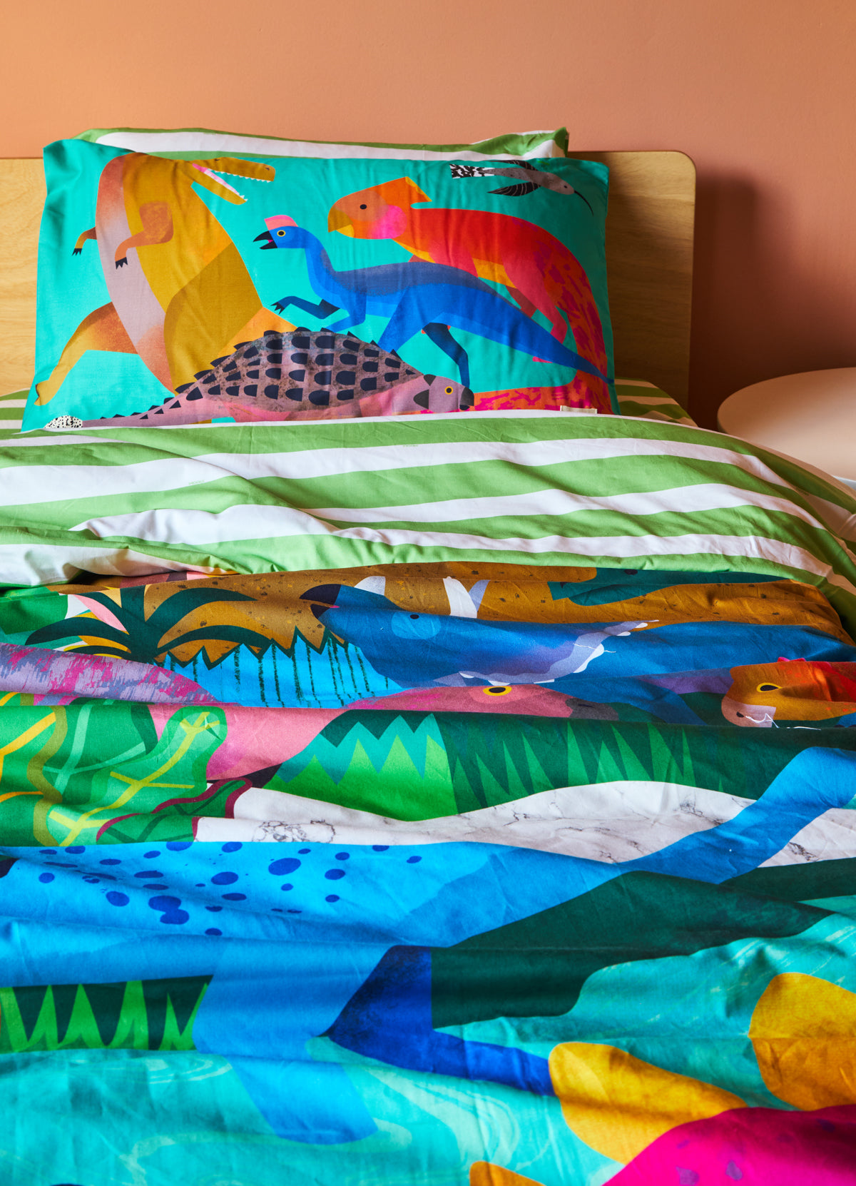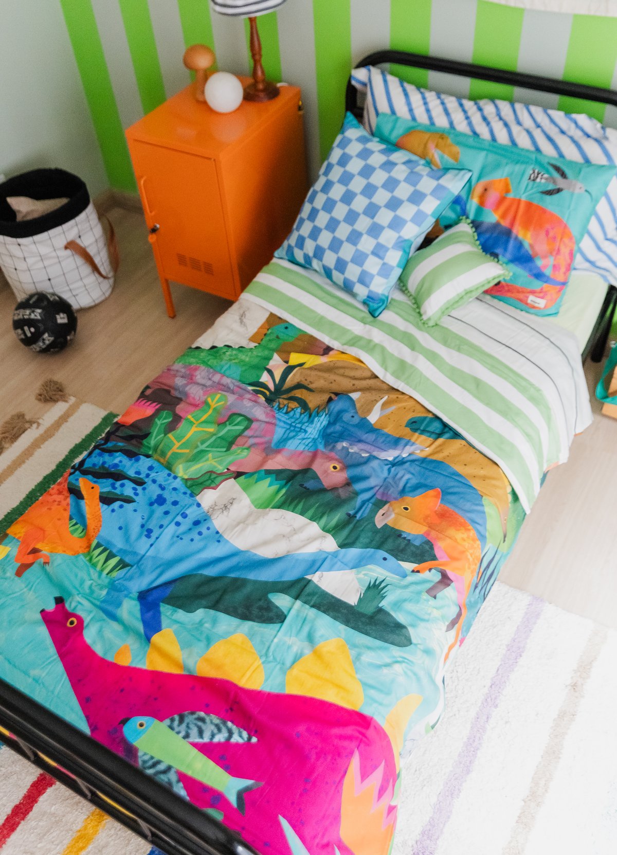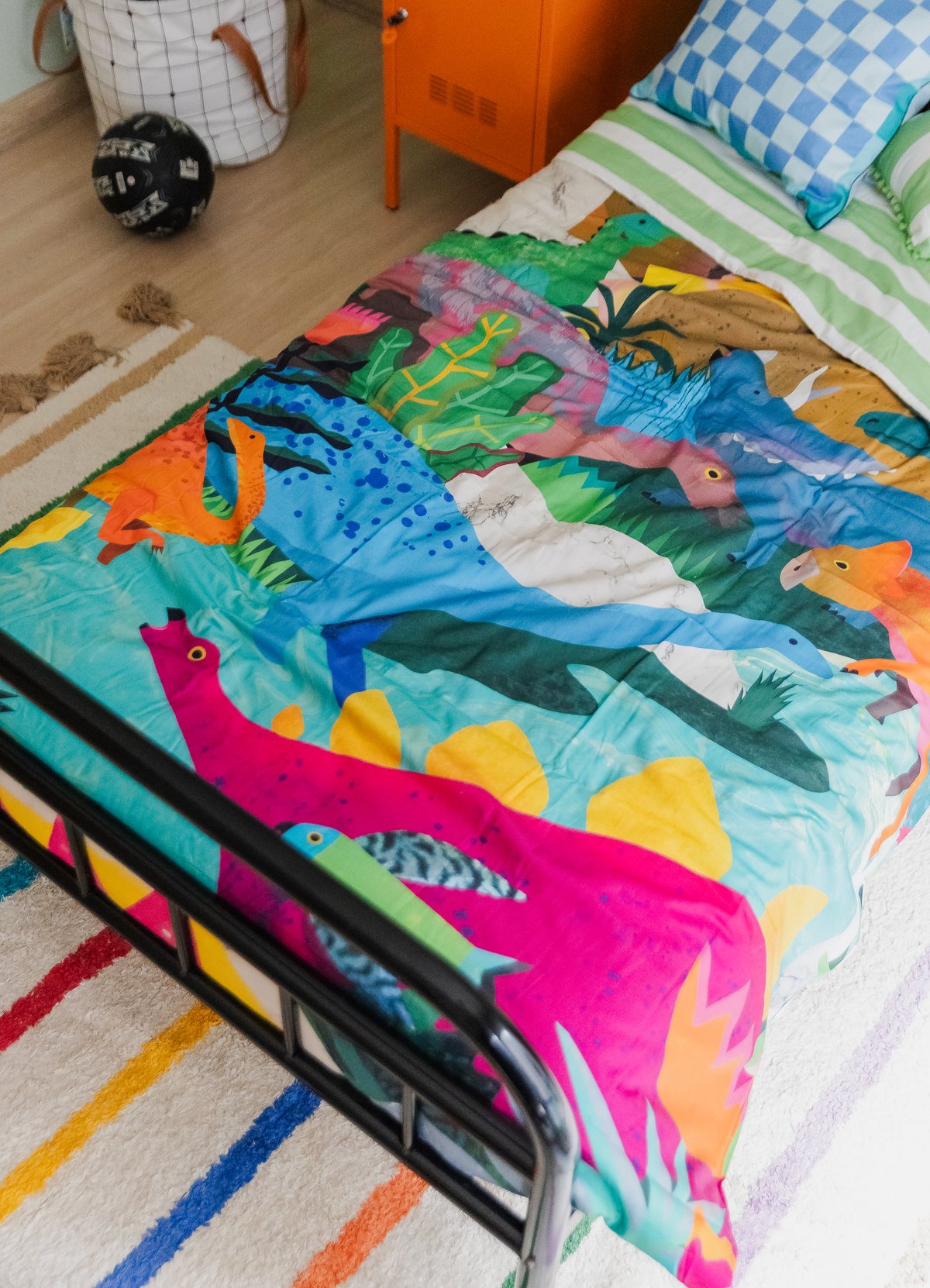 A Capa de Edredom Infantil Dinossauros da MOOUI traz praticidade e estilo para o quarto das crianças. Com abertura inferior e fechamento em botões, permite fácil colocação e remoção para lavagens regulares, sendo mais leve e prática de higienizar que o edredom completo.