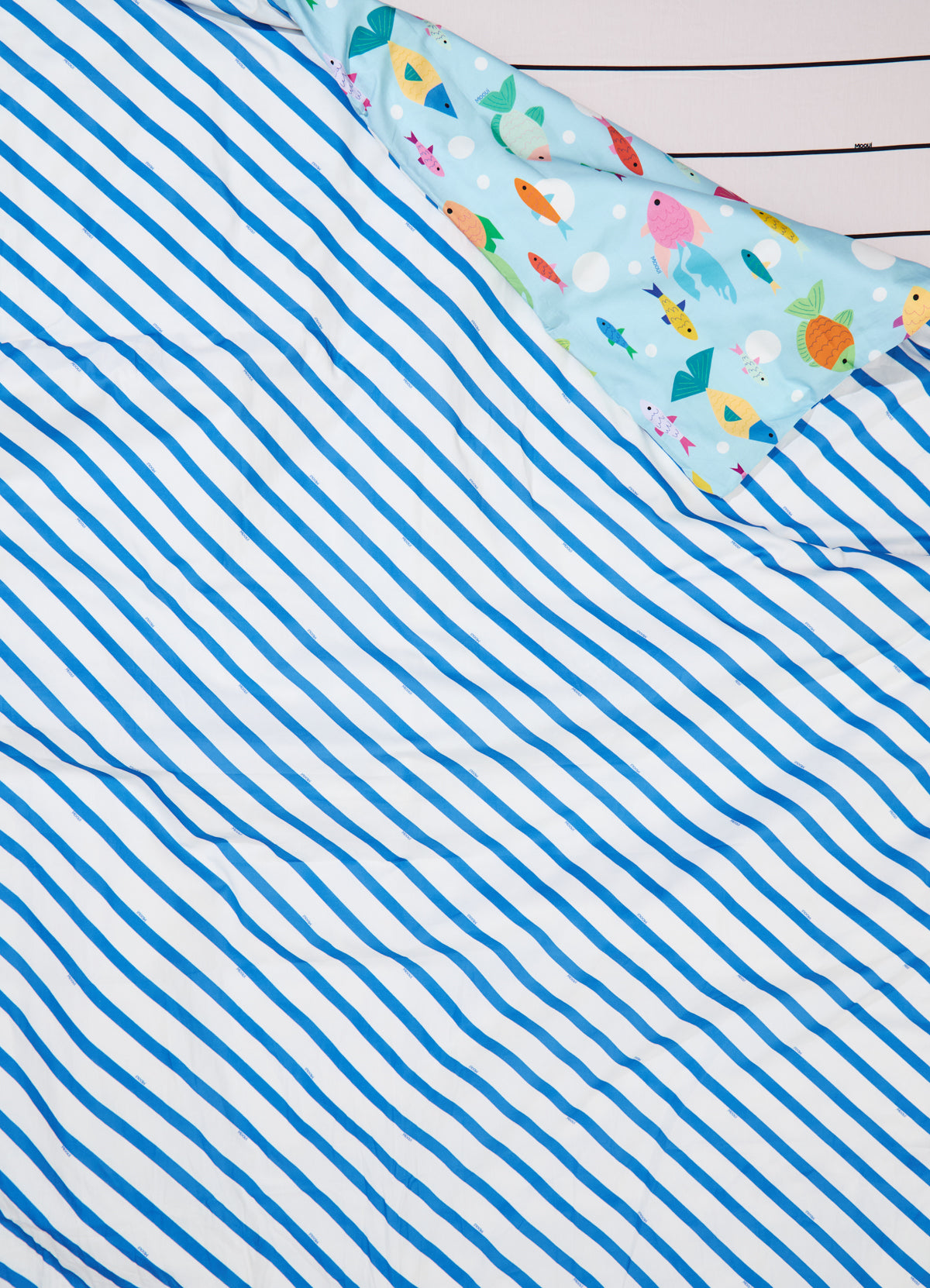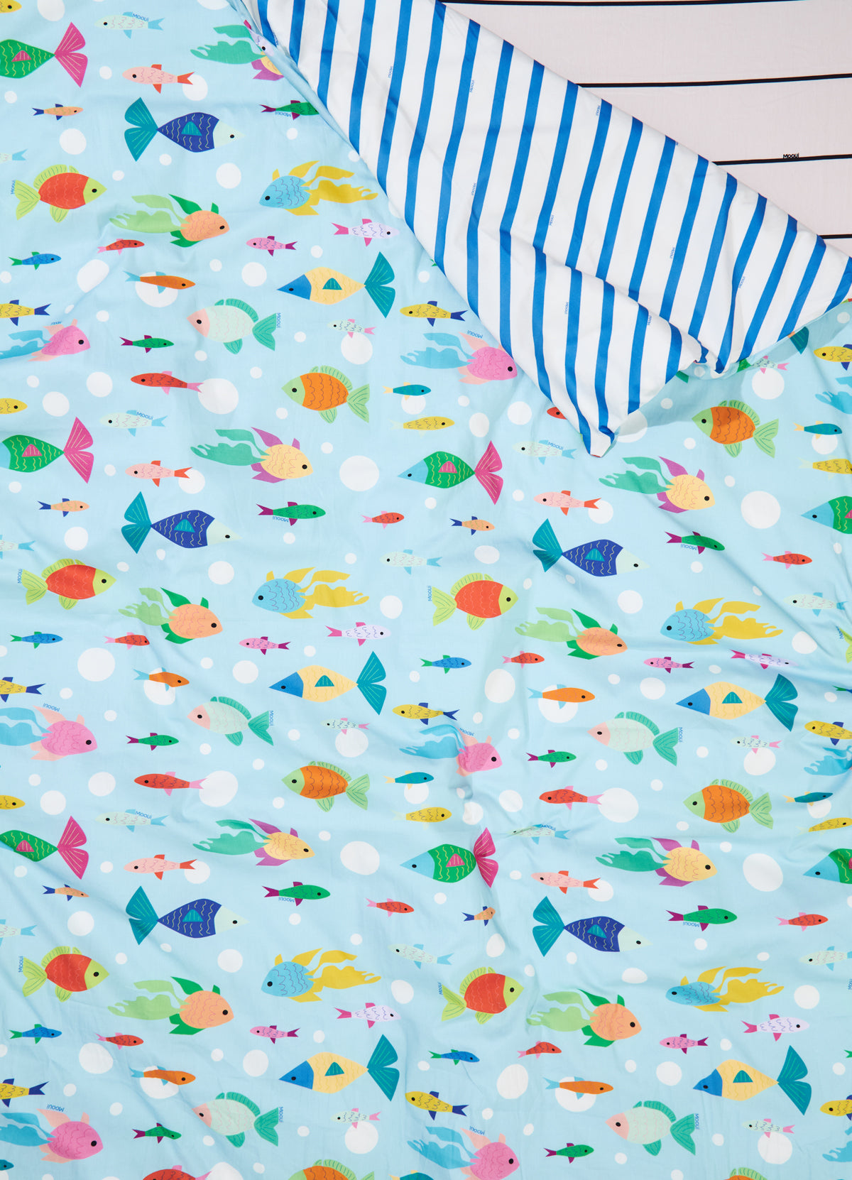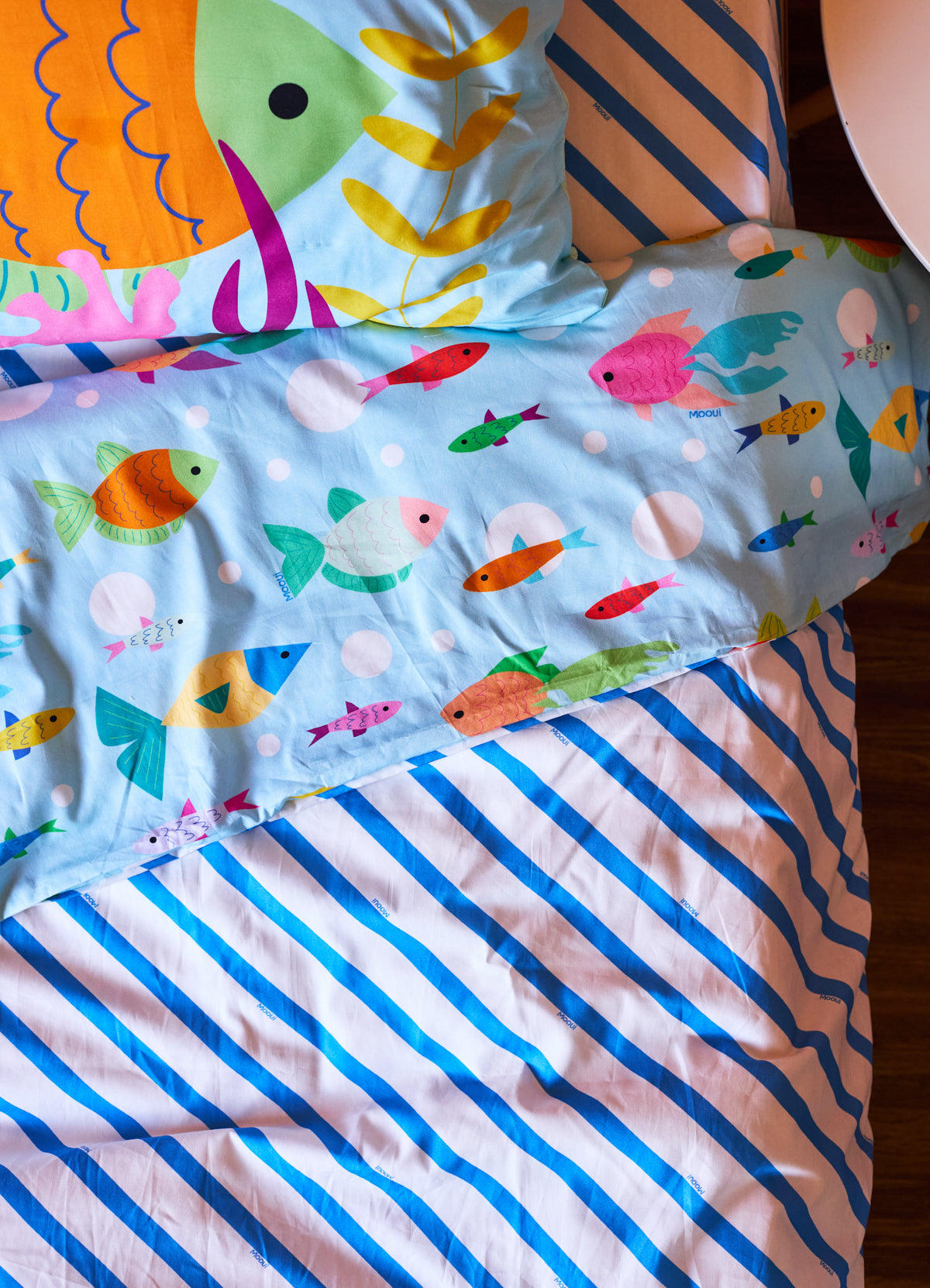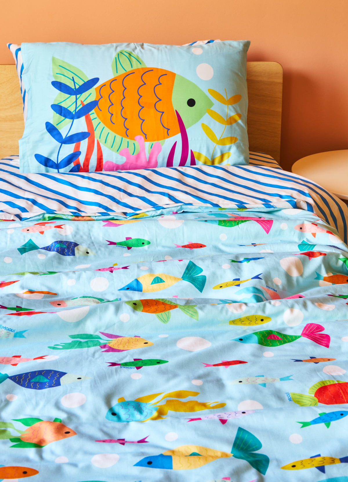 A Capa de Edredom Infantil Peixinhos Do Oceano da MOOUI traz praticidade e estilo para o quarto das crianças. Com abertura inferior e fechamento em botões, permite fácil colocação e remoção para lavagens regulares, sendo mais leve e prática de higienizar que o edredom completo.