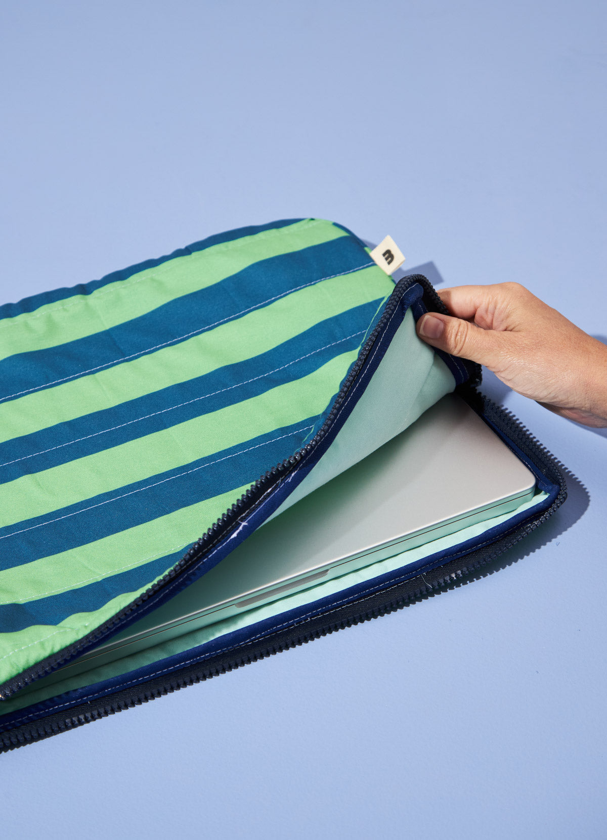 A Capa de Notebook Listrado Pantanal é daqueles itens que fazem toda diferença na organização da sua bolsa ou mochila. A capa para notebook é perfeita e necessária para o transporte do seu notebook de forma segura. Feito em tecido de algodão matelassado e fechamento em zíper, ele acomoda o computador de maneira segura e com muito estilo.