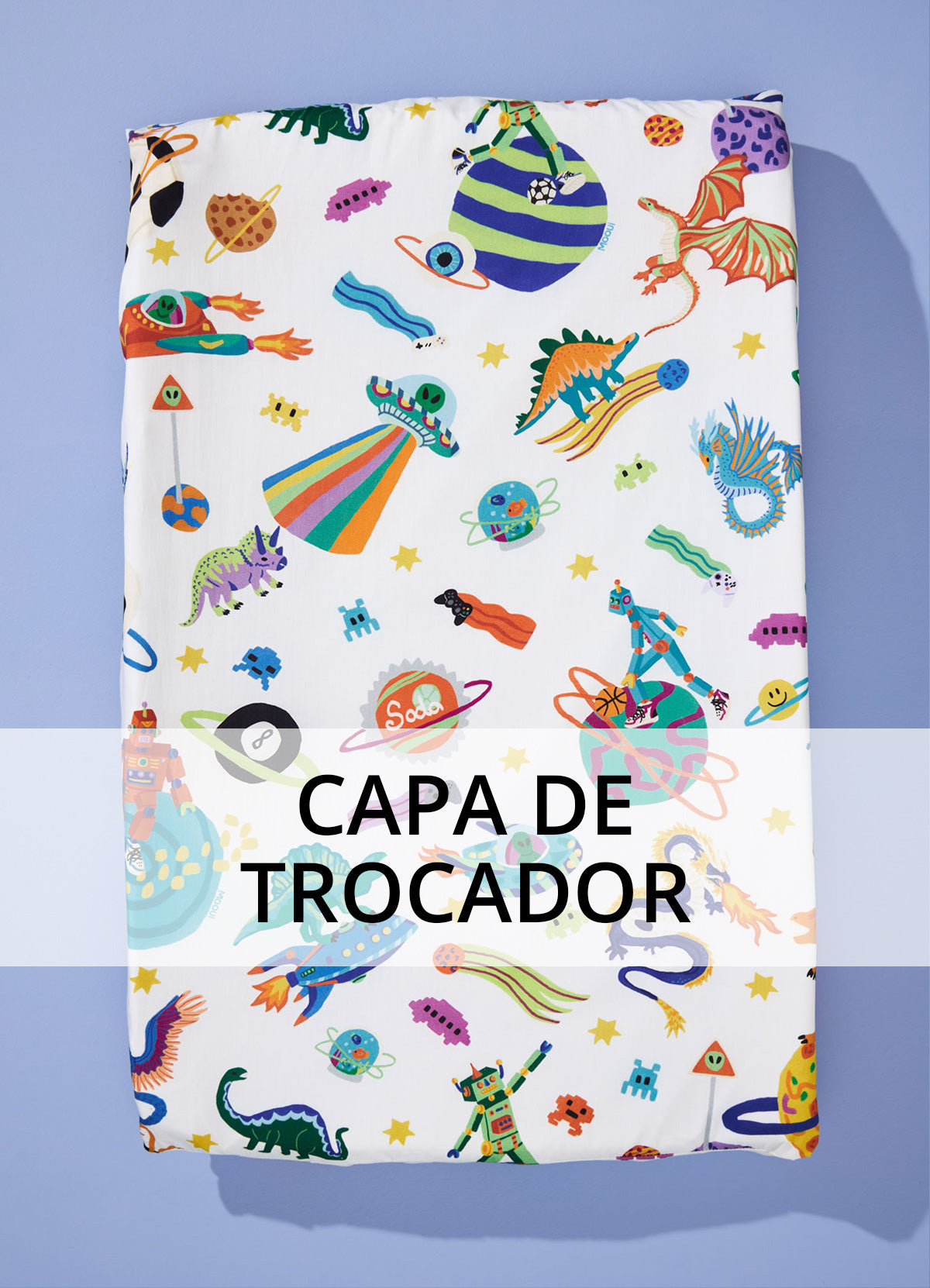 A Capa para Trocador Americano Aventura Cósmica Off da MOOUI traz praticidade e renovação para o dia a dia da troca de fraldas. Confeccionada em 100% algodão acetinado 230 fios, é removível para fácil higienização.