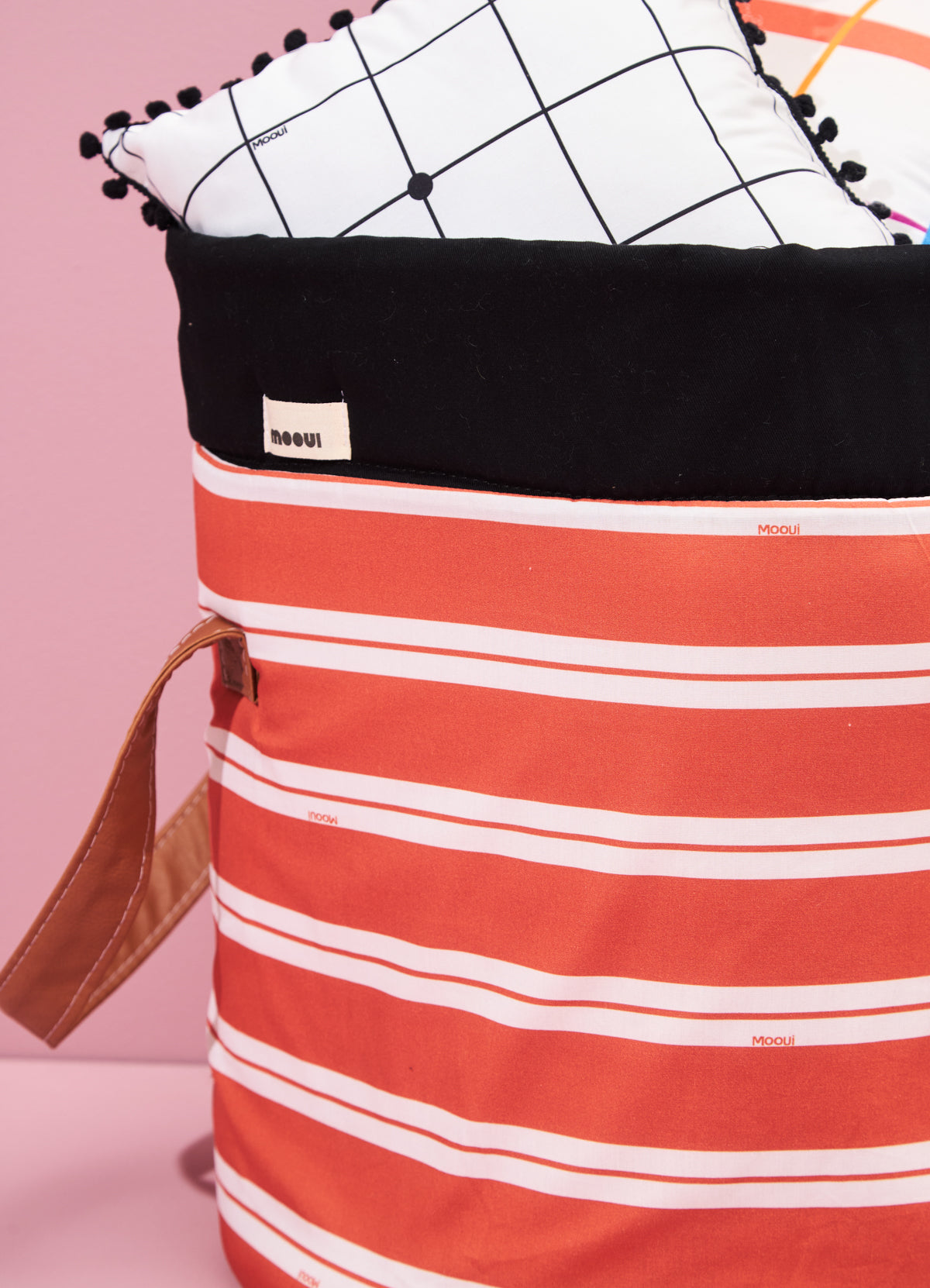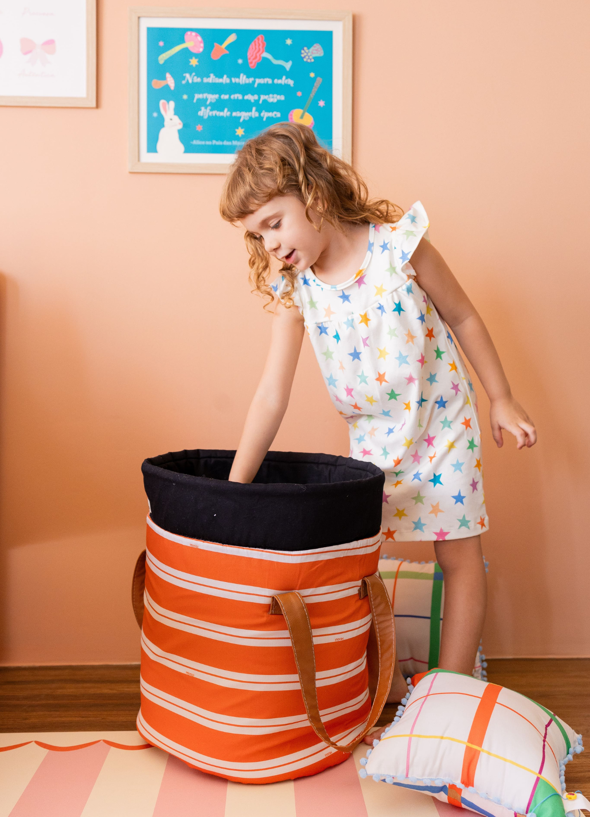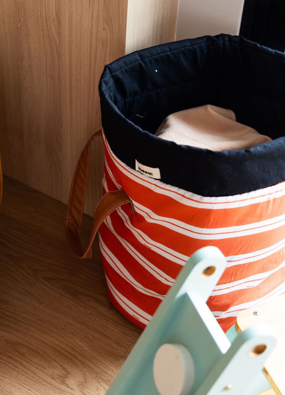 O Cesto Organizador Listrado Carmim da MOOUI combina organização e design em um único produto. Diferenciado pelas alças laterais em couro sintético que facilitam o transporte, é ideal para organizar brinquedos e acessórios em qualquer ambiente da casa.