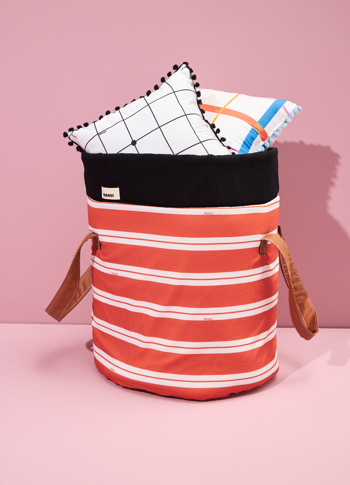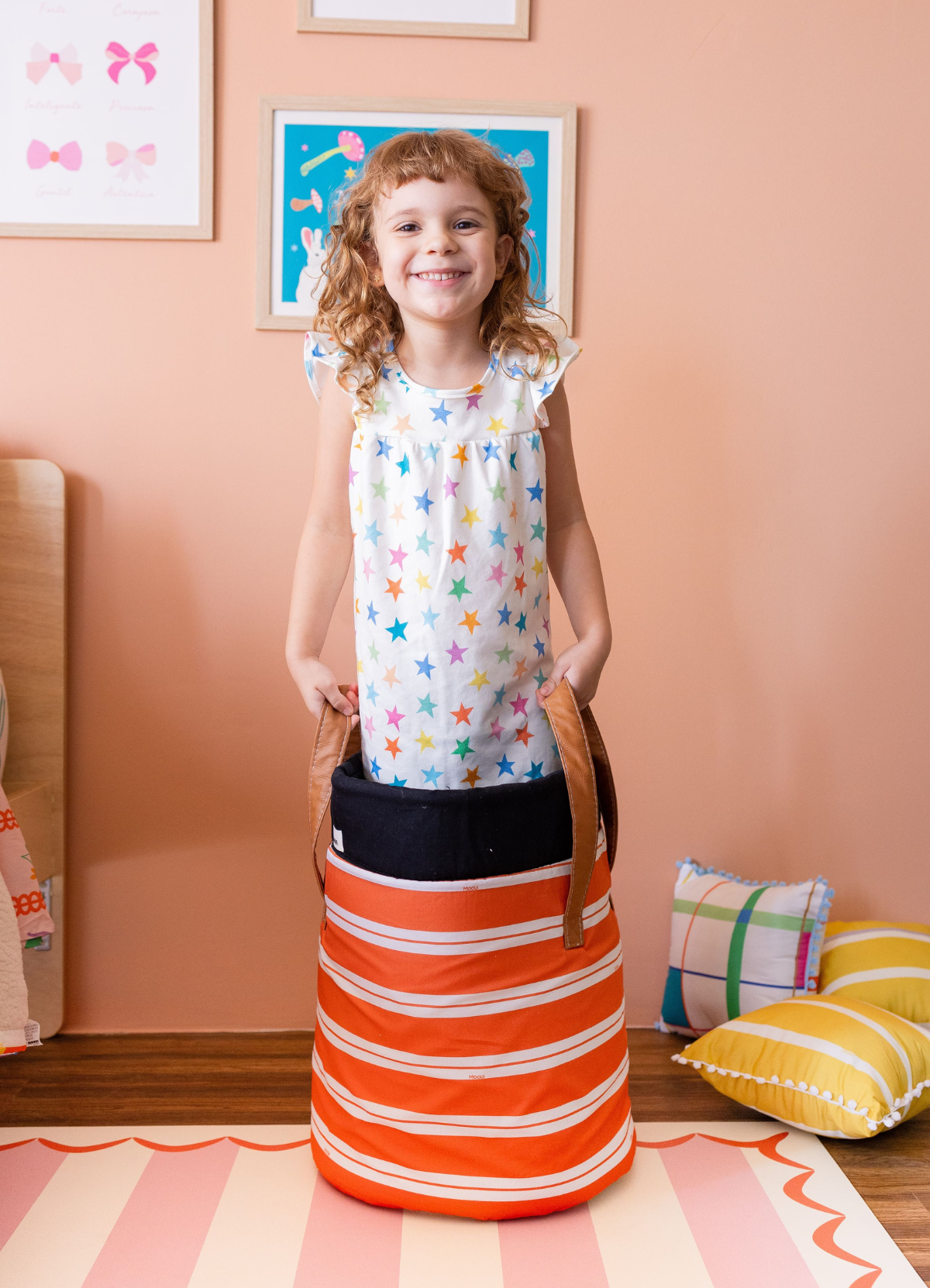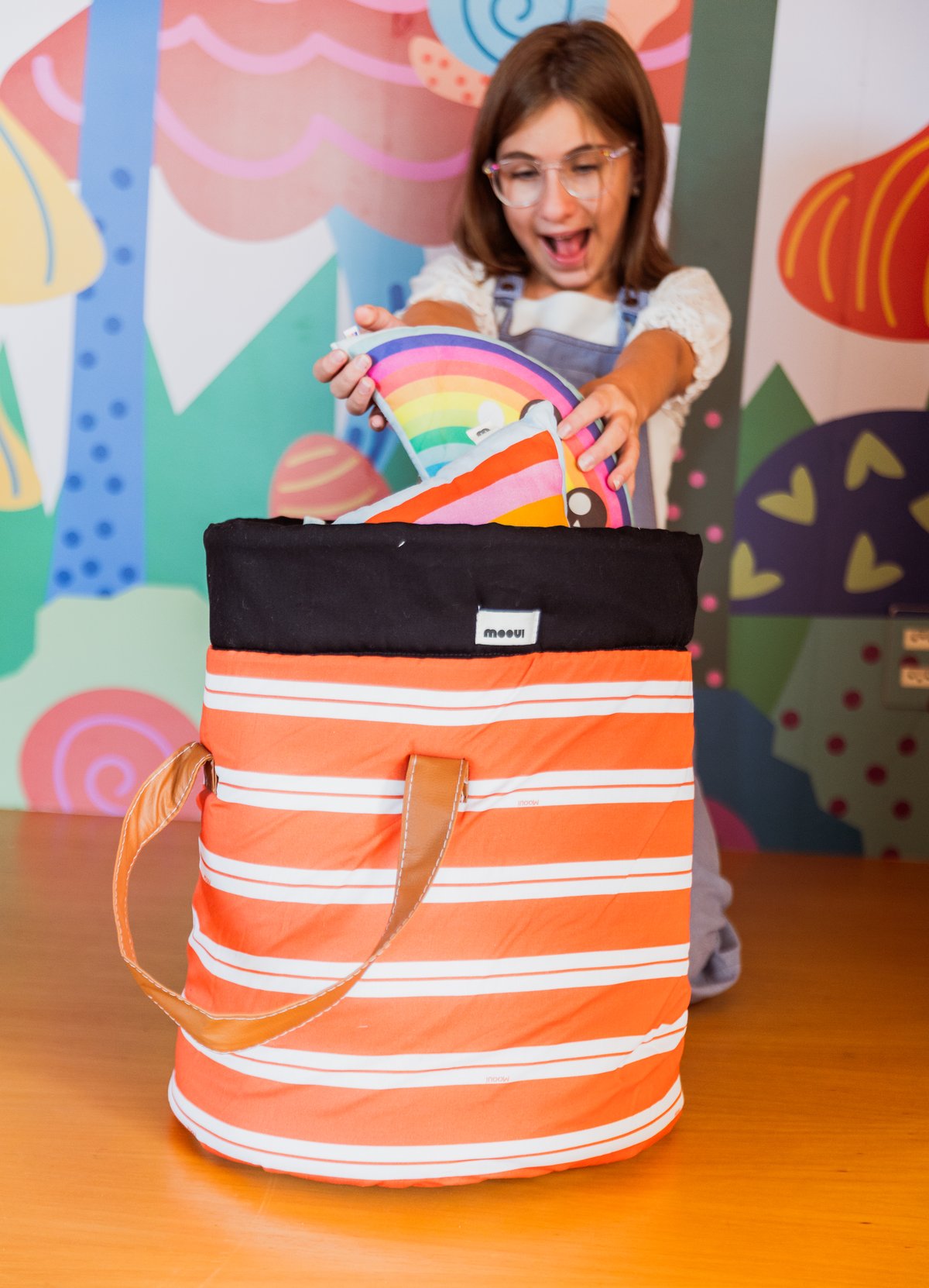 O Cesto Organizador Listrado Carmim da MOOUI combina organização e design em um único produto. Diferenciado pelas alças laterais em couro sintético que facilitam o transporte, é ideal para organizar brinquedos e acessórios em qualquer ambiente da casa.