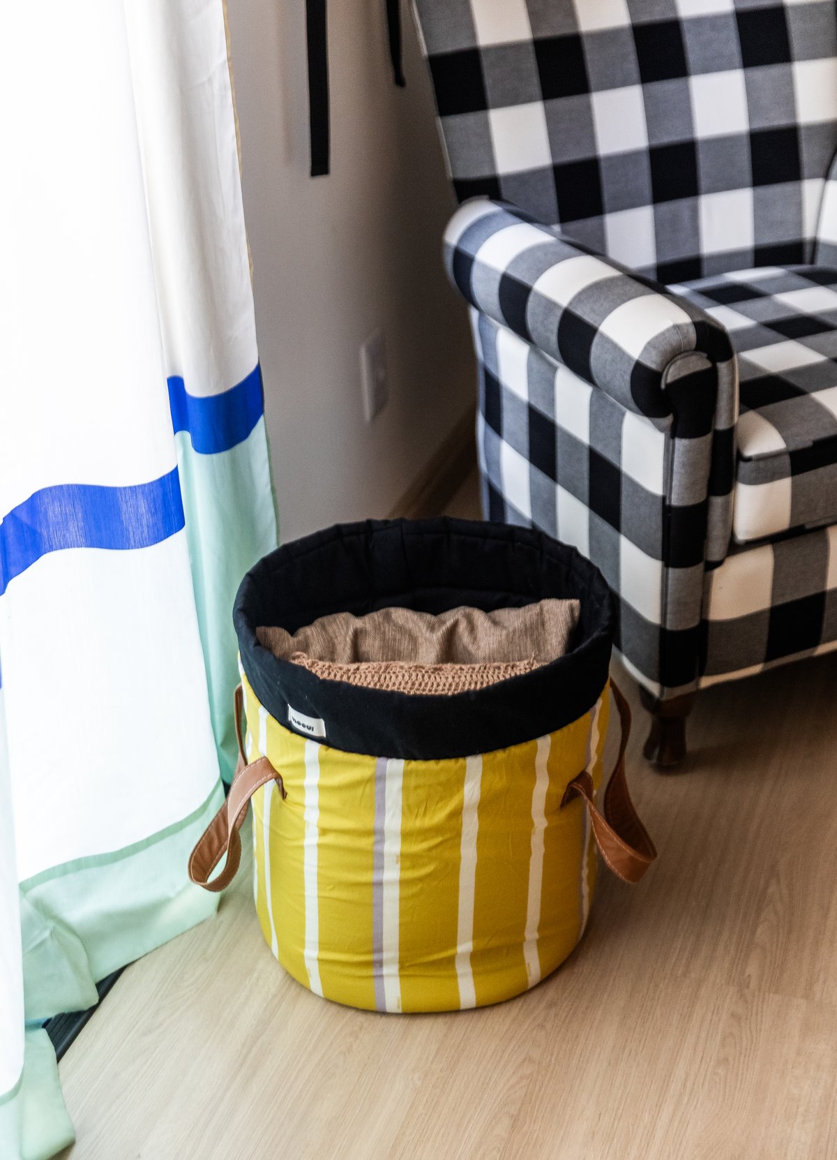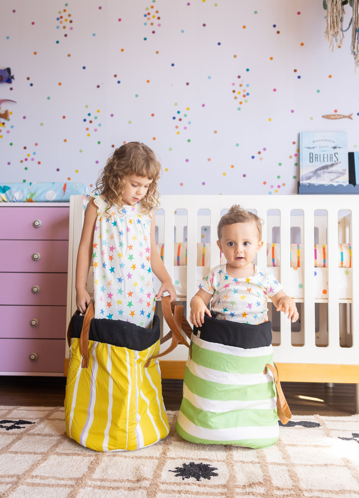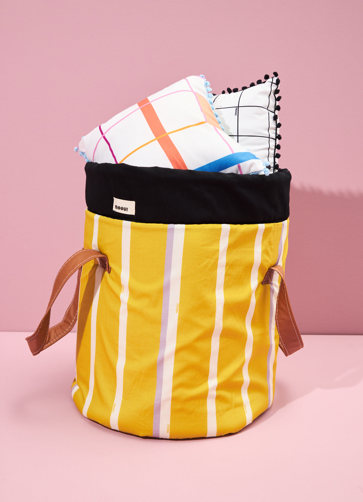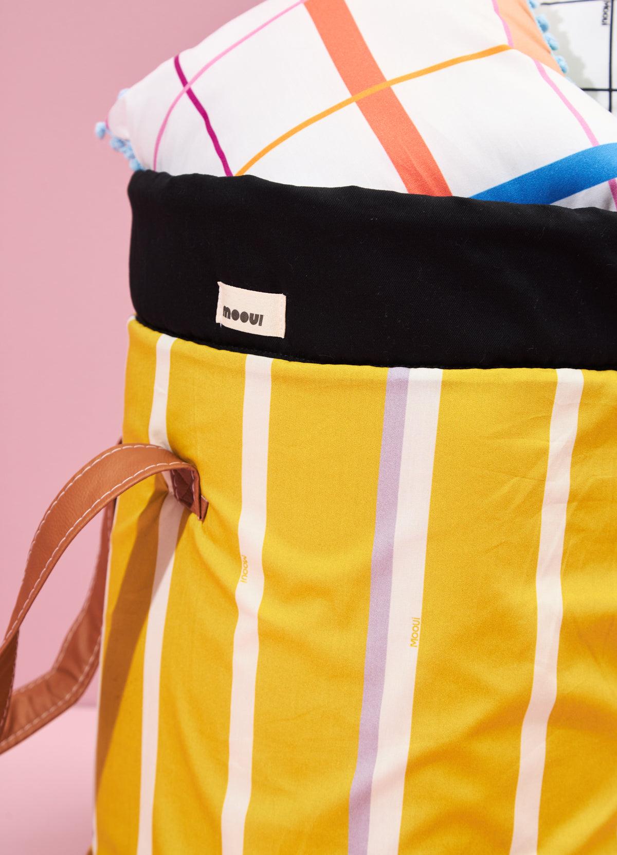 O Cesto Organizador Listrado Solar da MOOUI combina organização e design em um único produto. Diferenciado pelas alças laterais em couro sintético que facilitam o transporte, é ideal para organizar brinquedos e acessórios em qualquer ambiente da casa.