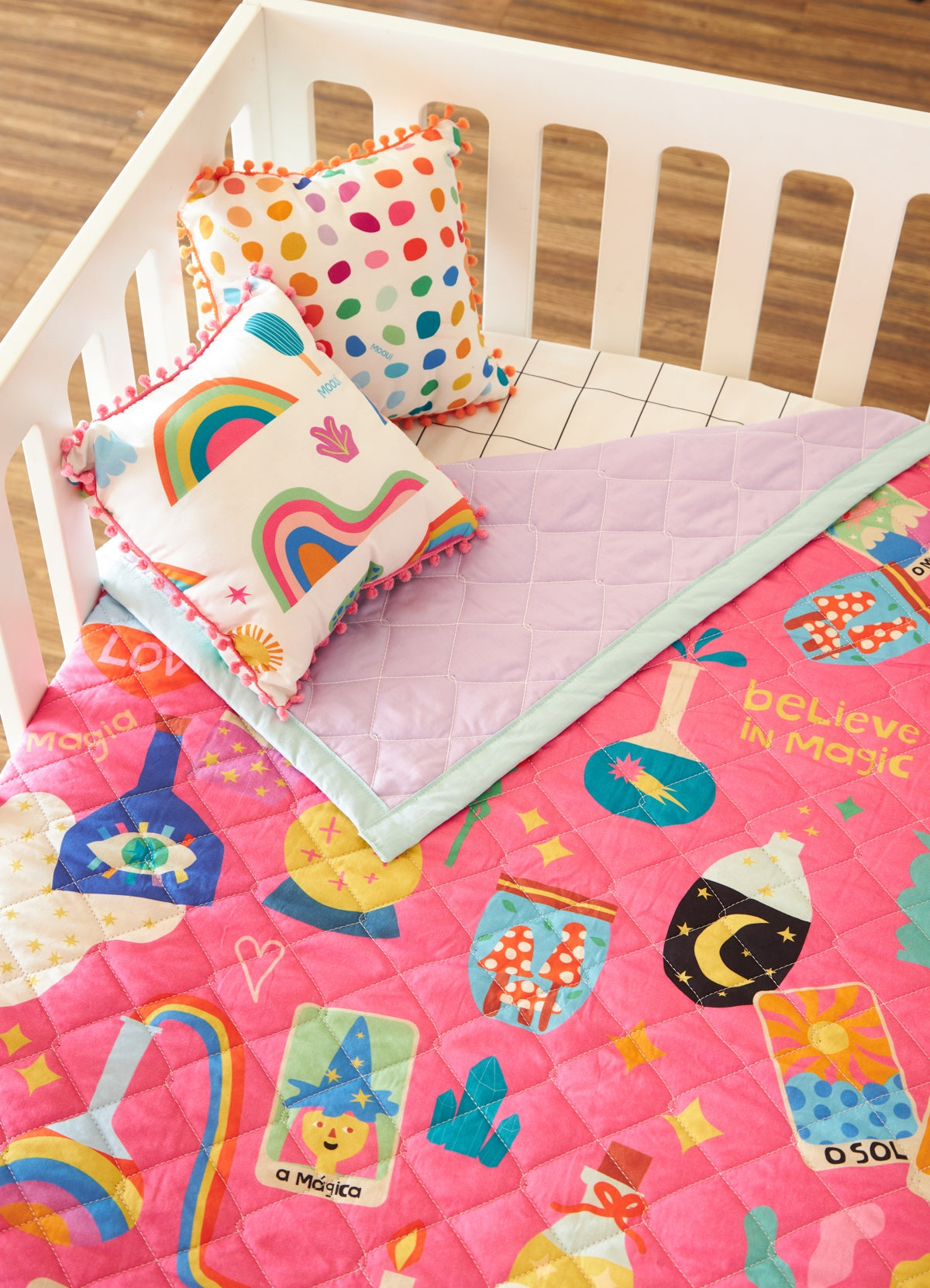 A Colcha Berço Magia é encantadora e tem o poder de transformar o berço na estrela da decoração do quarto. O conforto da colcha para berço vem da maciez do algodão, e seu estilo do design e do acabamento matelassado. O barrado e o verso da colcha para berço americano são lisos, com cores que integram a paleta de cores da estampa.