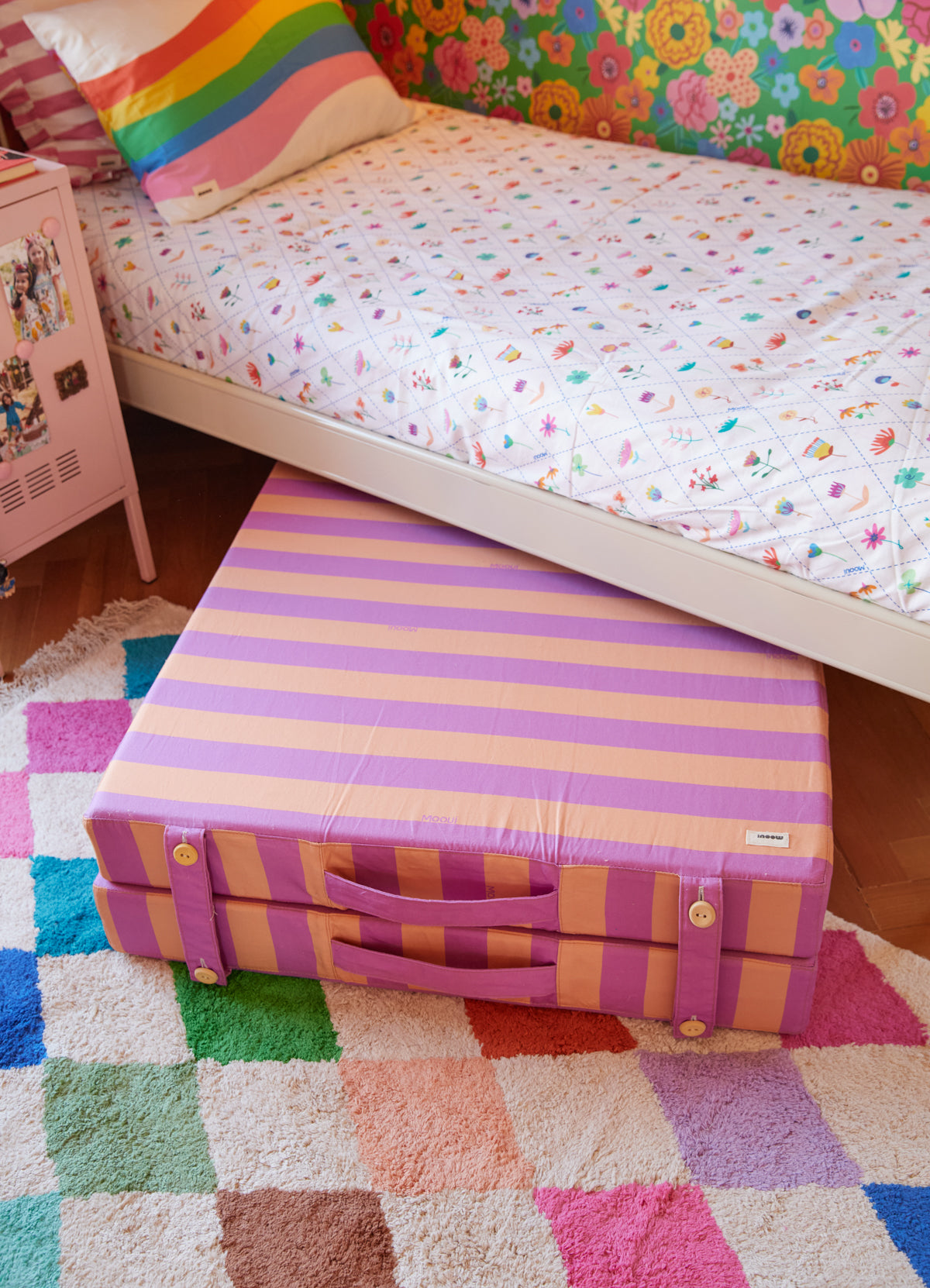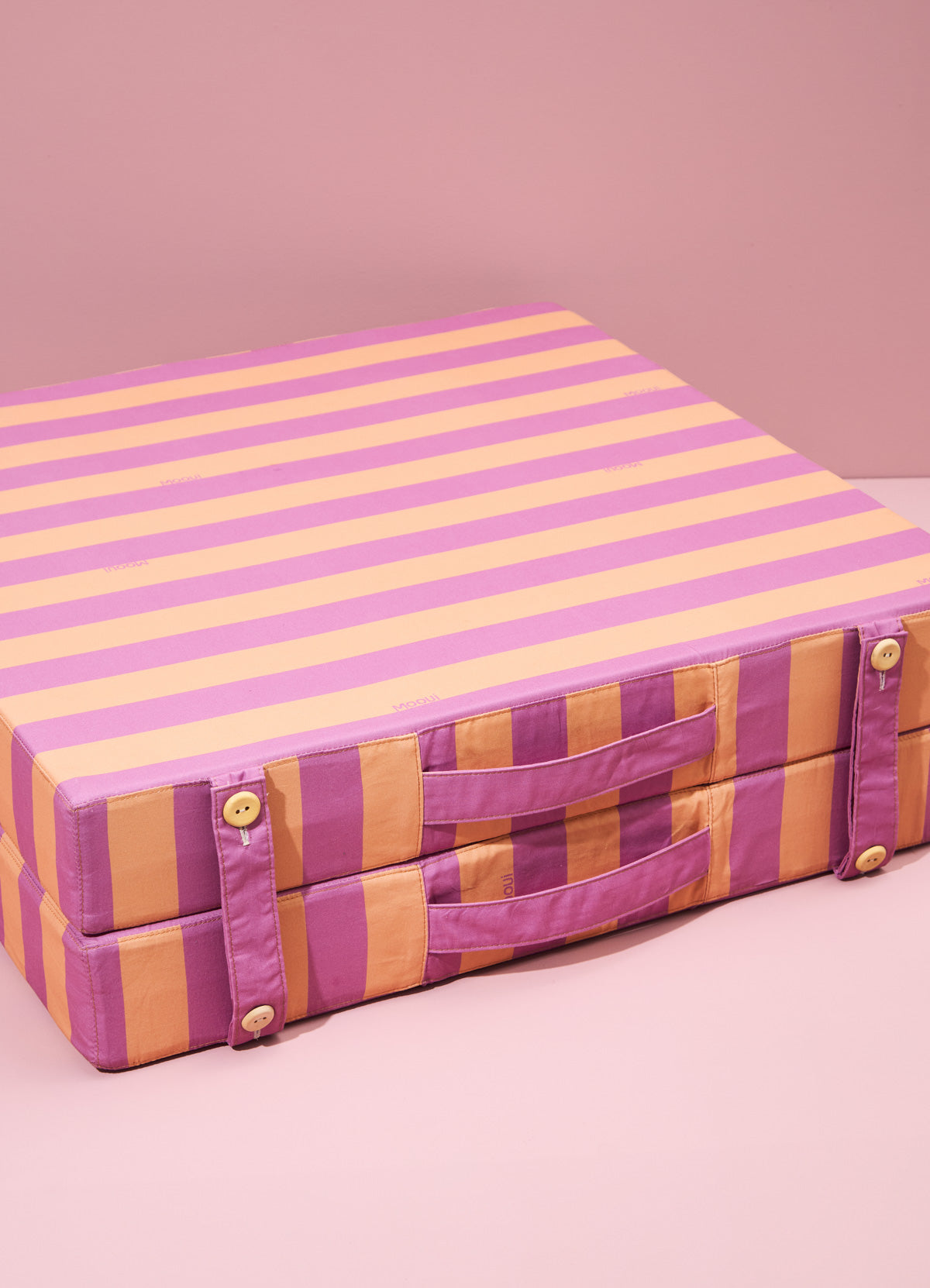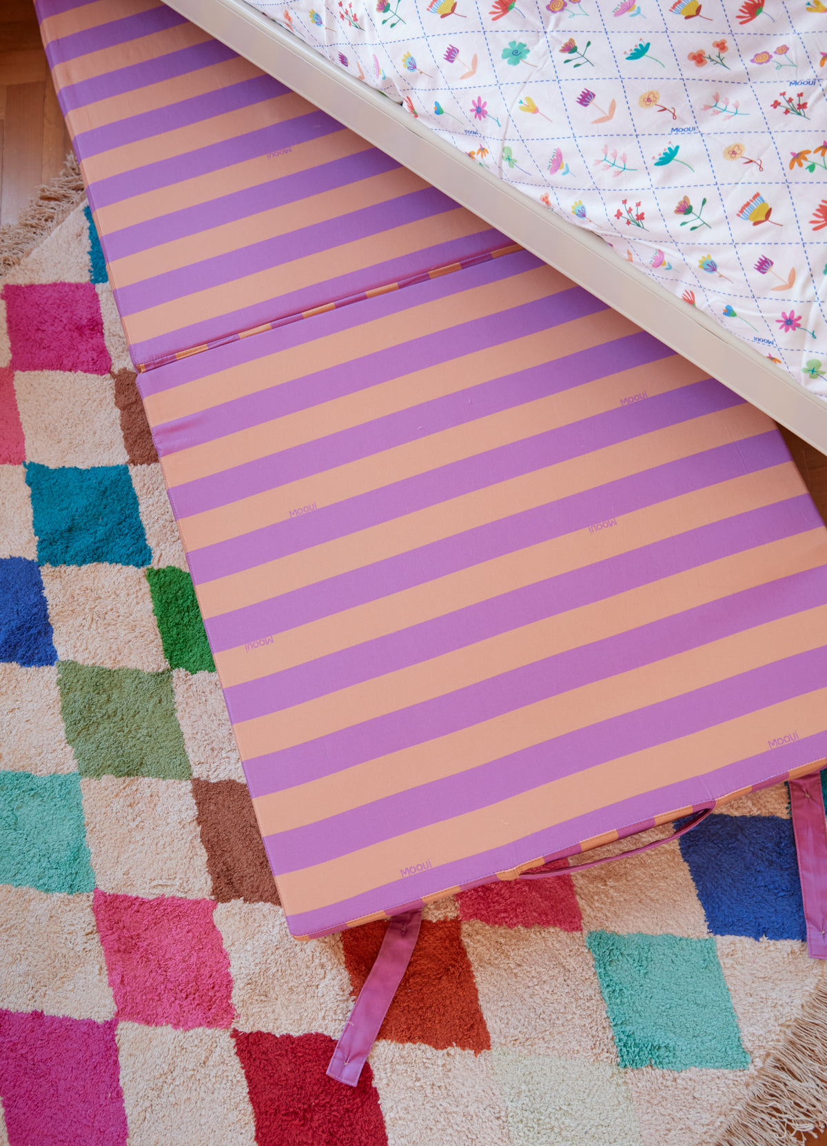 O Colchonete Dobrável Listrado Violeta une praticidade e conforto em um só produto. Feito com capa 100% algodão e enchimento de espuma D28, oferece ótimo suporte para uso como colchão auxiliar, na brinquedoteca ou para visitas. É dobrável em duas partes, possui capa removível, espuma forrada, além de duas alças de fechamento e duas alças de mão para transportar com facilidade. Uma solução versátil para qualquer ambiente.