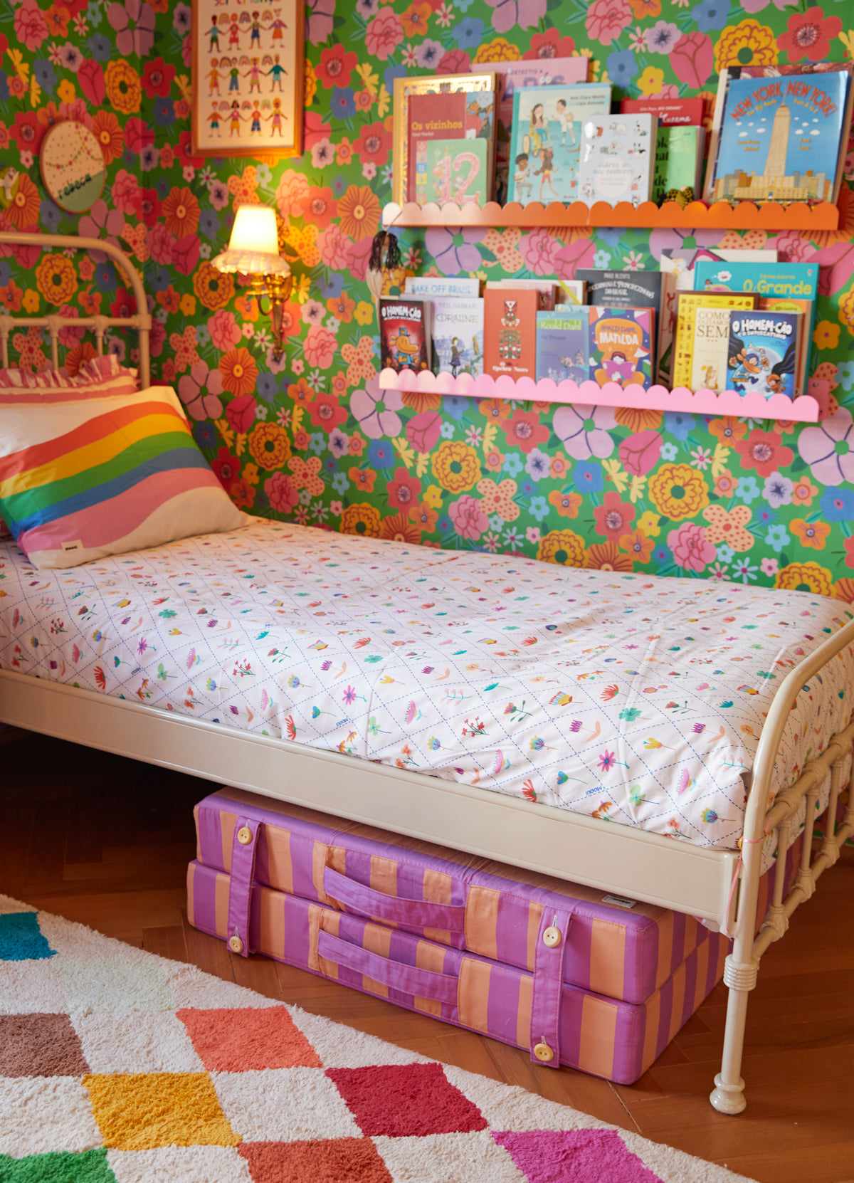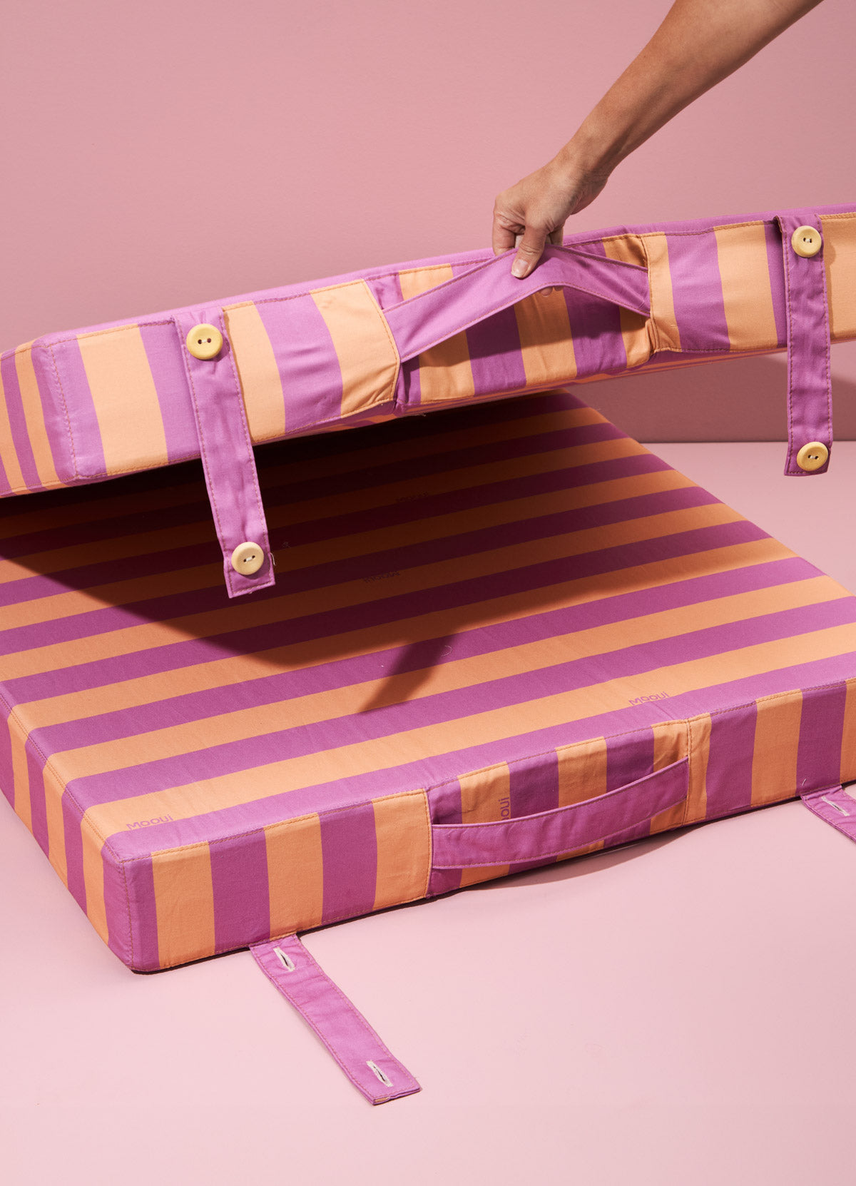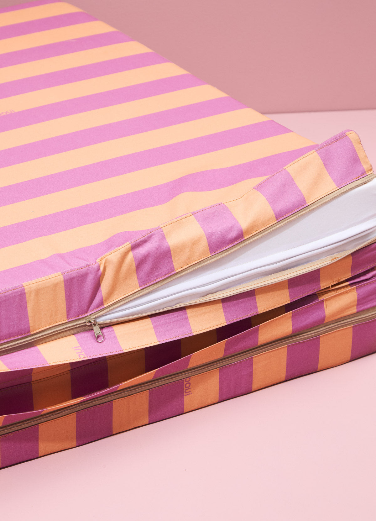 O Colchonete Dobrável Listrado Violeta une praticidade e conforto em um só produto. Feito com capa 100% algodão e enchimento de espuma D28, oferece ótimo suporte para uso como colchão auxiliar, na brinquedoteca ou para visitas. É dobrável em duas partes, possui capa removível, espuma forrada, além de duas alças de fechamento e duas alças de mão para transportar com facilidade. Uma solução versátil para qualquer ambiente.