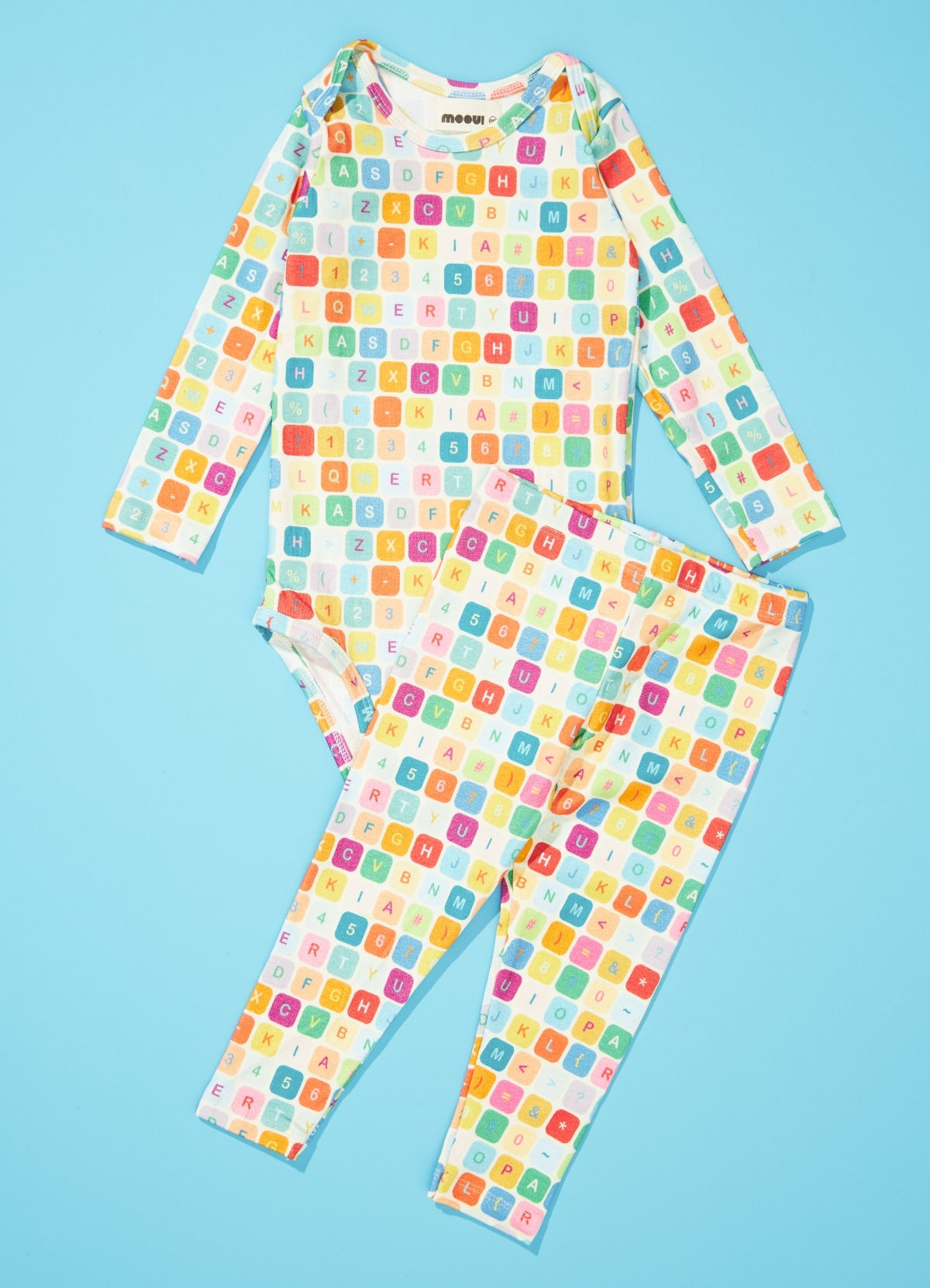 O Conjunto Body Manga Longa Máquina de Escrever é a combinação perfeita para uma boa noite de sono, é divertido, graças ao toque especial da estampa exclusiva MOOUI, e extremamente confortável pela qualidade do tecido. Confeccionado em malha suedine de algodão, o kit com body manga longa e mais a calça legging bebê é pura maciez, para trazer muito conforto e liberdade na hora de dormir.
