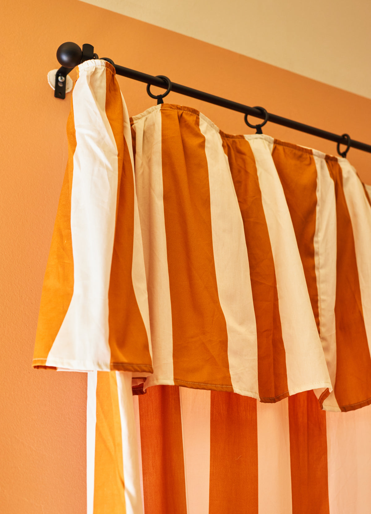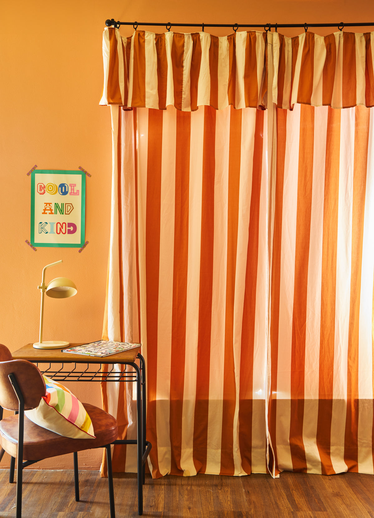 A Cortina com Babado Listrado Caramelo da MOOUI traz cor e personalidade para qualquer ambiente, seja sala ou quarto. Confeccionada em algodão acetinado 230 fios, protege contra a iluminação externa enquanto adiciona estilo à decoração.
