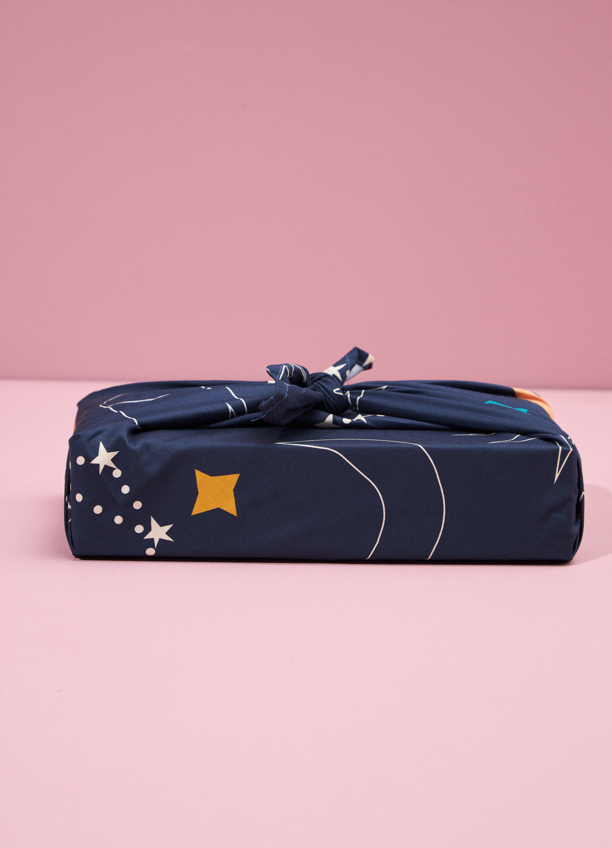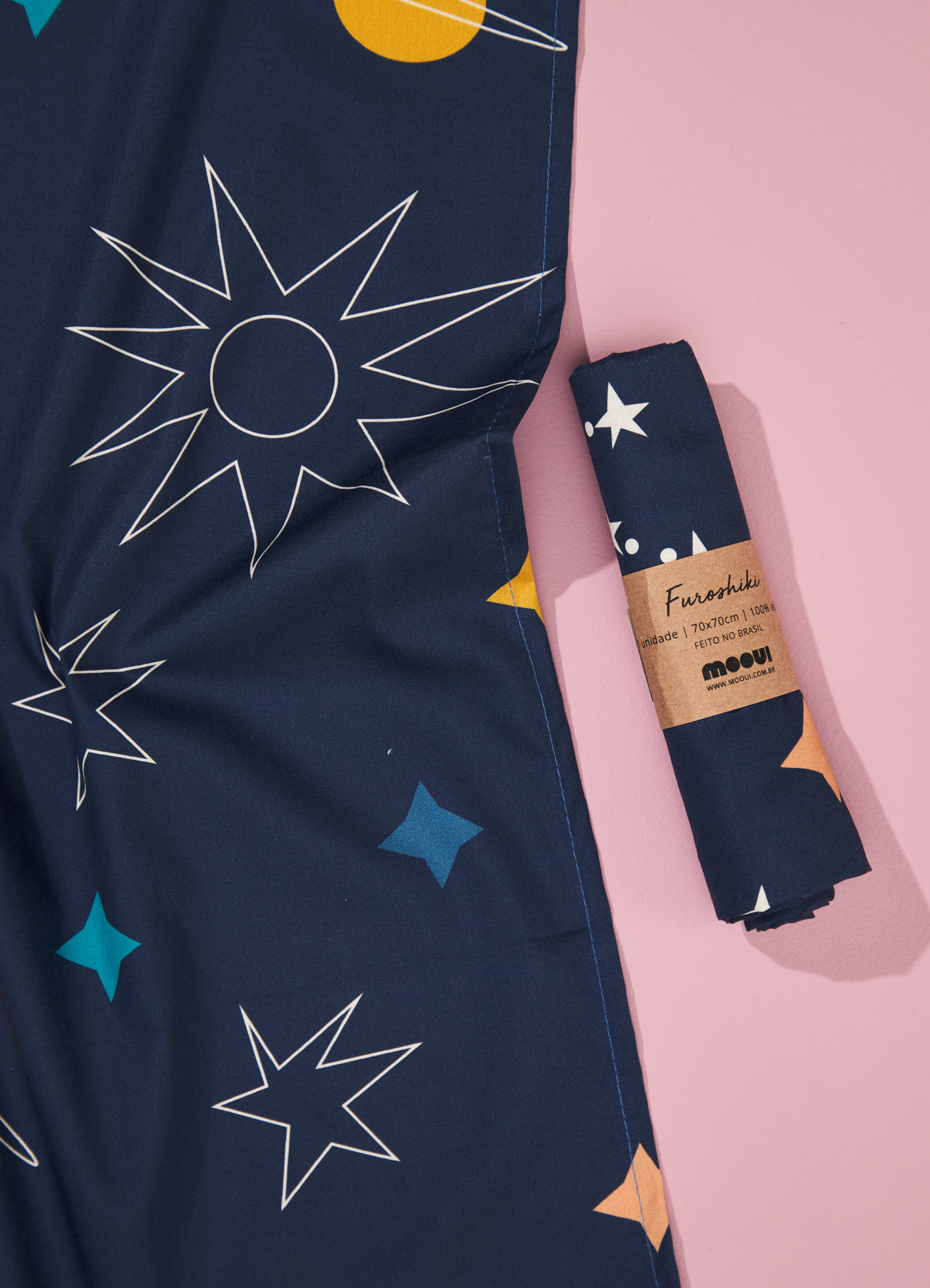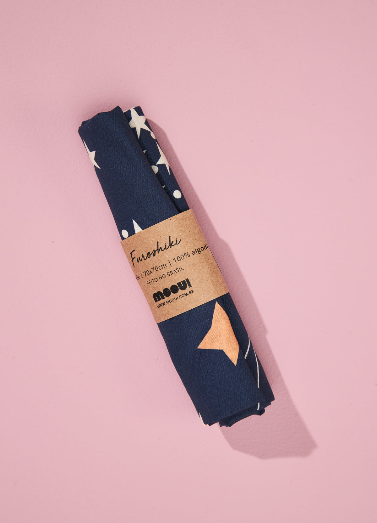 O Furoshiki Céu Estrelado da MOOUI é uma versátil alternativa sustentável às embalagens descartáveis. Esta técnica japonesa de embrulho em tecido permite múltiplos usos: presente ecológico, ecobag, transporte de garrafas ou marmitas.