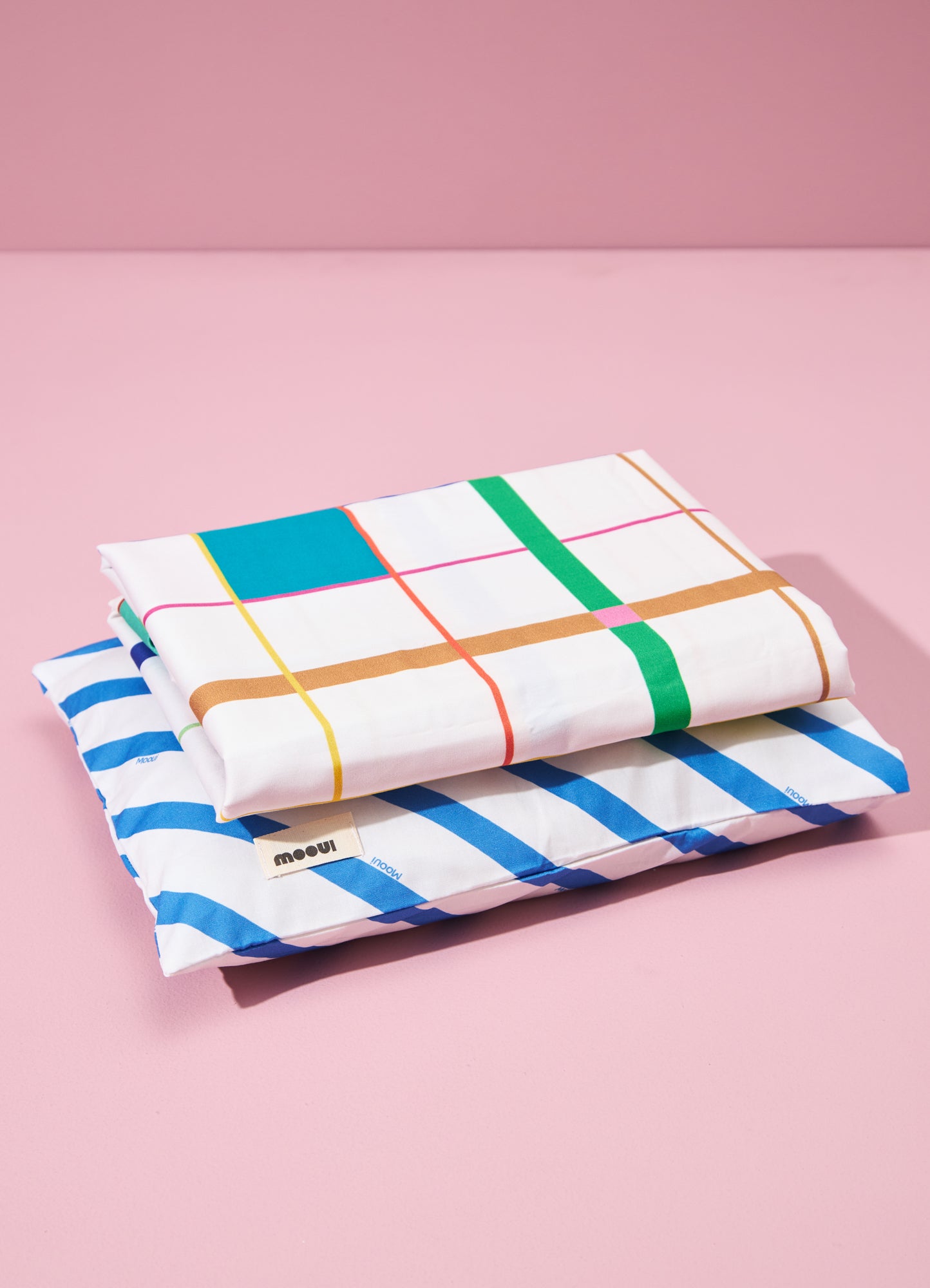 O Jogo de Cama Berço Duo Alegria ao Quadrado da MOOUI reúne duas peças essenciais para o conforto do sono do bebê: fronha infantil e lençol de elástico para berço. Este conjunto prático proporciona uma composição harmoniosa com estampas coordenadas que transformam o espaço do bebê.