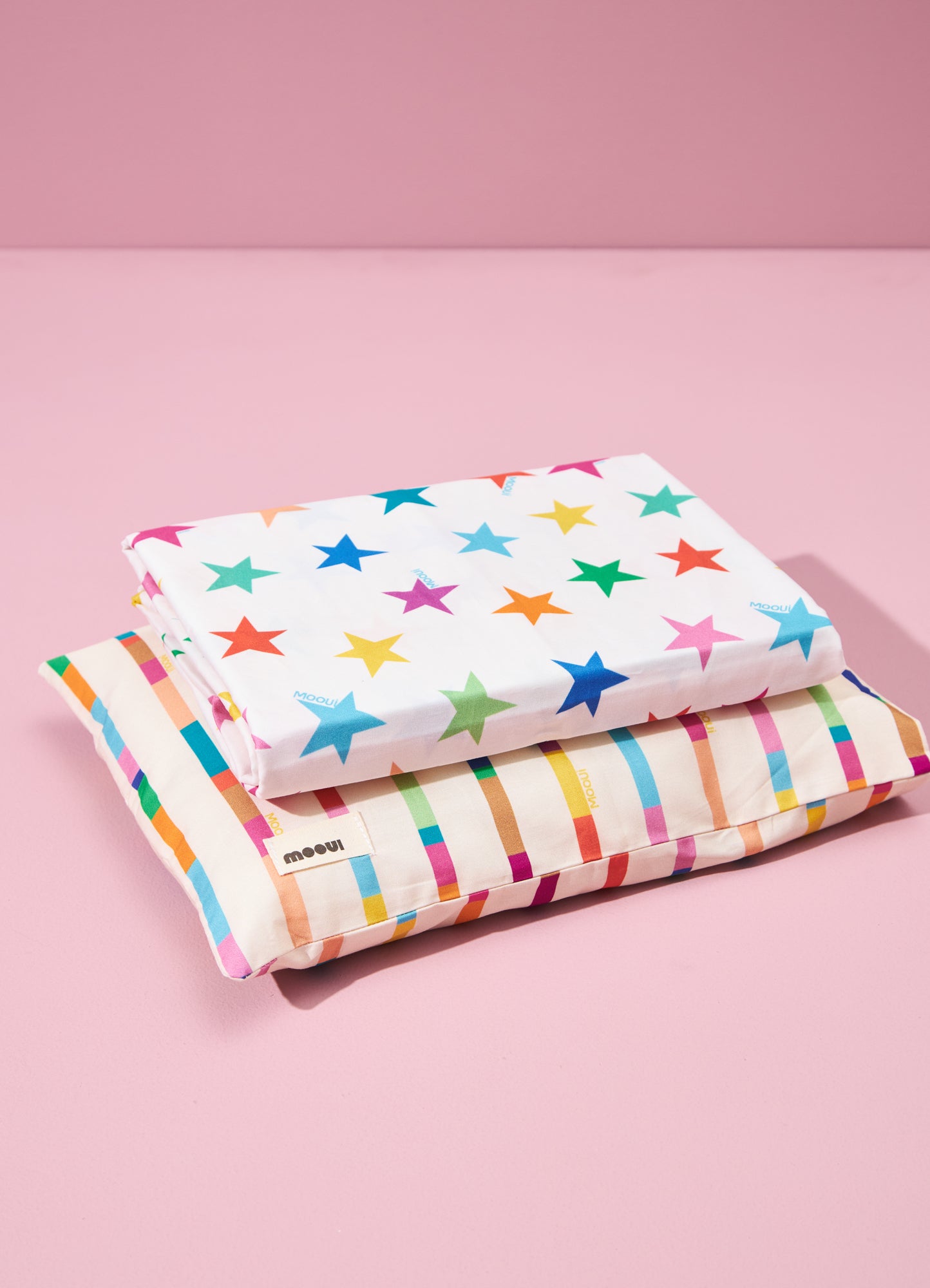 O Jogo de Cama Berço Duo Estrelitas da MOOUI reúne duas peças essenciais para o conforto do sono do bebê: fronha infantil e lençol de elástico para berço. Este conjunto prático proporciona uma composição harmoniosa com estampas coordenadas que transformam o espaço do bebê.