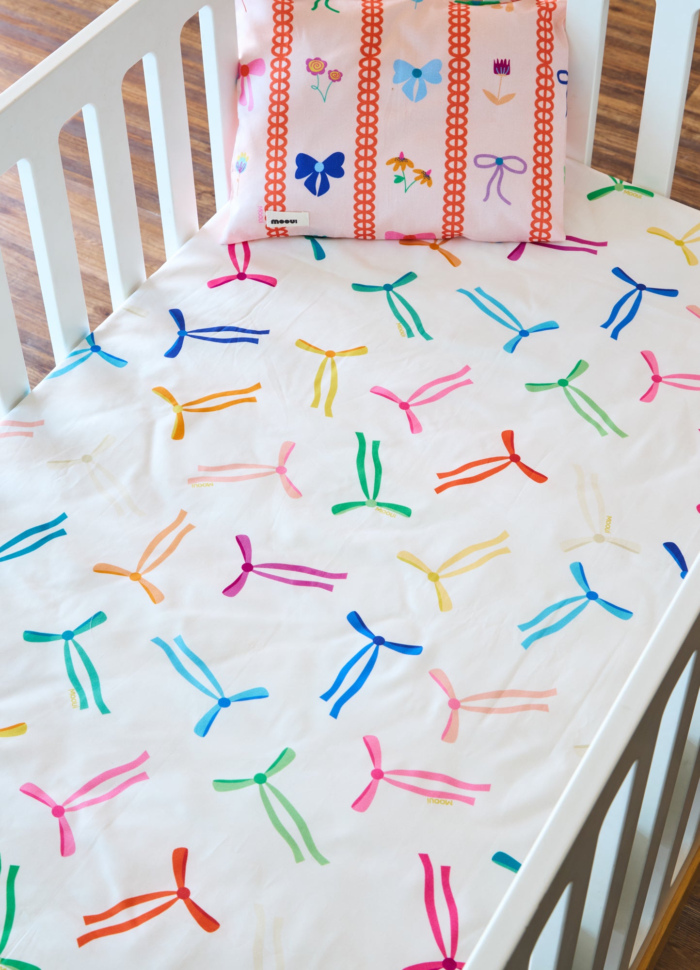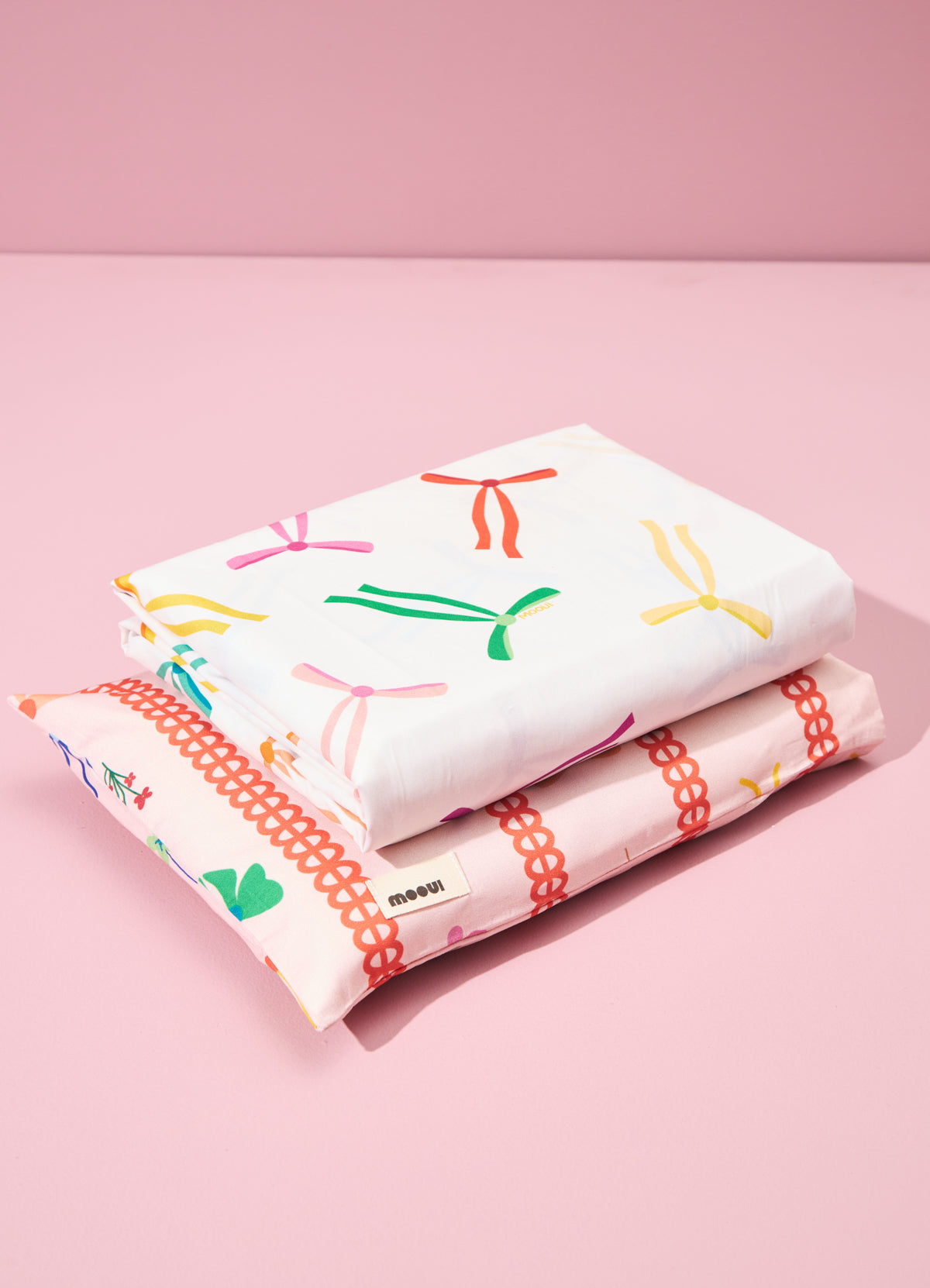 O Jogo de Cama Berço Duo Lacinhos da MOOUI reúne duas peças essenciais para o conforto do sono do bebê: fronha infantil e lençol de elástico para berço. Este conjunto prático proporciona uma composição harmoniosa com estampas coordenadas que transformam o espaço do bebê.