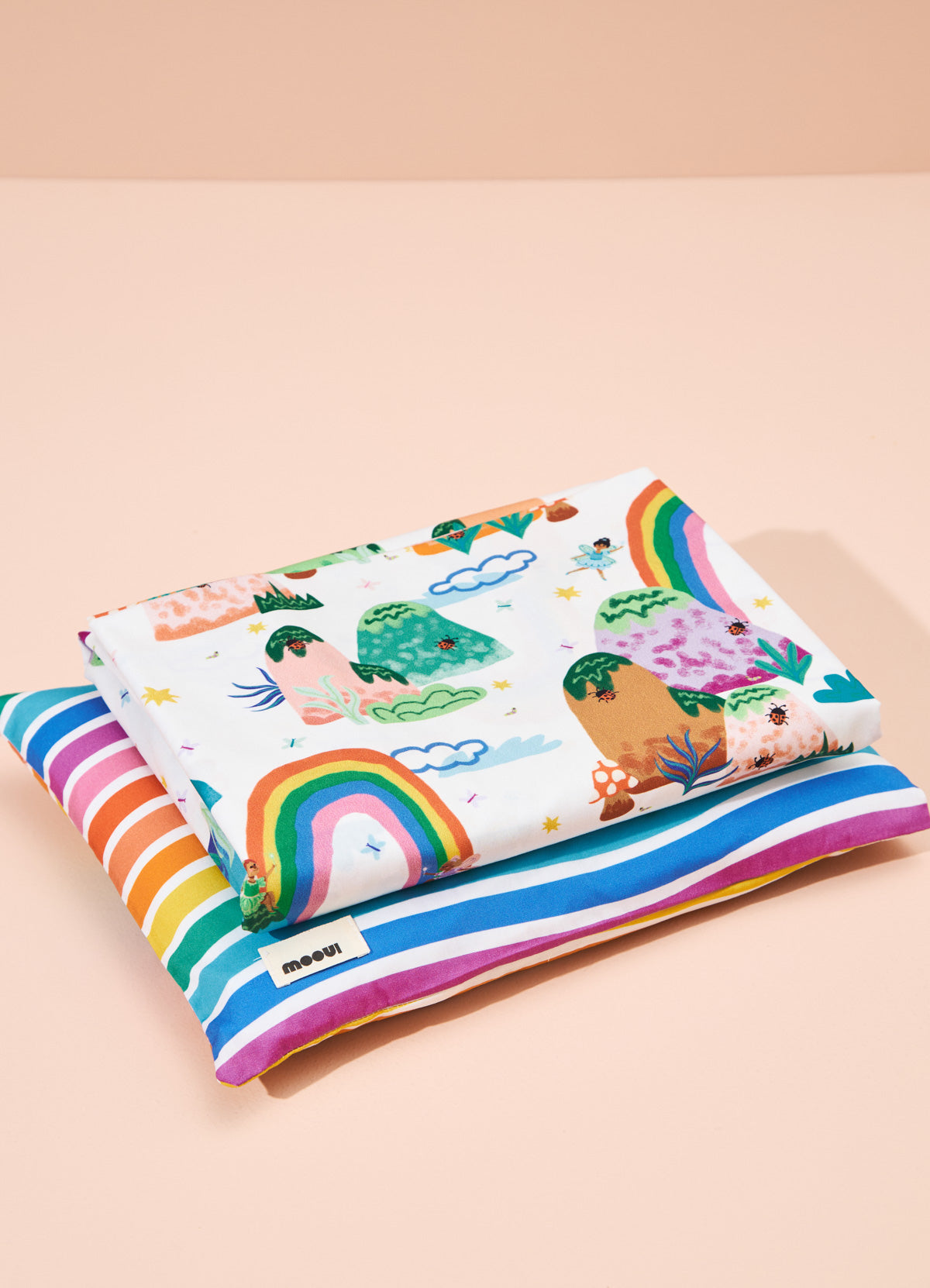 O Jogo de Cama Berço Duo Listrado Rainbow da MOOUI reúne duas peças essenciais para o conforto do sono do bebê: fronha infantil e lençol de elástico para berço. Este conjunto prático proporciona uma composição harmoniosa com estampas coordenadas que transformam o espaço do bebê.