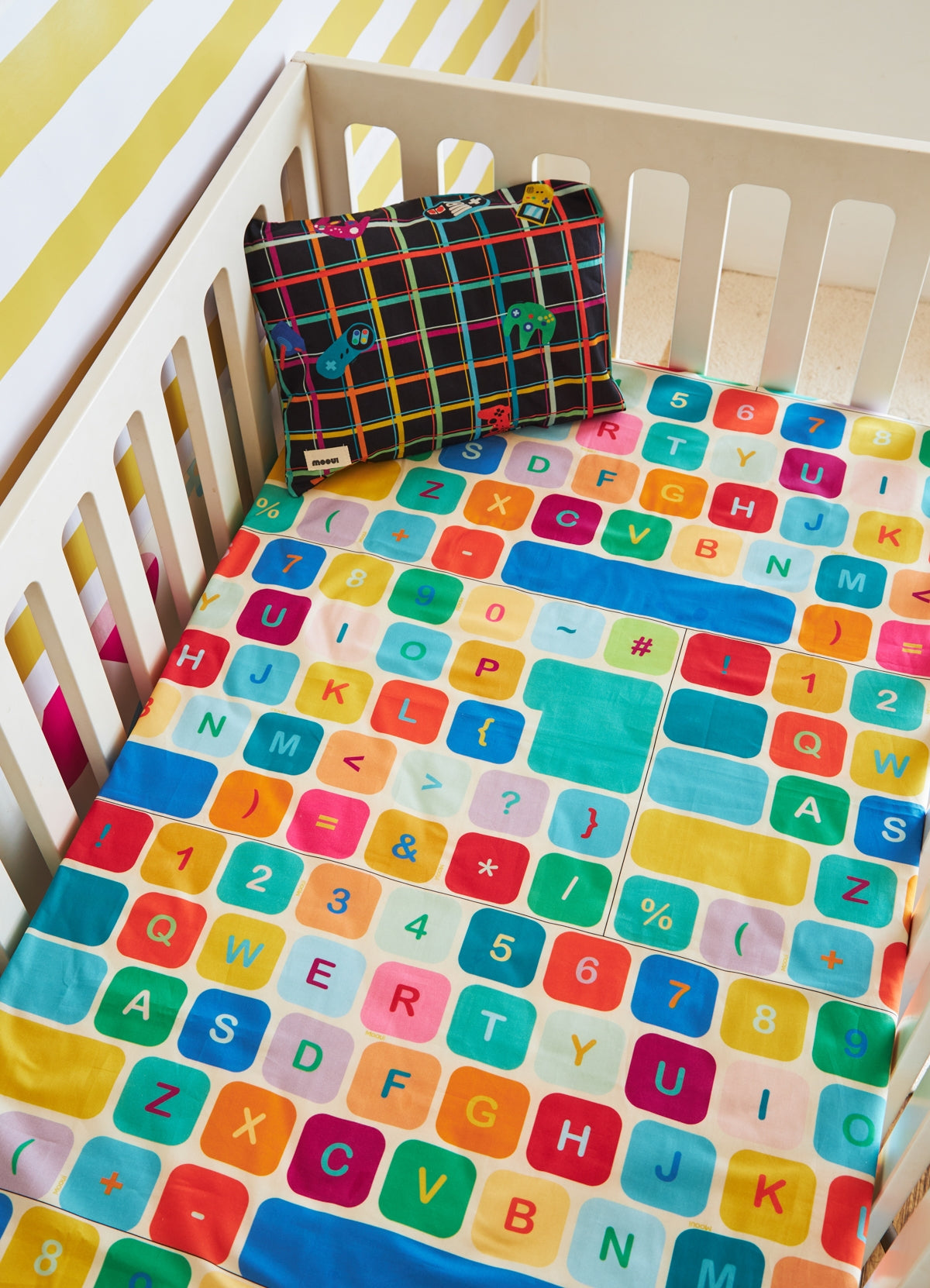 O Jogo de Cama Berço Duo Máquina de Escrever da MOOUI reúne duas peças essenciais para o conforto do sono do bebê: fronha infantil e lençol de elástico para berço. Este conjunto prático proporciona uma composição harmoniosa com estampas coordenadas que transformam o espaço do bebê.