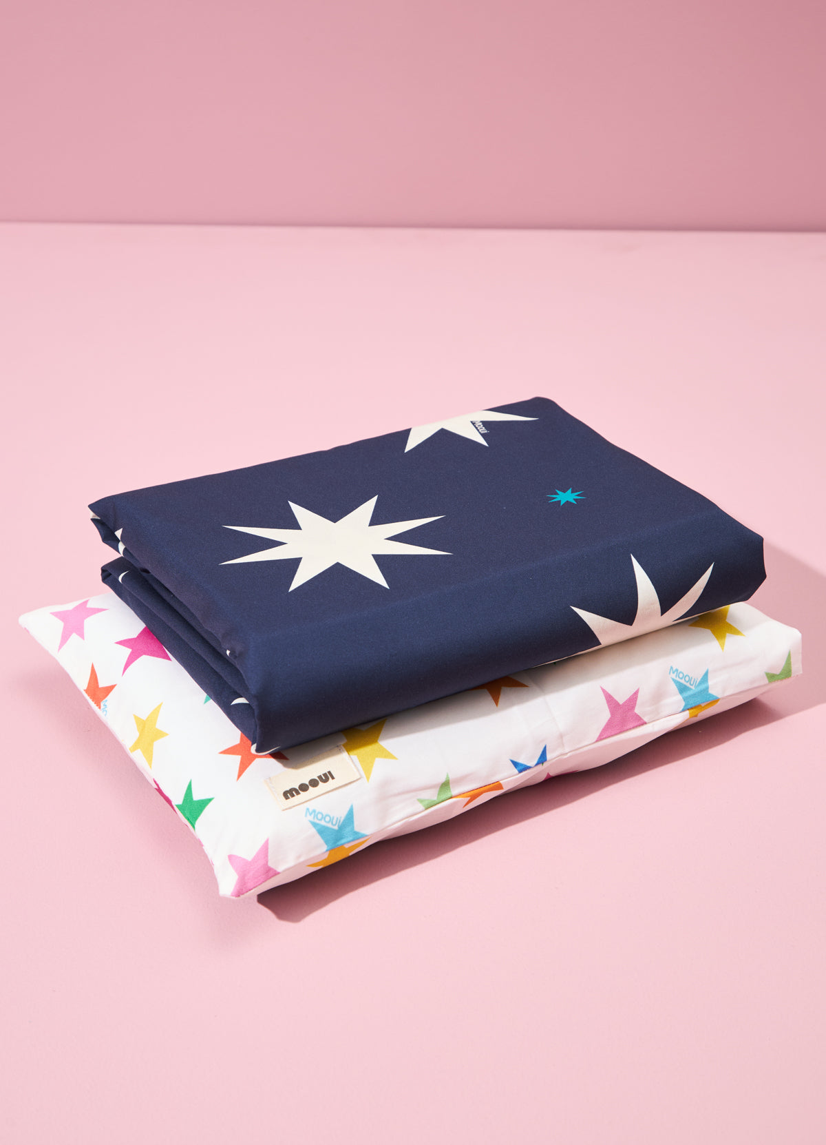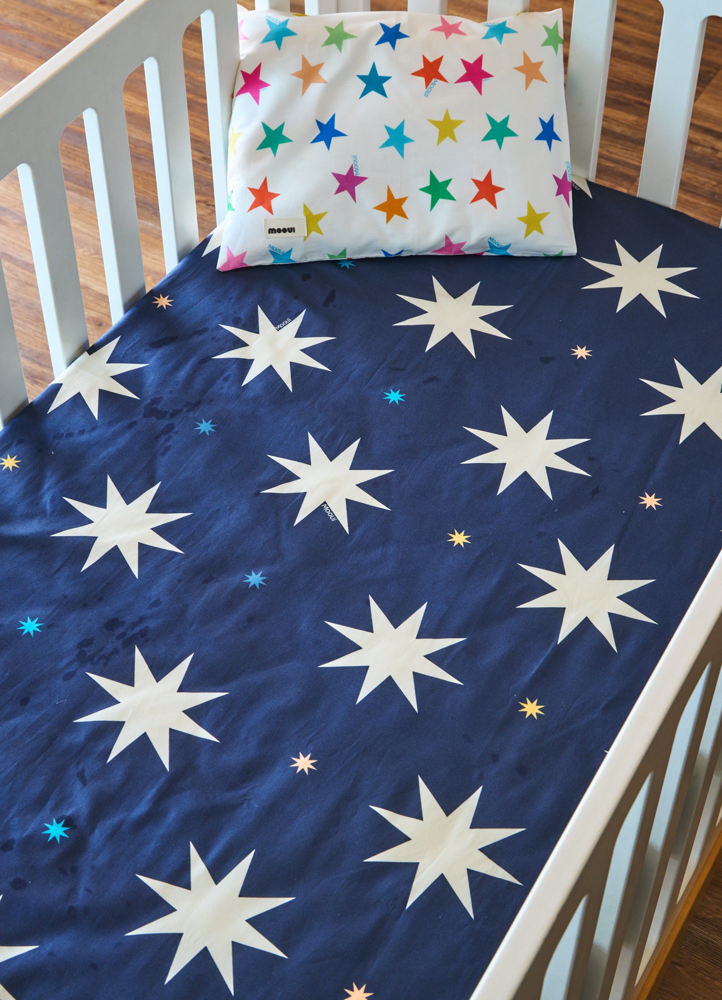 O Jogo de Cama Berço Duo Noite de Luar da MOOUI reúne duas peças essenciais para o conforto do sono do bebê: fronha infantil e lençol de elástico para berço. Este conjunto prático proporciona uma composição harmoniosa com estampas coordenadas que transformam o espaço do bebê.