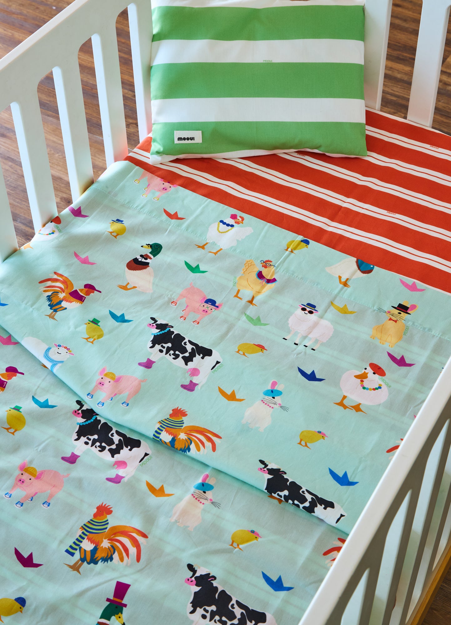 O Jogo de Cama Berço Trio Bichinhos da Fazenda da MOOUI reúne três peças essenciais para o conforto do sono do bebê: fronha infantil, lençol de elástico e lençol de cima. Este conjunto completo proporciona praticidade aos pais e aconchego para os pequenos em seus primeiros anos.