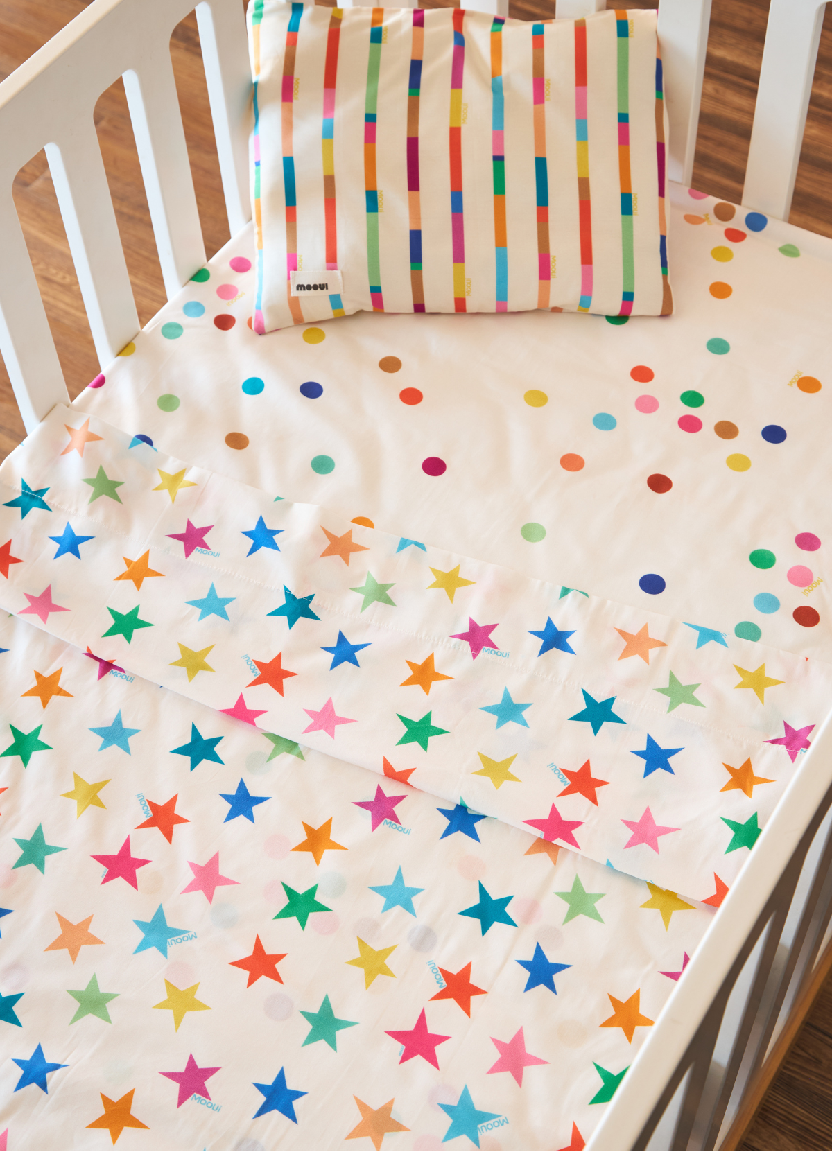 O Jogo de Cama Berço Trio Estrelitas da MOOUI reúne três peças essenciais para o conforto do sono do bebê: fronha infantil, lençol de elástico e lençol de cima. Este conjunto completo proporciona praticidade aos pais e aconchego para os pequenos em seus primeiros anos.