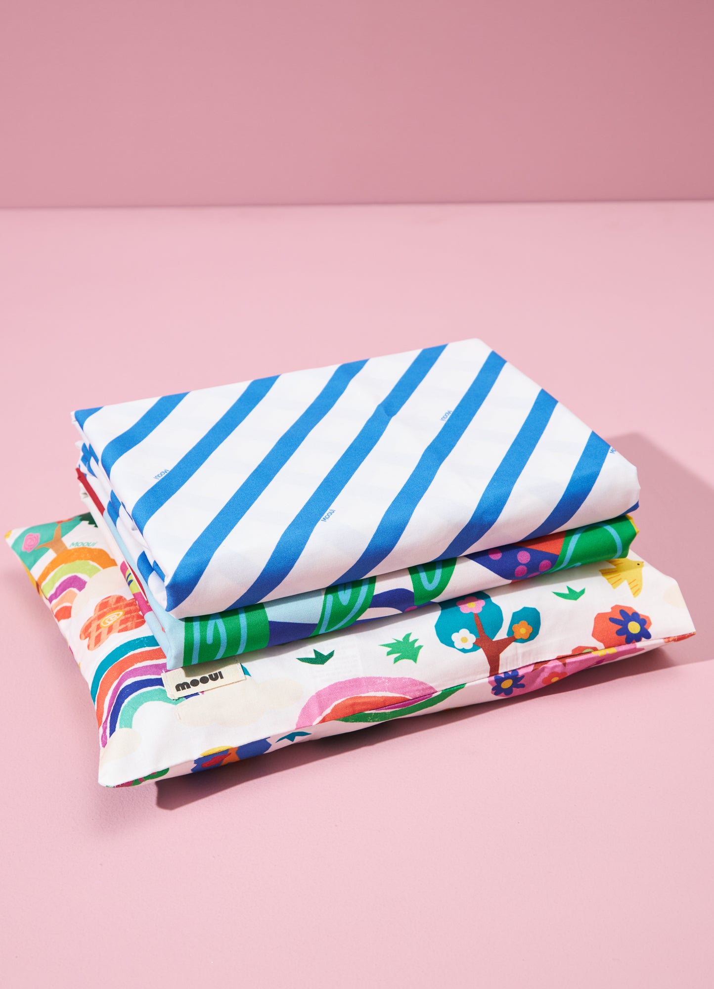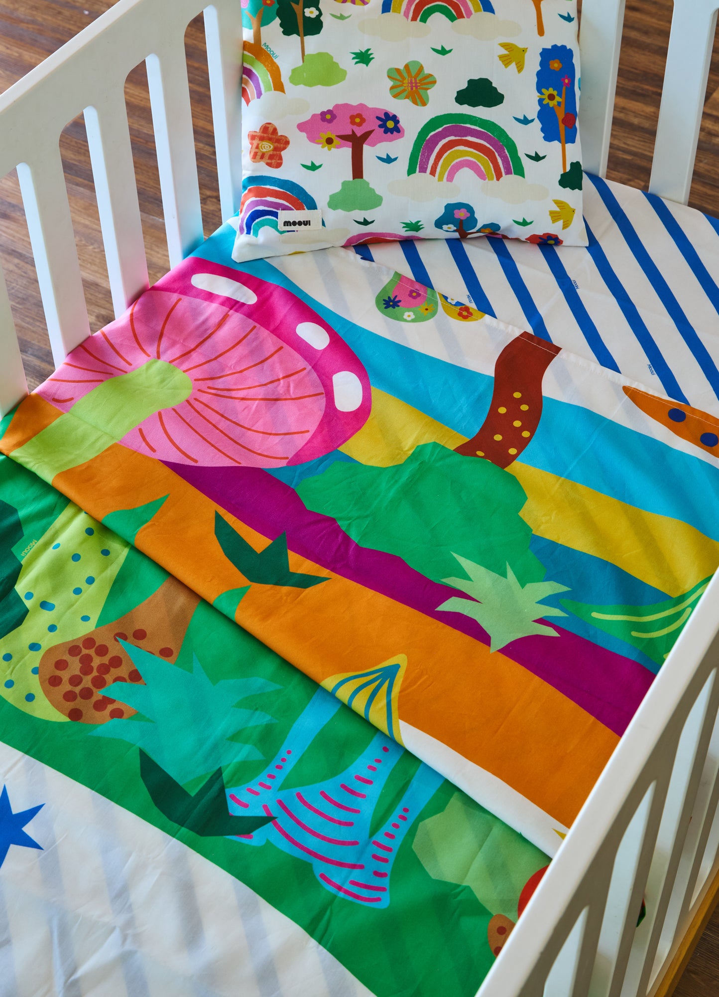 O Jogo de Cama Berço Trio Festa de Cogumelos da MOOUI reúne três peças essenciais para o conforto do sono do bebê: fronha infantil, lençol de elástico e lençol de cima. Este conjunto completo proporciona praticidade aos pais e aconchego para os pequenos em seus primeiros anos.