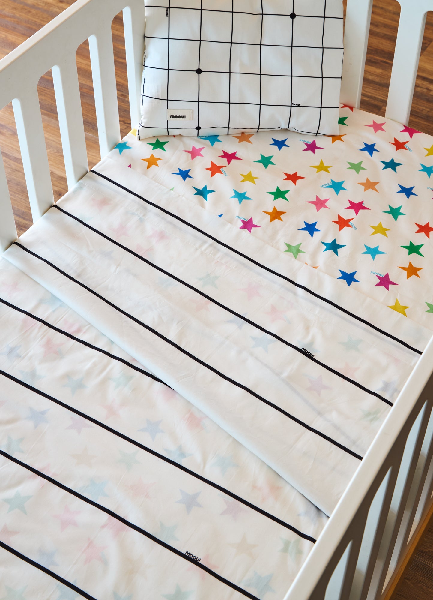 O Jogo de Cama Berço Trio Listrado Onyx da MOOUI reúne três peças essenciais para o conforto do sono do bebê: fronha infantil, lençol de elástico e lençol de cima. Este conjunto completo proporciona praticidade aos pais e aconchego para os pequenos em seus primeiros anos.