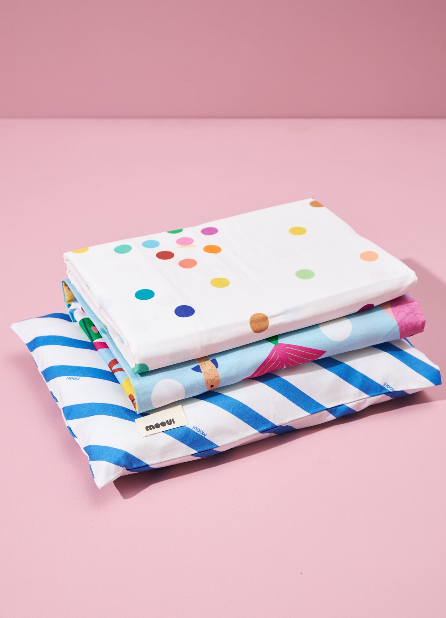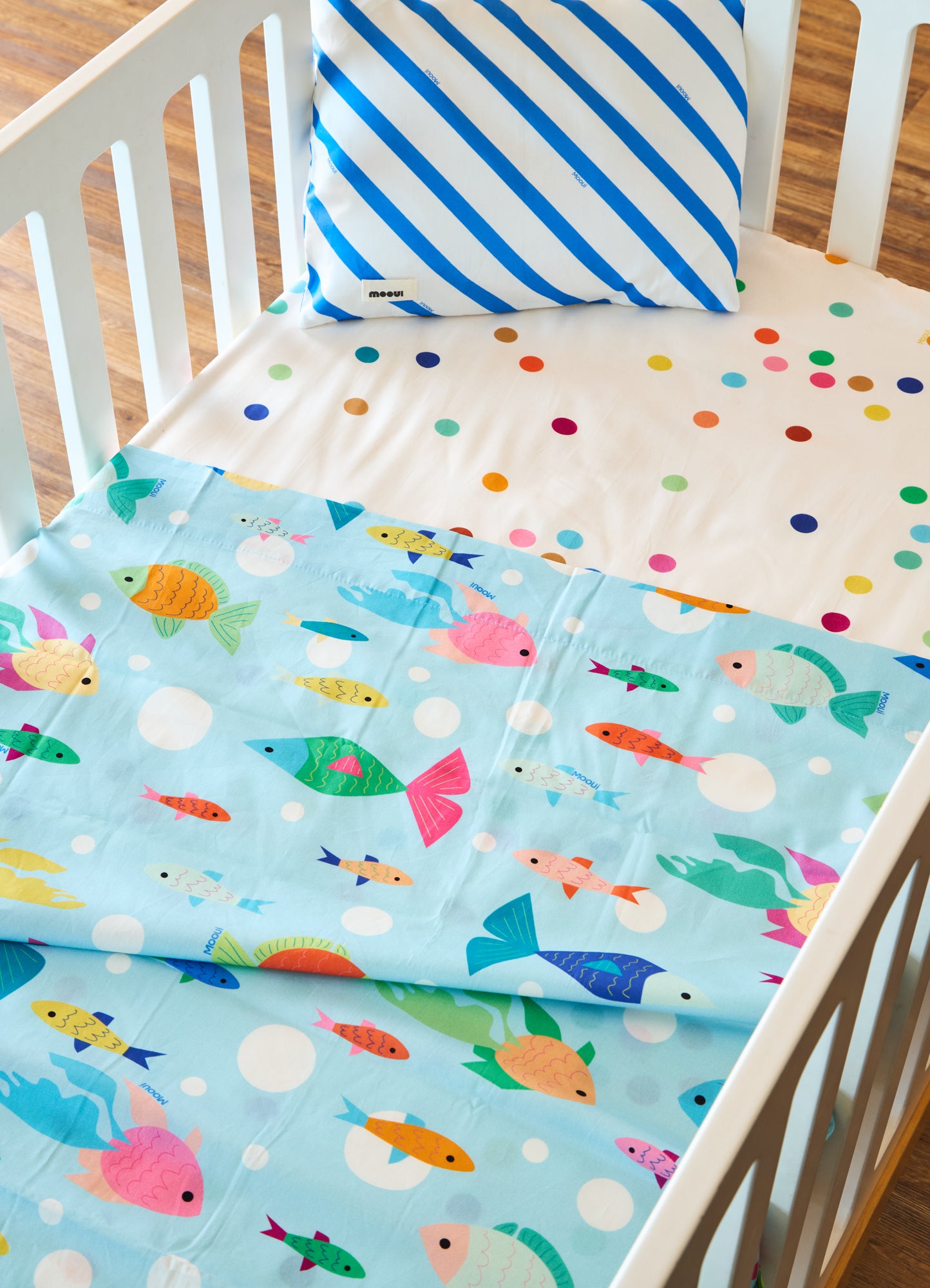 O Jogo de Cama Berço Trio Peixinhos do Oceano da MOOUI reúne três peças essenciais para o conforto do sono do bebê: fronha infantil, lençol de elástico e lençol de cima. Este conjunto completo proporciona praticidade aos pais e aconchego para os pequenos em seus primeiros anos.