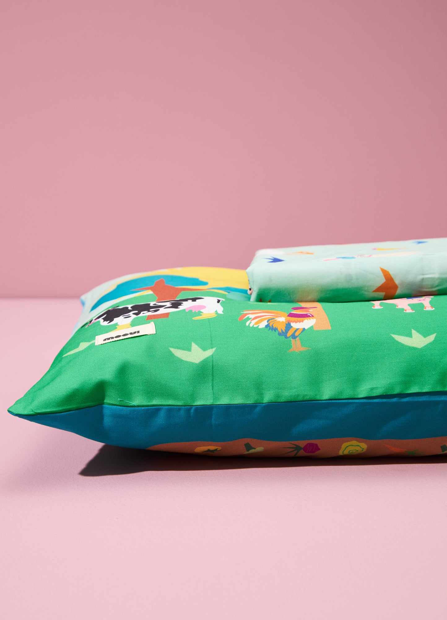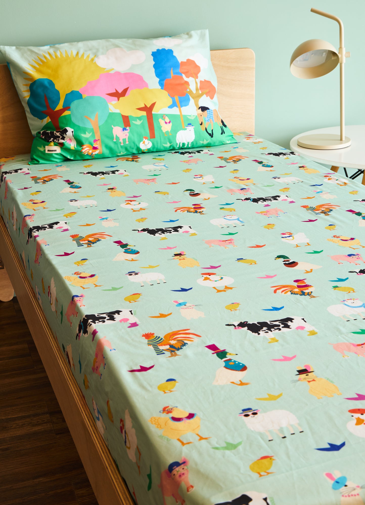 O Jogo de Cama Infantil Duo Bichinhos da Fazenda da MOOUI reúne duas peças essenciais para o conforto noturno das crianças: fronha e lençol de elástico. Com estampas coordenadas que se complementam perfeitamente, este conjunto proporciona uma decoração coesa e encantadora para o quarto infantil.