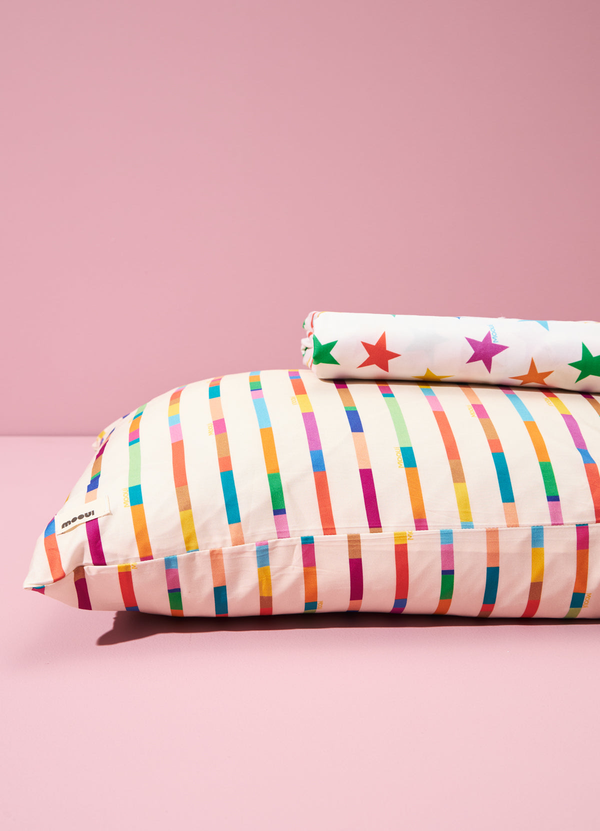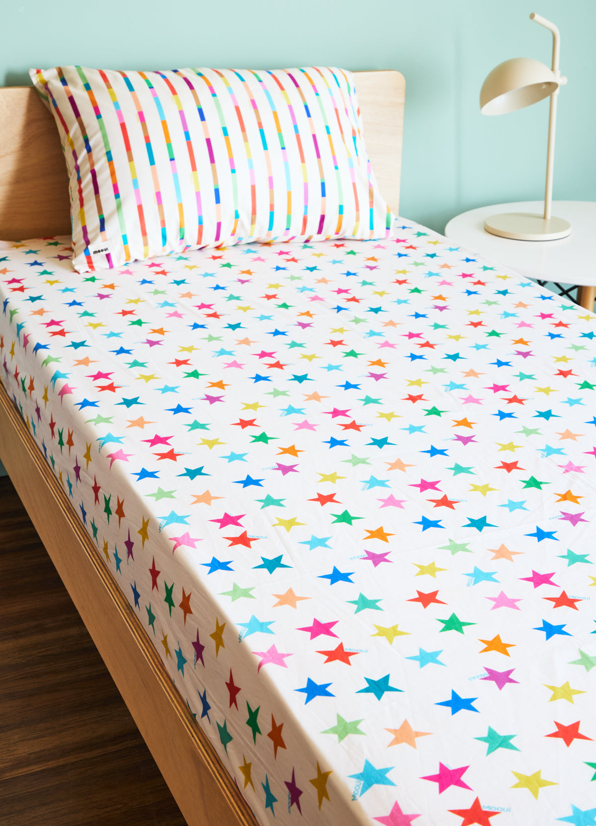 O Jogo de Cama Infantil Duo Estrelitas da MOOUI reúne duas peças essenciais para o conforto noturno das crianças: fronha e lençol de elástico. Com estampas coordenadas que se complementam perfeitamente, este conjunto proporciona uma decoração coesa e encantadora para o quarto infantil.