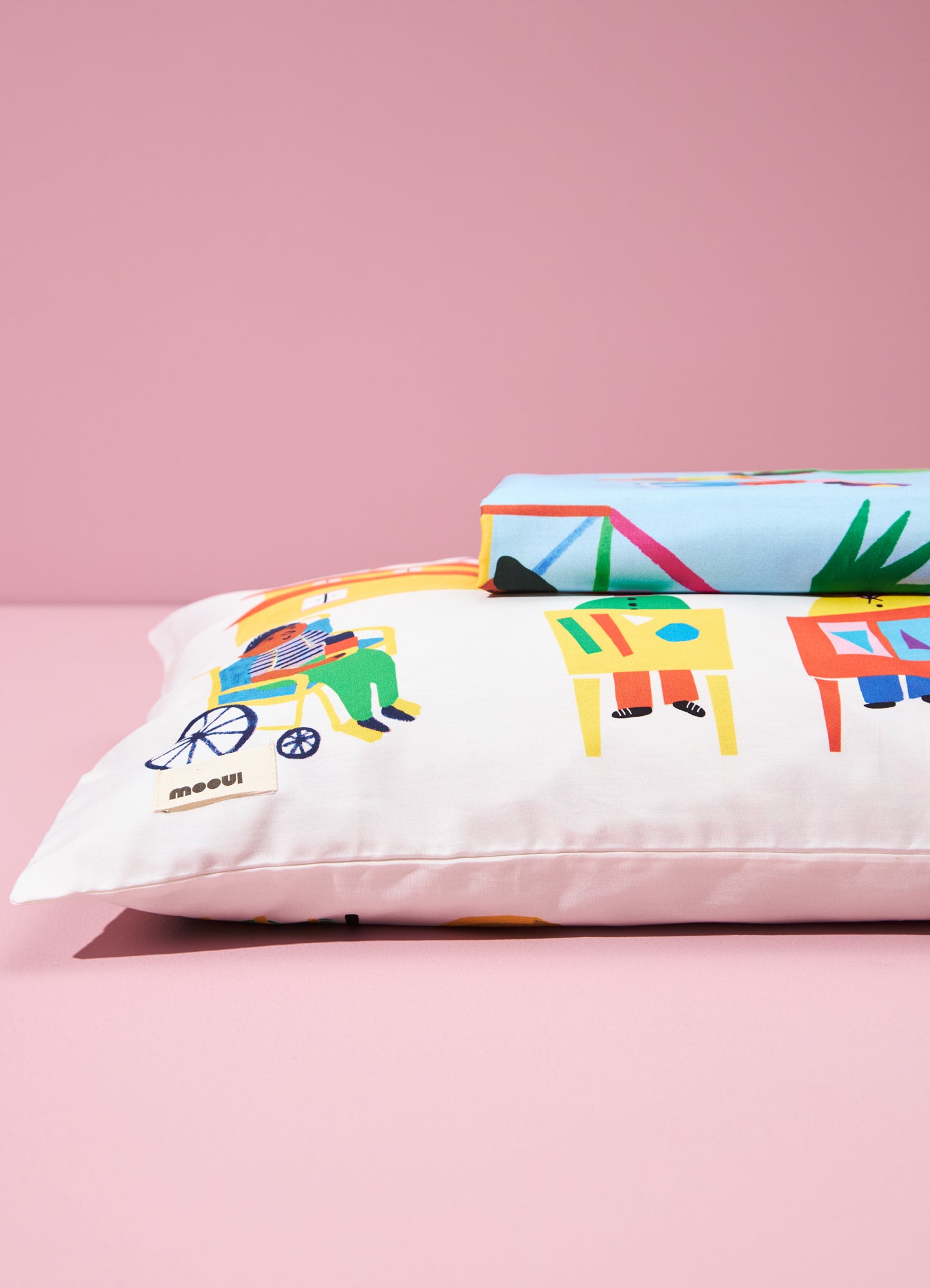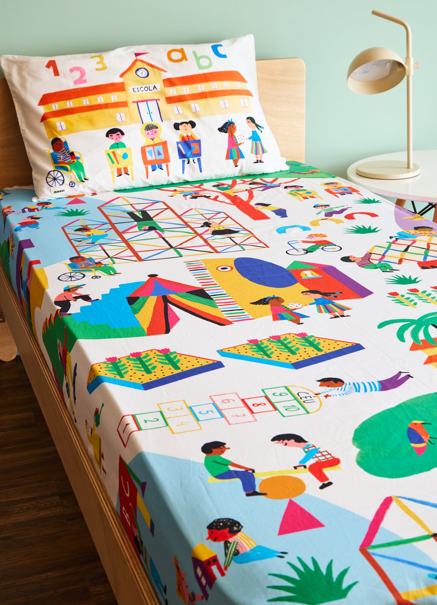 O Jogo de Cama Infantil Duo Ir à Escola da MOOUI reúne duas peças essenciais para o conforto noturno das crianças: fronha e lençol de elástico. Com estampas coordenadas que se complementam perfeitamente, este conjunto proporciona uma decoração coesa e encantadora para o quarto infantil.