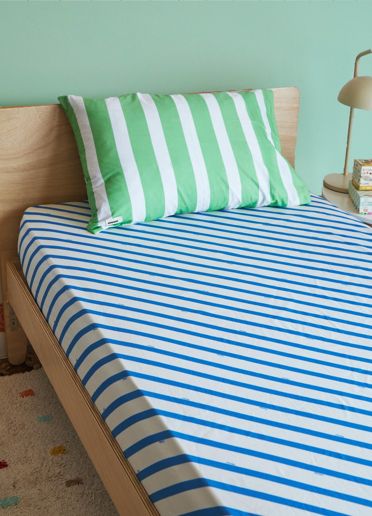 O Jogo de Cama Infantil Duo Listrado Anil da MOOUI reúne duas peças essenciais para o conforto noturno das crianças: fronha e lençol de elástico. Com estampas coordenadas que se complementam perfeitamente, este conjunto proporciona uma decoração coesa e encantadora para o quarto infantil.