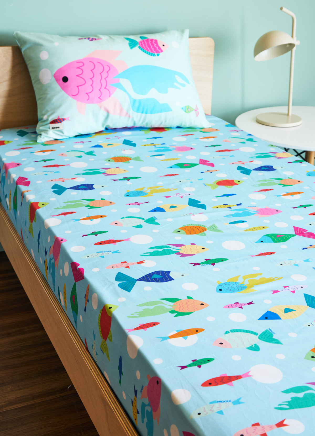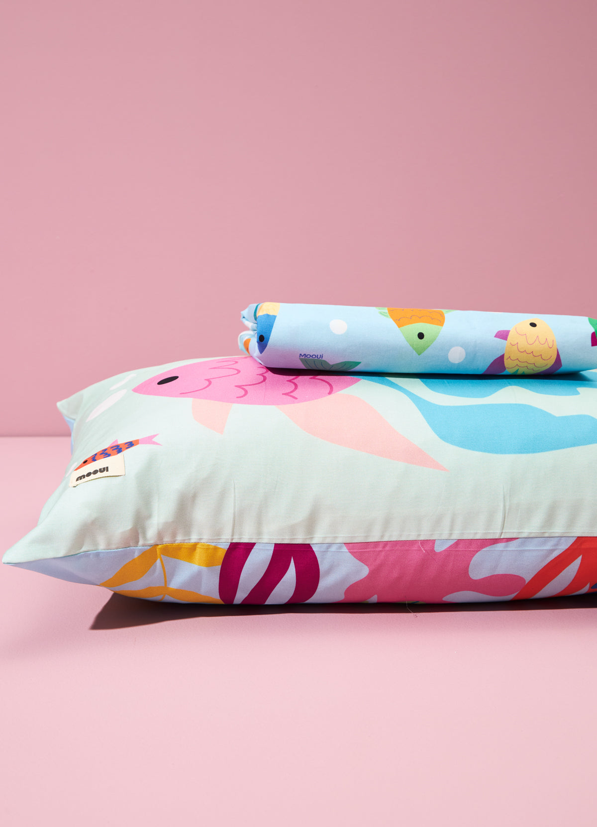O Jogo de Cama Infantil Duo Peixinhos do Oceano da MOOUI reúne duas peças essenciais para o conforto noturno das crianças: fronha e lençol de elástico. Com estampas coordenadas que se complementam perfeitamente, este conjunto proporciona uma decoração coesa e encantadora para o quarto infantil.