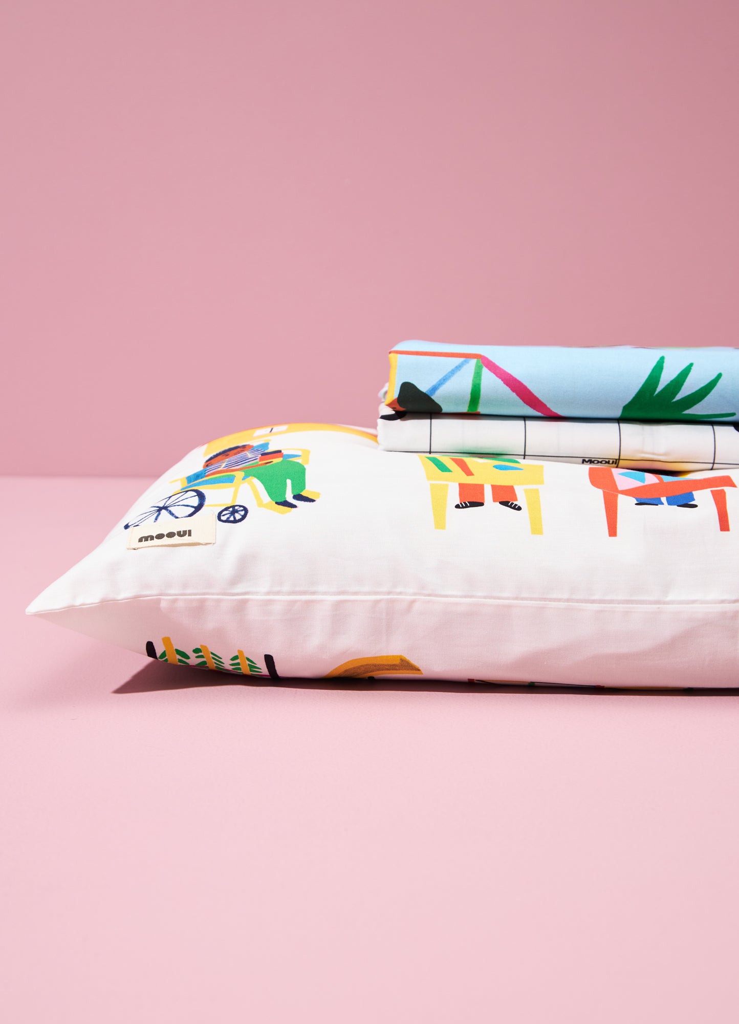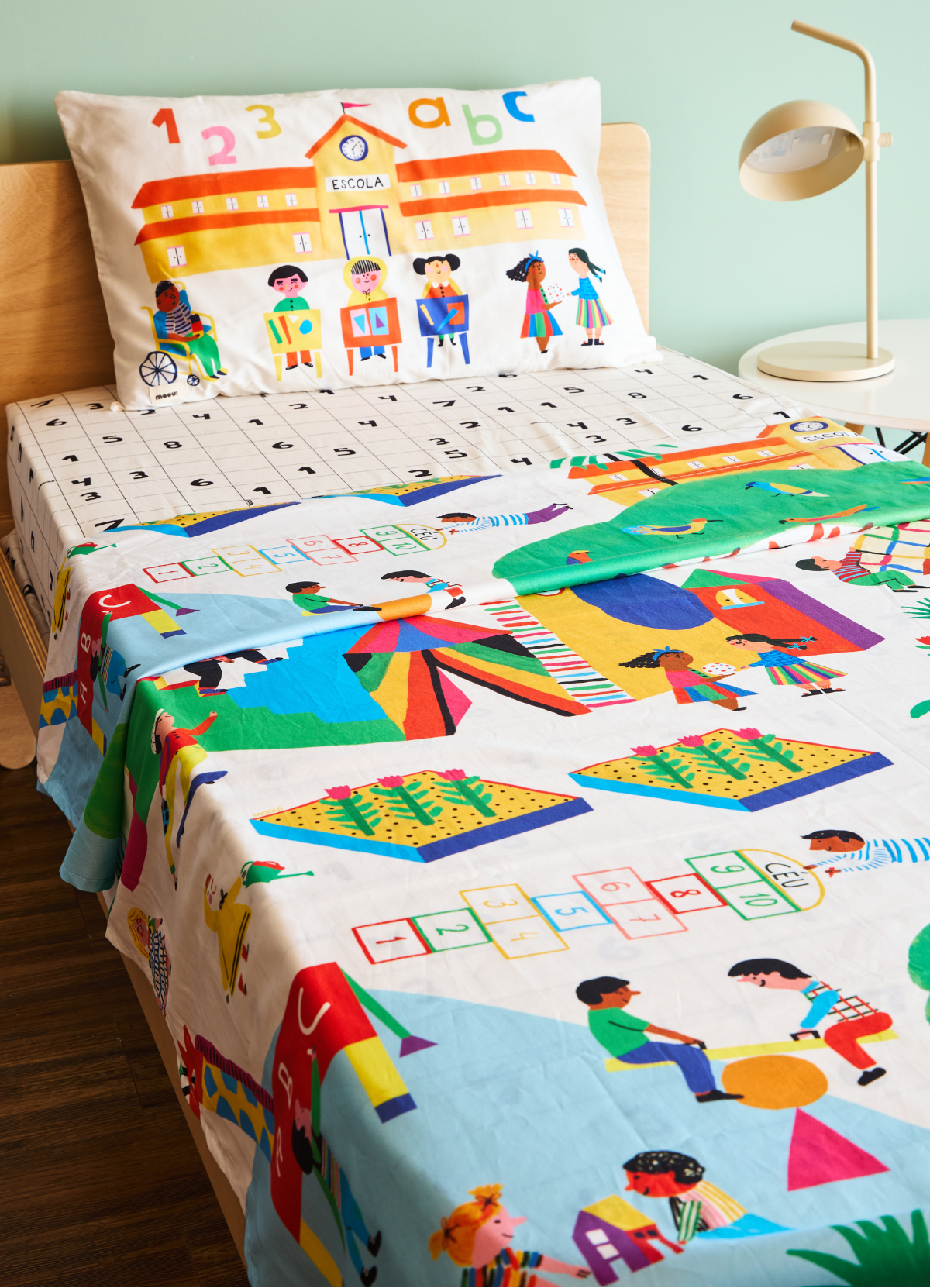 O Jogo de Cama Infantil Trio Ir à Escola da MOOUI oferece um conjunto completo para o conforto noturno das crianças: fronha, lençol de elástico e lençol de cima. Esta combinação perfeita proporciona praticidade para os pais e uma experiência de sono aconchegante para os pequenos.
