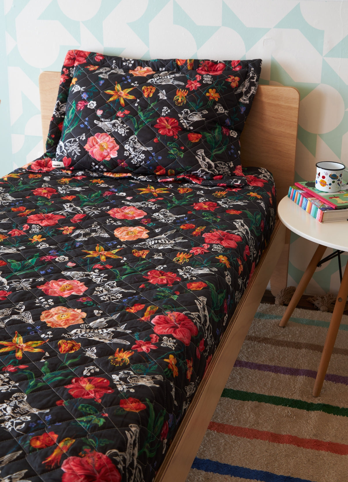 O Jogo de Colcha Elástico Floral Noite Nathalie Lété é encantador e tem o poder de transformar a cama na estrela da decoração do quarto. Seu conforto vem da maciez do algodão, e seu estilo do design e do acabamento matelassado. Composto por 2 peças - colcha de elástico e porta travesseiro, o jogo é a escolha ideal para quem quer uma cama alegre e arrumada. O elástico ao redor de toda a colcha envolve perfeitamente o colchão.