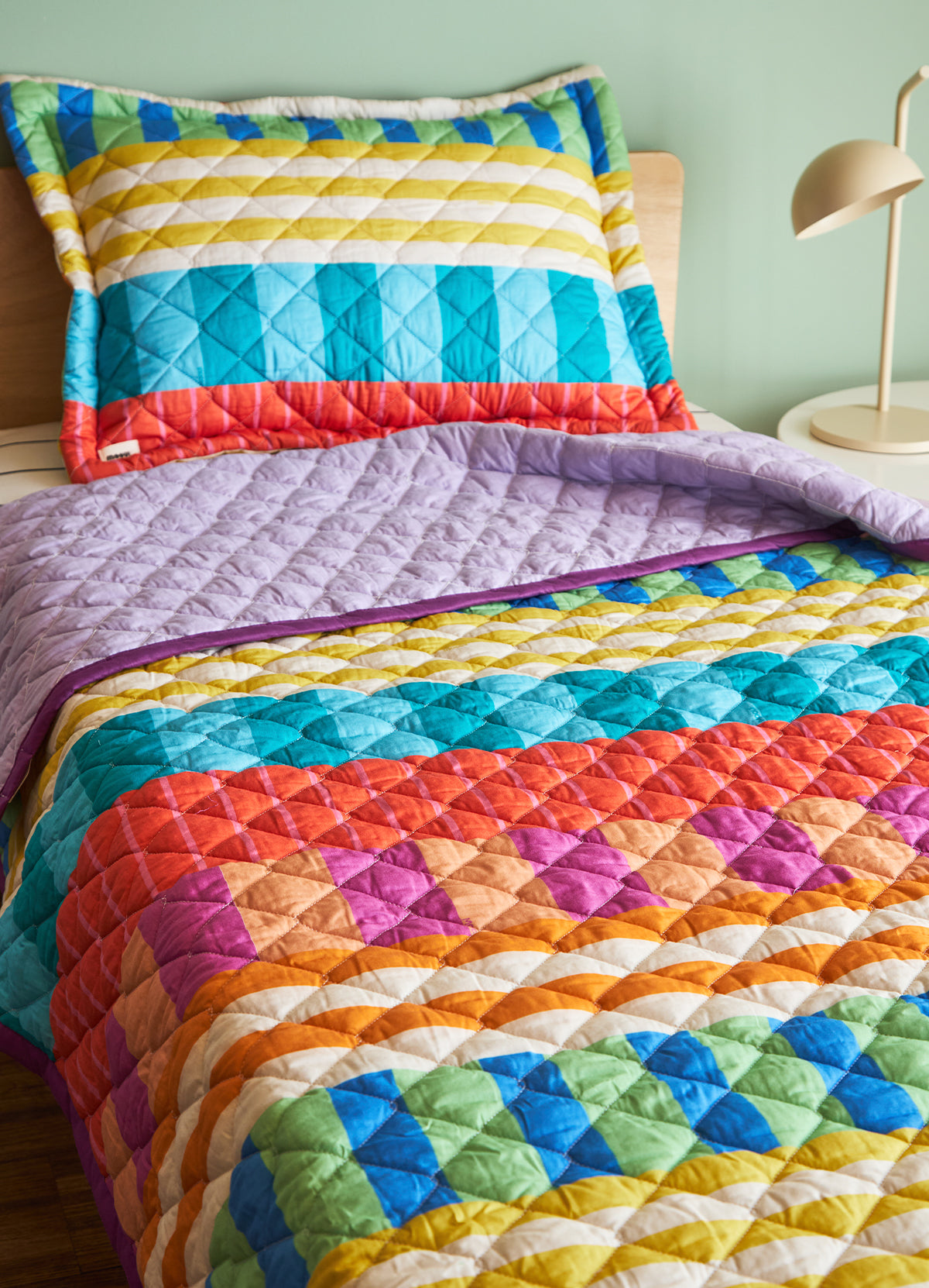 O Jogo de Colcha Infantil Colcha de Retalhos da MOOUI transforma o momento de descanso em uma experiência visual encantadora. O conjunto inclui colcha matelassada e porta travesseiro em algodão macio e estampas exclusivas que estimulam a imaginação.