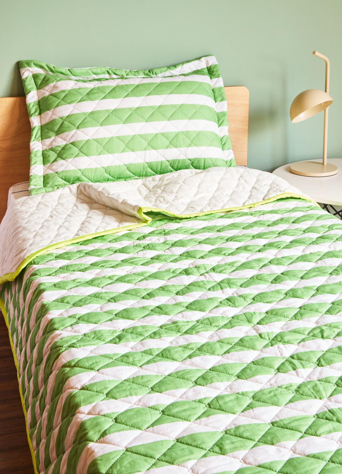O Jogo de Colcha Infantil Listrado Campo da MOOUI transforma o momento de descanso em uma experiência visual encantadora. O conjunto inclui colcha matelassada e porta travesseiro em algodão macio e estampas exclusivas que estimulam a imaginação.