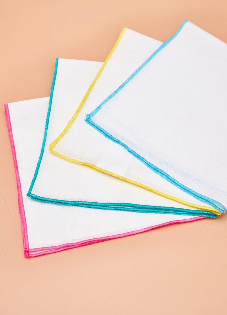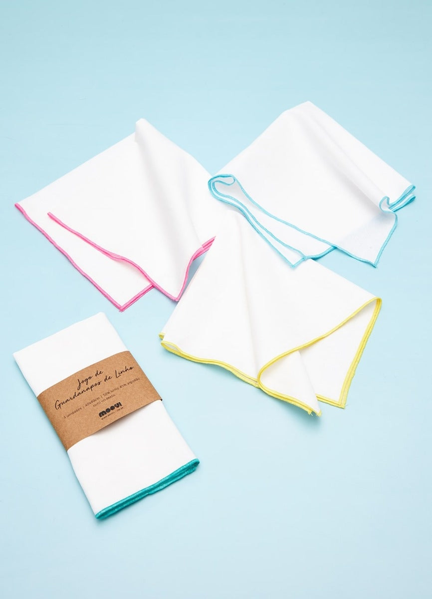O Jogo de Guardanapos de Linho Branco traz elegância do tecido com o detalhe na barra do ponto picô colorido, é daqueles itens que você tem que ter na sua casa. Além de ser lindo, é um item perfeito para deixar a mesa ainda mais alegre e cheia estilo. O jogo é composto por 4 guardanapos. Experimente combinar os guardanapos com os demais itens da hora de comer da MOOUI para montar uma mesa original, charmosa e encantadora.