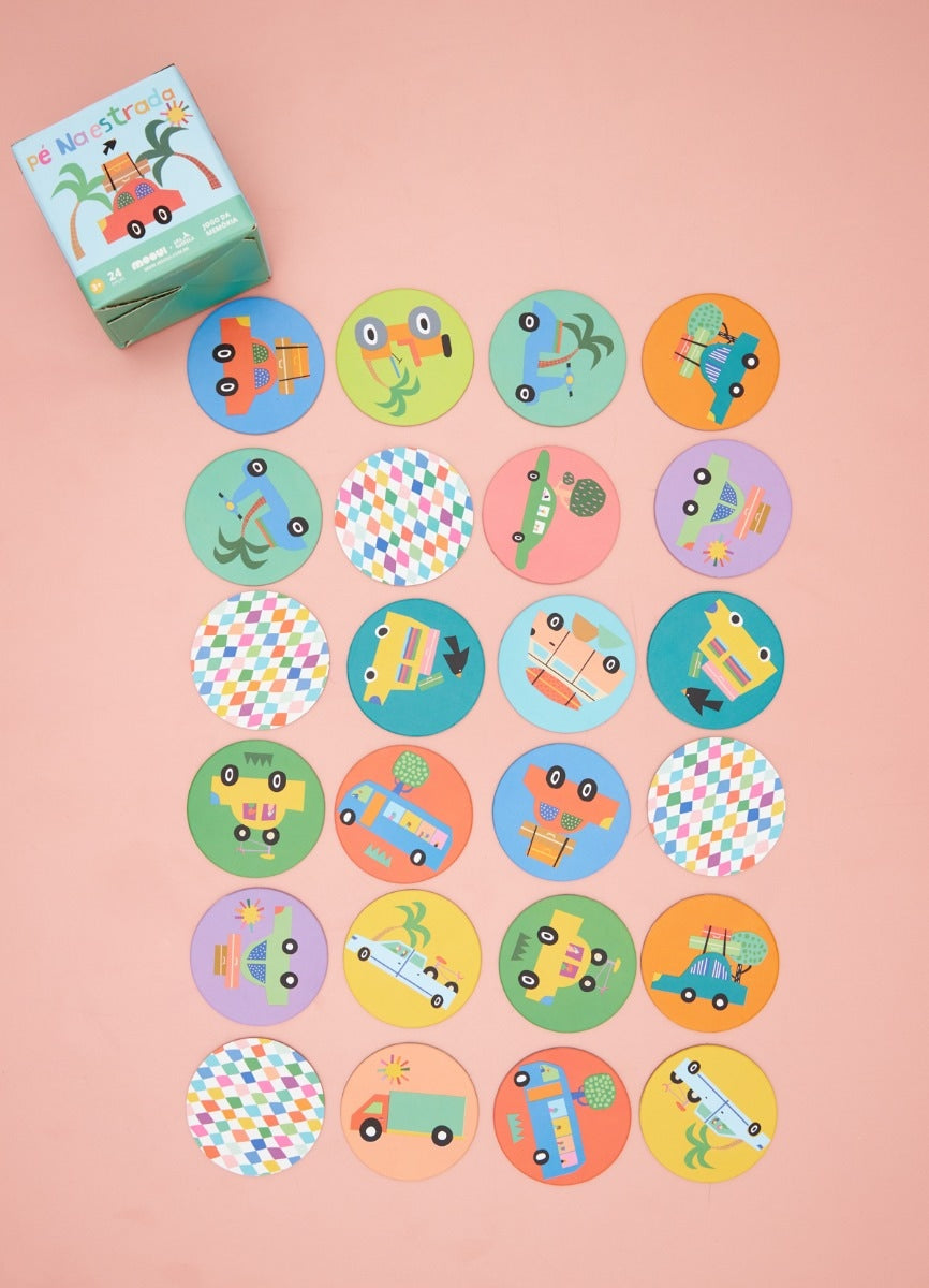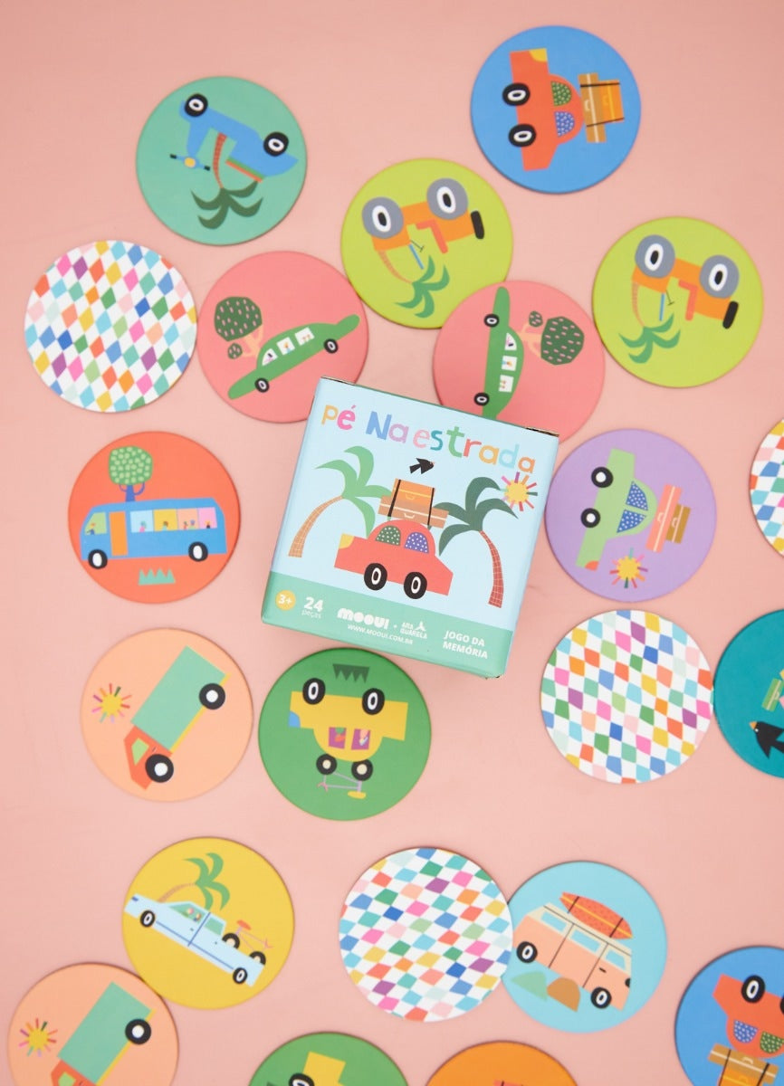 O jogo da memória Pé na Estrada da Mooui foi desenvolvido com nossas estampas exclusivas e design único. Um jogo que pode ser jogado por várias pessoas, incluindo adultos e crianças, é uma divertida forma de passar tempo de qualidade com os pequenos. Formado por 32 peças, cada imagem se repete em outra peça, formando 16 pares. Para jogar, as peças devem começar viradas para baixo e cada participante deve escolher 2 peças e vira-las para que todos os participantes as vejam. Se as peças escolhidas forem iguais, o jogador deve separa-las e tem direito a jogar novamente. Se as peças escolhidas forem diferentes, devem ser viradas para baixo novamente, sendo passada a vez ao próximo jogador. Quem tiver mais peças no final ganha o jogo. É indicado para crianças acima de 3 anos.