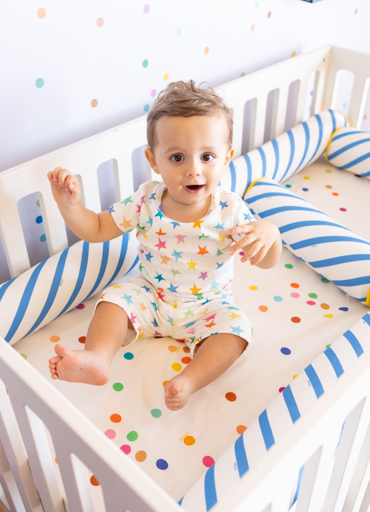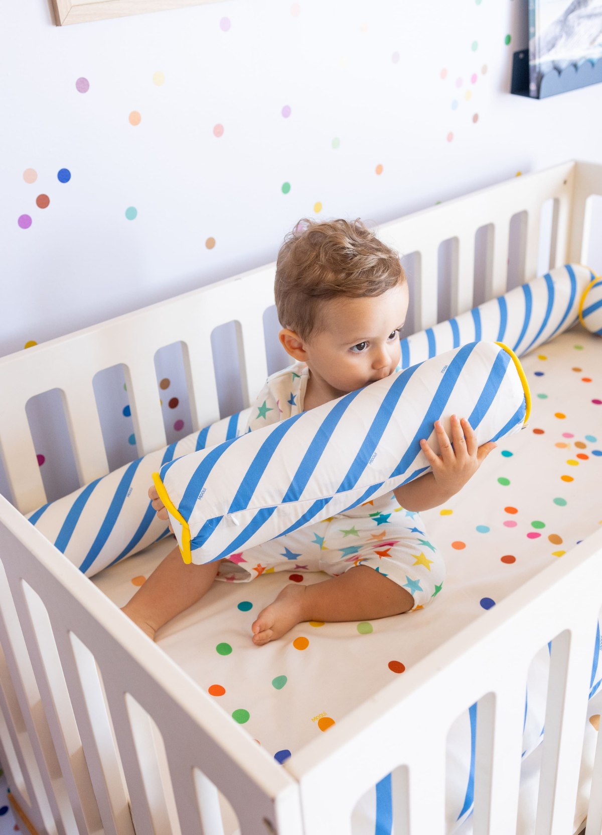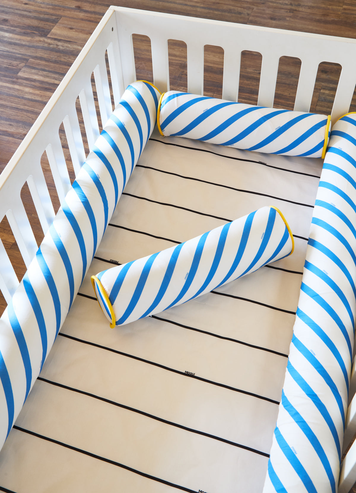 O Kit Berço Rolinho Listrado Anil da MOOUI oferece proteção completa para o berço do seu bebê. Composto por 4 rolos (2 grandes e 2 pequenos) que protegem o bebê contra impactos nas grades do berço, garantindo segurança e conforto durante o sono e momentos de descanso.