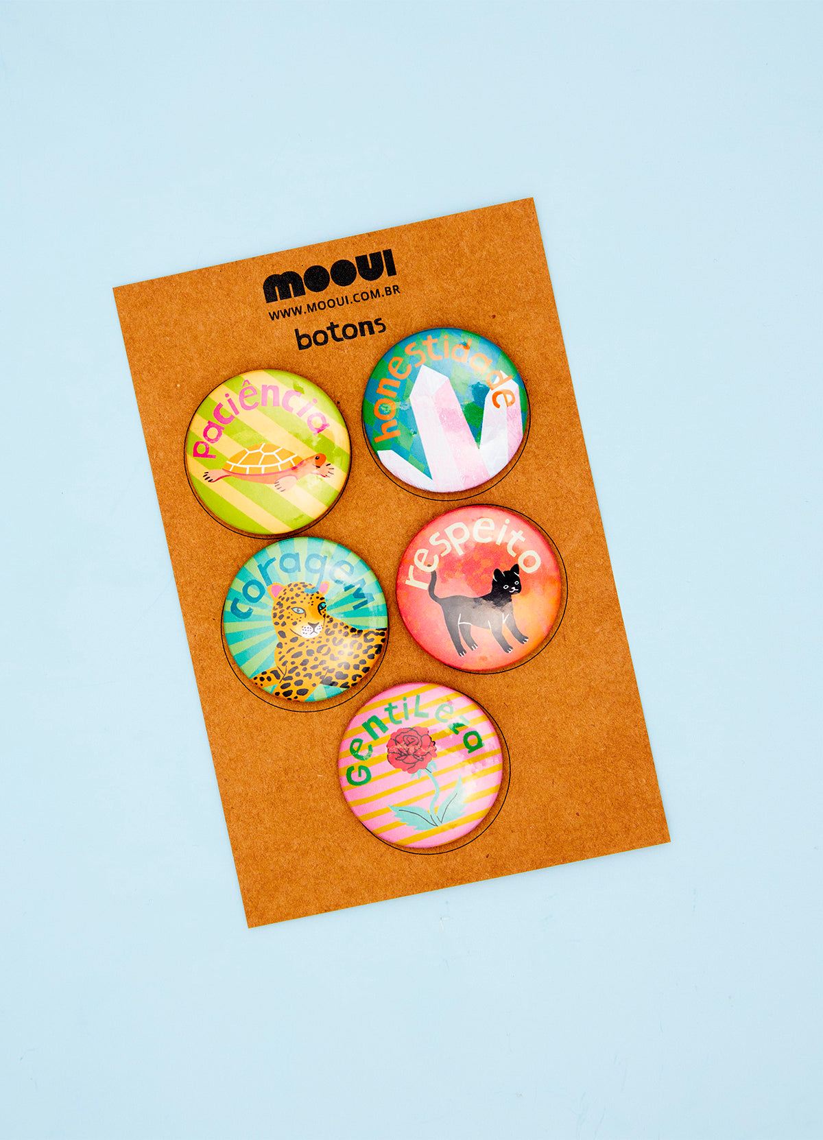 O Kit Botons Virtudes foi feito para personalizar os itens infantis. Com uma seleção de cinco desenhos especiais, os botons tem impressão de alta qualidade e fixação em alfinete. Perfeitos para serem usados em mochilas, bolsas, jaquetas, coletes e onde sua imaginação te levar.