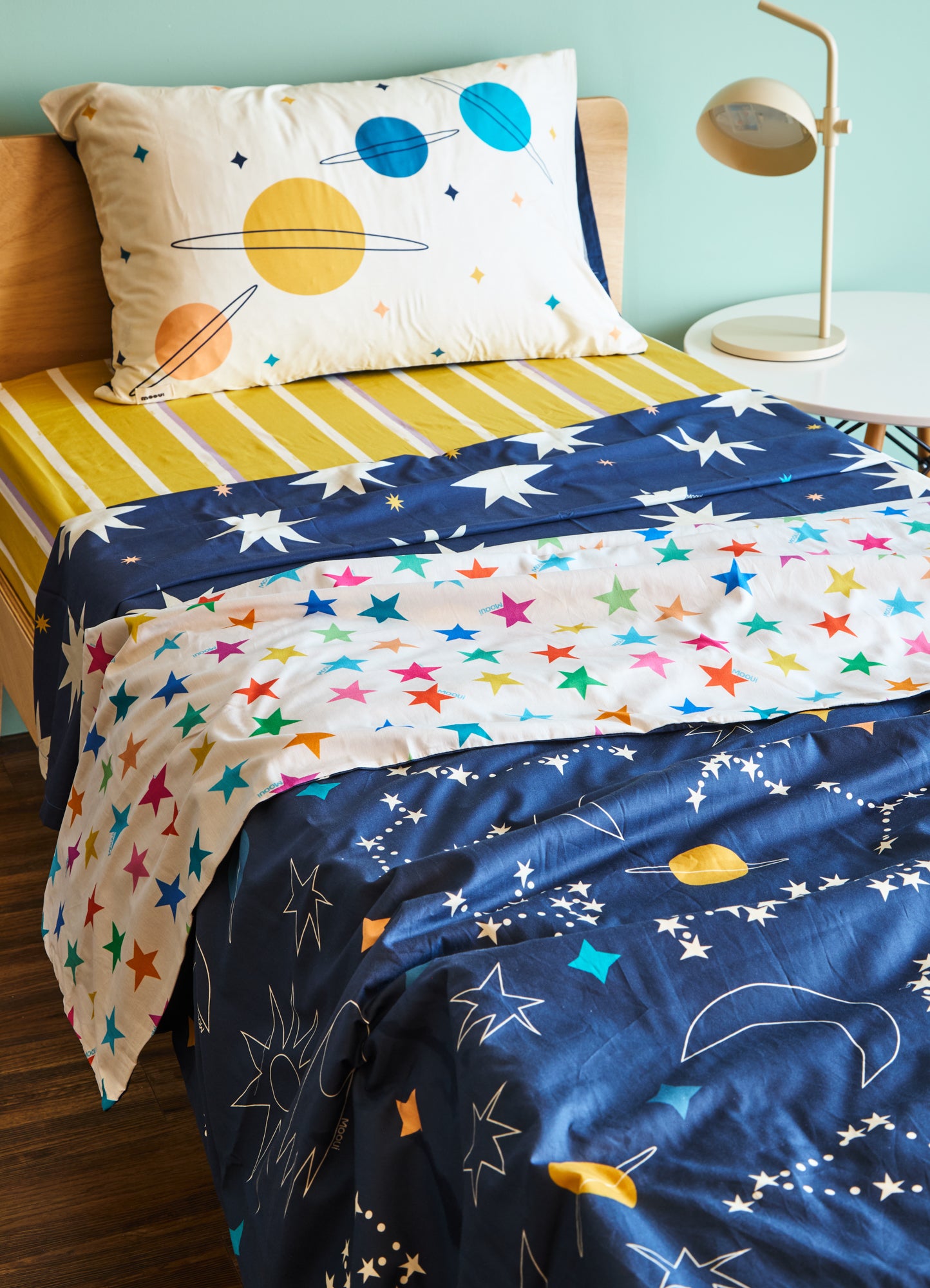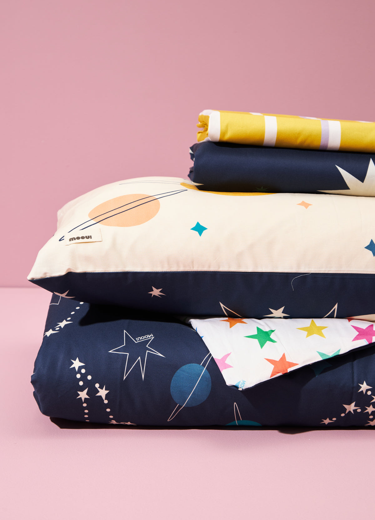 O Kit Cama Completo Solteiro Céu Estrelado da MOOUI reúne cinco peças essenciais que transformam o quarto infantil com um mix de estampas coordenadas e cheias de personalidade. Este conjunto completo proporciona praticidade aos pais e uma experiência de sono totalmente renovada para as crianças.