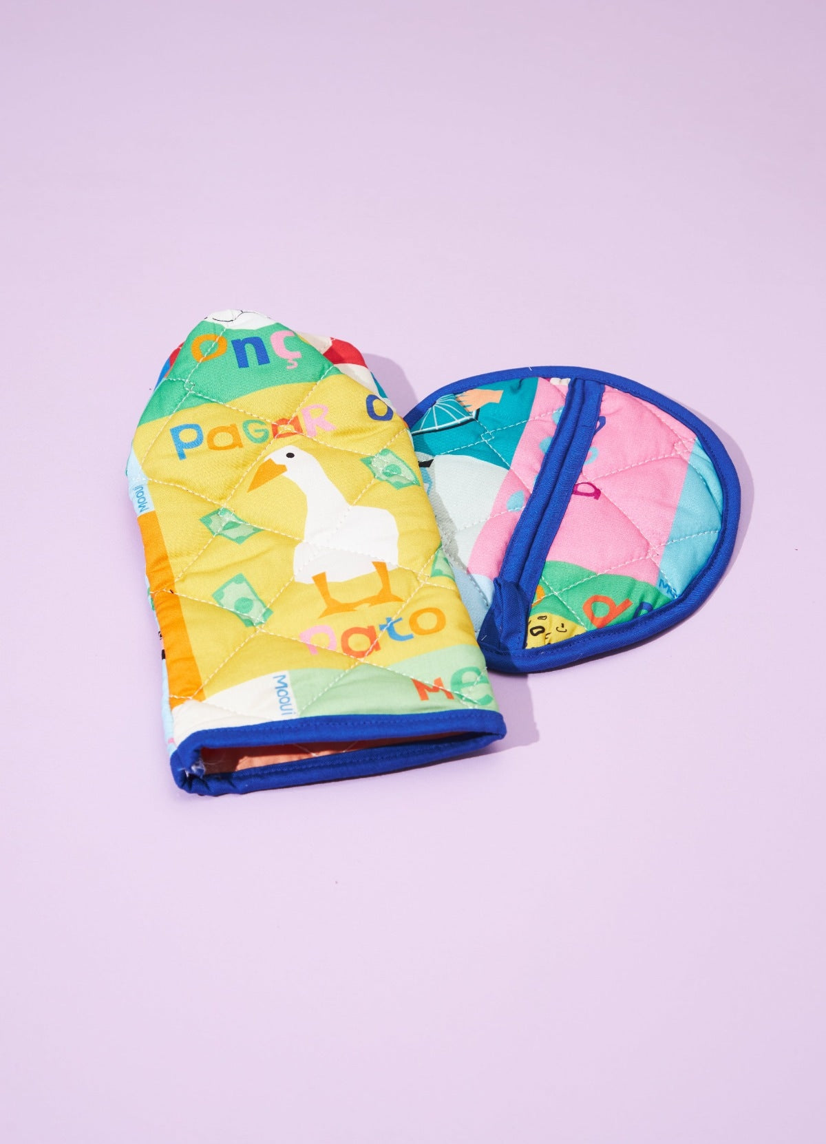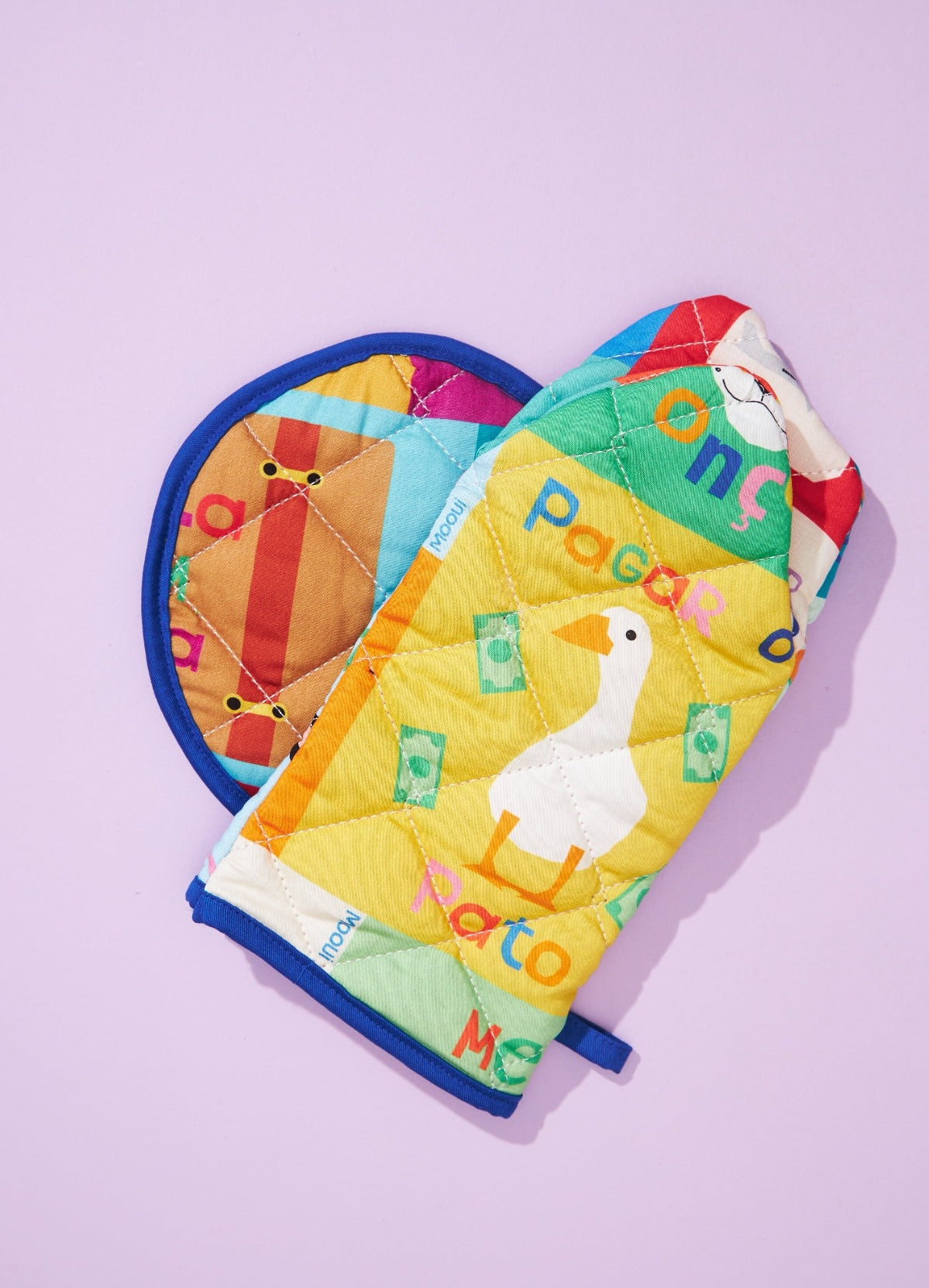 O kit Luva de Cozinha Expressões Malucas é composto por uma luva de cozinha e um descanso/pegador de panela, com estampa exclusiva Mooui.