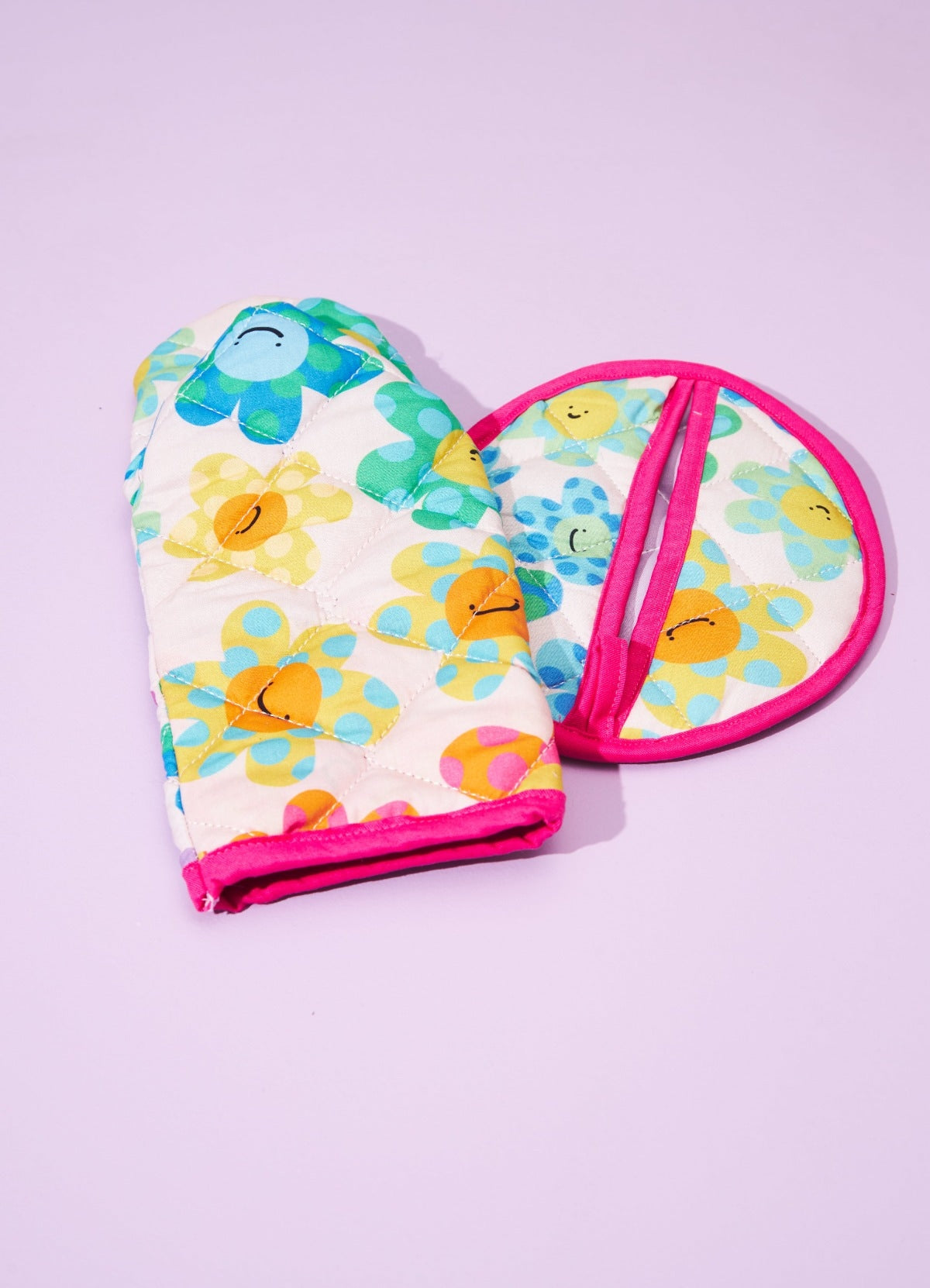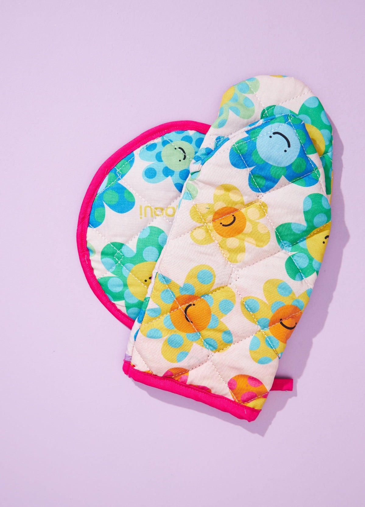 O kit Luva de Cozinha Happy Flowers é composto por uma luva de cozinha e um descanso/pegador de panela, com estampa exclusiva Mooui.